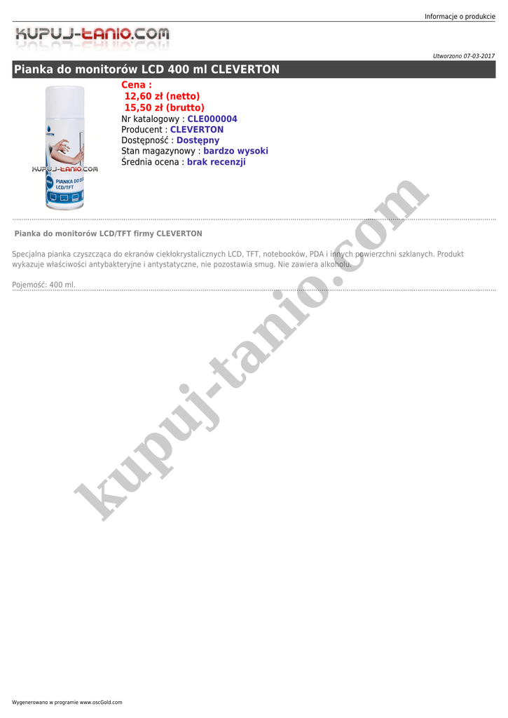 Informacje o produkcie Utworzono 07-03-2017 Pianka do monitorów LCD 400 ml CLEVERTON Cena : 12,60 zł (netto) 15,50 zł (brutto) Pianka do monitorów LCD/TFT firmy CLEVERTON io .c om Nr katalogowy : CLE000004 Producent : CLEVERTON Dostępność : Dostępny Stan magazynowy : bardzo wysoki Średnia ocena : brak recenzji Specjalna pianka czyszcząca do ekranów ciekłokrystalicznych LCD, TFT, notebooków, PDA i innych powierzchni szklanych. Produkt wykazuje właściwości antybakteryjne i antystatyczne, nie pozostawia smug. Nie zawiera alkoholu. ku p uj -t an Pojemość: 400 ml. Wygenerowano w programie www.oscGold.com