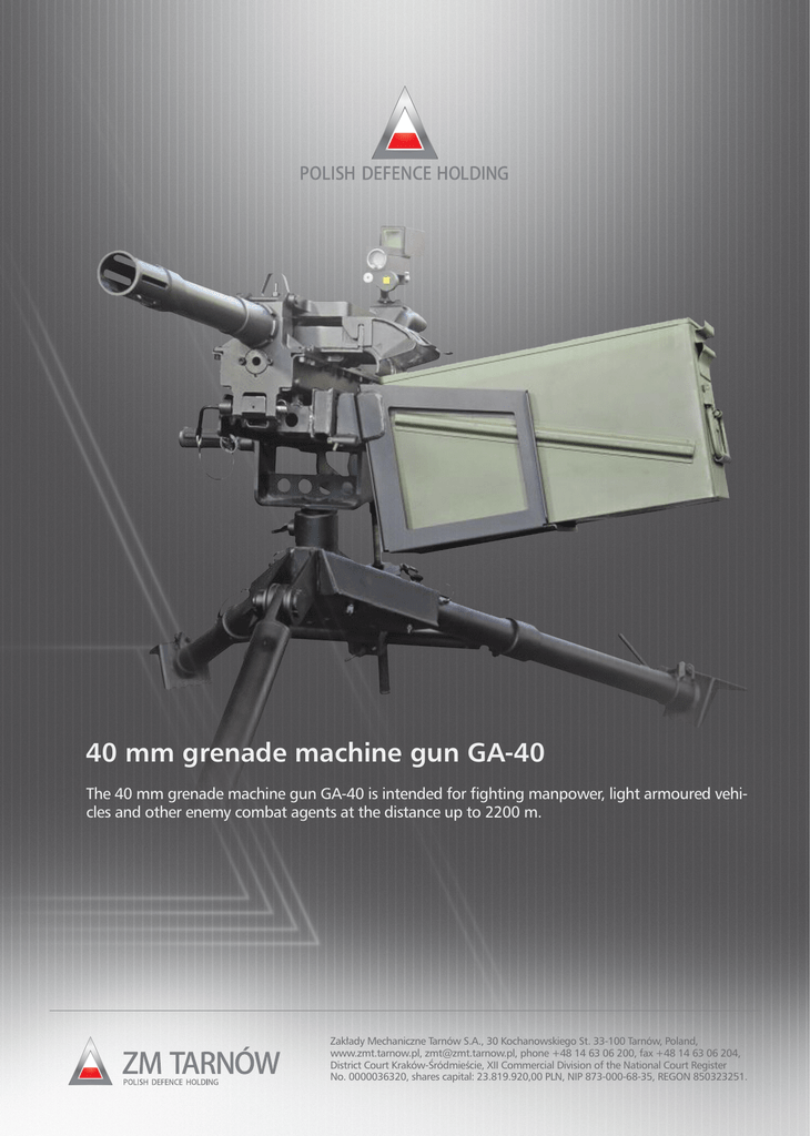 40 mm grenade machine gun GA-40 The 40 mm grenade machine gun GA-40 is intended for fighting manpower, light armoured vehicles and other enemy combat agents at the distance up to 2200 m. Zakłady Mechaniczne Tarnów S.A., 30 Kochanowskiego St. 33-100 Tarnów, Poland, www.zmt.tarnow.pl, [email protected], phone +48 14 63 06 200, fax +48 14 63 06 204, District Court Kraków-Śródmieście, XII Commercial Division of the National Court Register No. 0000036320, shares capital: 23.819.920,00 PLN, NIP 873-000-68-35, REGON 850323251. Main characteristics: – user-friendly weapon – low weight – high rate of fire – high efficiency – weapon can be mounted on vehicles, vessels and helicopters. The 40 mm grenade machine gun GA-40 is fed by 40 x 53 mm ammunition of NATO standard. It can be mounted on tripod mount as well as on vehicles, vessels and helicopters using suitable mounts. It is equipped with mechanical and optical sights. Technical data: Calibre (mm) 40 Cartridge (mm) 40 x 53 Weapon length (mm) 1040 Barrel length (mm) 420 Weight (kg) 34 Effective range (m) 2200 Operating principle automatic Zakłady Mechaniczne Tarnów S.A., 30 Kochanowskiego St. 33-100 Tarnów, Poland, www.zmt.tarnow.pl, [email protected], phone +48 14 63 06 200, fax +48 14 63 06 204, District Court Kraków-Śródmieście, XII Commercial Division of the National Court Register No. 0000036320, shares capital: 23.819.920,00 PLN, NIP 873-000-68-35, REGON 850323251.