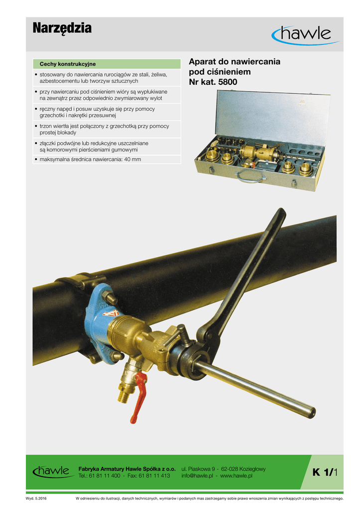 Narzędzia Aparat do nawiercania pod ciśnieniem Nr kat. 5800 Cechy konstrukcyjne • stosowany do nawiercania rurociągów ze stali, żeliwa, azbestocementu lub tworzyw sztucznych • przy nawiercaniu pod ciśnieniem wióry są wypłukiwane na zewnątrz przez odpowiednio zwymiarowany wylot • ręczny napęd i posuw uzyskuje się przy pomocy grzechotki i nakrętki przesuwnej • trzon wiertła jest połączony z grzechotką przy pomocy prostej blokady • złączki podwójne lub redukcyjne uszczelniane są komorowymi pierścieniami gumowymi • maksymalna średnica nawiercania: 40 mm Fabryka Armatury Hawle Spółka z o.o. Tel.: 61 81 11 400 - Fax: 61 81 11 413 Wyd. 5.2016 ul. Piaskowa 9 - 62-028 Koziegłowy [email protected] - www.hawle.pl K 1/1 W odniesieniu do ilustracji, danych technicznych, wymiarów i podanych mas zastrzegamy sobie prawo wnoszenia zmian wynikających z postępu technicznego. Narzędzia 360 Asortyment Nr kat. 5820 Nr kat. 5810 Nr kat. 5830 Nr kat. 5840 Przyrząd do nawiercania Skrzynka Grzechotka Trzon wiertła 1 2 Wiertło kręte do rur stalowych, żeliwnych, azbestocementowych Nr kat. 5850 Nr kat. 5860 Nr kat. 5890 Nr kat. 5900 Nr kat. 5910 Nr kat. 5920 Nr kat. 8401 Nr kat. 5800 Wiertło kręte 1" - Ø 24 Wiertło kręte 1¼" - Ø 29 Wiertło kręte 1½" - Ø 35 Wiertło kręte 2" - Ø 40 Frez do nawiercania rur PVC Frez do nawiercania 1"- Ø 24 Frez do nawiercania 1¼"- Ø 29 Frez do nawiercania 1½"- Ø 35 Frez do nawiercania 2"- Ø 40 Dwuzłączka z uszczelką gumową 2" - 1" 2" - 1¼" 2" - 1½" 2" - 2½" Dwuzłączka redukcyjna z uszczelką gumową 2" - 2" Klucz do gniazda sześciokąt. SW5 – 1 szt. Klucz hakowy – 2 szt. Pilot odcinający 1" - 1¼" 1½" - 2" Komplet w skrzynce Masa 17,5 kg 5 3 4 6 7 9 8 10 11 12 1. grzechotka 2. bolec blokujący 3. nakrętka przesuwna 4. czerwone oznakowanie 5. trzon wiertła 6. prowadnica 7. uszczelka typu O-ring 8. uszczelka gumowa 9. wylot z płukania 10. złączka redukcyjna lub podwójna 11. złączka sześciokątna 12. wiertło Alternatywa do wiertła krętego nr 5850 Frez do nawiercania do rur stalowych i żeliwnych Nr kat. 5870 Frez do nawiercania Frez do nawiercania Frez do nawiercania Frez do nawiercania 1"- Ø 24 1¼"- Ø 29 1½"- Ø 35 2"- Ø 40 Nr kat. 5860 Frez do nawiercania do rur PVC Nr kat. 5870 Frez do nawiercania do rur stalowych i żeliwnych Nr kat. 5940 Złączka redukcyjna 2"- 1½" do kombinacyjnej zasuwy do nawiercania ISO Opis produktu (prospekt na zapytanie) • aparaty do nawiercania Tonisco są odpowiednie dla otworów do 90 mm TONISCO – aparat do nawiercania Nr kat. 5807 • uwaga: zagrożenie – 220V należy bezwzględnie przestrzegać odpowiednich przepisów bezpieczeństwa • większe średnice nawiercania (na zapytanie) K 1/2 Fabryka Armatury Hawle Spółka z o.o. ul. Piaskowa 9 - 62-028 Koziegłowy Tel.: 61 81 11 400 - Fax: 61 81 11 413 [email protected] - www.hawle.pl W odniesieniu do ilustracji, danych technicznych, wymiarów i podanych mas zastrzegamy sobie prawo wnoszenia zmian wynikających z postępu technicznego. Wyd. 5.2016