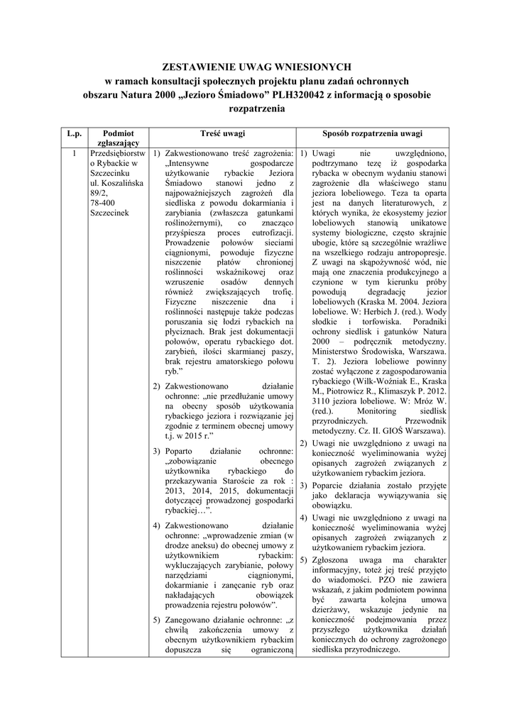 ZESTAWIENIE UWAG WNIESIONYCH w ramach konsultacji społecznych projektu planu zadań ochronnych obszaru Natura 2000 „Jezioro Śmiadowo” PLH320042 z informacją o sposobie rozpatrzenia L.p. 1 Podmiot Treść uwagi Sposób rozpatrzenia uwagi zgłaszający nie uwzględniono, Przedsiębiorstw 1) Zakwestionowano treść zagrożenia: 1) Uwagi podtrzymano tezę iż gospodarka o Rybackie w „Intensywne gospodarcze Szczecinku użytkowanie rybackie Jeziora rybacka w obecnym wydaniu stanowi Śmiadowo stanowi jedno z ul. Koszalińska zagrożenie dla właściwego stanu 89/2, najpoważniejszych zagrożeń dla jeziora lobeliowego. Teza ta oparta 78-400 siedliska z powodu dokarmiania i jest na danych literaturowych, z Szczecinek zarybiania (zwłaszcza gatunkami których wynika, że ekosystemy jezior roślinożernymi), co znacząco lobeliowych stanowią unikatowe przyśpiesza proces eutrofizacji. systemy biologiczne, często skrajnie Prowadzenie połowów sieciami ubogie, które są szczególnie wrażliwe ciągnionymi, powoduje fizyczne na wszelkiego rodzaju antropopresje. niszczenie płatów chronionej Z uwagi na skąpożywność wód, nie roślinności wskaźnikowej oraz mają one znaczenia produkcyjnego a czynione w tym kierunku próby wzruszenie osadów dennych powodują degradację jezior również zwiększających trofię. Fizyczne niszczenie dna i lobeliowych (Kraska M. 2004. Jeziora roślinności następuje także podczas lobeliowe. W: Herbich J. (red.). Wody poruszania się łodzi rybackich na słodkie i torfowiska. Poradniki płyciznach. Brak jest dokumentacji ochrony siedlisk i gatunków Natura połowów, operatu rybackiego dot. 2000 – podręcznik metodyczny. zarybień, ilości skarmianej paszy, Ministerstwo Środowiska, Warszawa. brak rejestru amatorskiego połowu T. 2). Jeziora lobeliowe powinny ryb.” zostać wyłączone z zagospodarowania rybackiego (Wilk-Woźniak E., Kraska 2) Zakwestionowano działanie M., Piotrowicz R., Klimaszyk P. 2012. ochronne: „nie przedłużanie umowy 3110 jeziora lobeliowe. W: Mróz W. na obecny sposób użytkowania (red.). Monitoring siedlisk rybackiego jeziora i rozwiązanie jej przyrodniczych. Przewodnik zgodnie z terminem obecnej umowy metodyczny. Cz. II. GIOŚ Warszawa). t.j. w 2015 r.” 2) Uwagi nie uwzględniono z uwagi na 3) Poparto działanie ochronne: konieczność wyeliminowania wyżej „zobowiązanie obecnego opisanych zagrożeń związanych z użytkownika rybackiego do użytkowaniem rybackim jeziora. przekazywania Staroście za rok : 3) Poparcie działania zostało przyjęte 2013, 2014, 2015, dokumentacji jako deklaracja wywiązywania się dotyczącej prowadzonej gospodarki obowiązku. rybackiej…”. 4) Uwagi nie uwzględniono z uwagi na 4) Zakwestionowano działanie konieczność wyeliminowania wyżej ochronne: „wprowadzenie zmian (w opisanych zagrożeń związanych z drodze aneksu) do obecnej umowy z użytkowaniem rybackim jeziora. użytkownikiem rybackim: 5) Zgłoszona uwaga ma charakter wykluczających zarybianie, połowy informacyjny, toteż jej treść przyjęto narzędziami ciągnionymi, do wiadomości. PZO nie zawiera dokarmianie i zanęcanie ryb oraz wskazań, z jakim podmiotem powinna nakładających obowiązek być zawarta kolejna umowa prowadzenia rejestru połowów”. dzierżawy, wskazuje jedynie na konieczność podejmowania przez 5) Zanegowano działanie ochronne: „z przyszłego użytkownika działań chwilą zakończenia umowy z koniecznych do ochrony zagrożonego obecnym użytkownikiem rybackim siedliska przyrodniczego. dopuszcza się ograniczoną L.p. Podmiot zgłaszający Treść uwagi Sposób rozpatrzenia uwagi eksploatację rybacką, wyłącznie 6) Informacja o braku wskazanych jako amatorski połów ryb czyli dokumentów została umieszczona w wędkowanie a kolejna umowa z dokumentacji z uwagi brak operatorem na użytkowanie jeziora możliwości ich otrzymania pomimo winna uwzględniać wyniki podejmowanych prób. W rozmowie założonego monitoringu stanu telefonicznej przedstawiciel siedliska i wszystkie aspekty Przedsiębiorstwa odmówił ochrony jeziora lobeliowego”. udostępnienia takich danych, a prośba Zdaniem zgłaszającego uwagę, autorów PZO o udostępnienie danych, kolejna umowa nie może być wysłana drogą mailową pozostała bez zawarta z nowym użytkownikiem, odpowiedzi. Przedstawiciele ponieważ to obecny użytkownik ma Przedsiębiorstwa nie brali udziału w pierwszeństwo na przedłużenie zebraniach interesariuszy i w toku starej umowy, a eksploatacja ryb opracowywania PZO, nie zgłaszali żadnych uwag. tylko przez wędkarzy mocno zniszczy ten cenny ekosystem”. 6) Zgłaszający uwagę nie rozumiał informacji o braku operatu rybackiego i rejestru połowów, dokarmiania, zarybianiu, twierdząc, że prawni użytkownicy „muszą takie rzeczy prowadzić”. 2 Zbigniew Krzemińskimieszkaniec Śmiadowa 1) Zgłoszenie braku adnotacji o 1) Uwagę uwzględniono, pierwotny konieczności wyremontowania 1,5 zapis zmieniono na następujący: km odcinka drogi nr 20, tzn. „Utrzymywanie nawierzchni drogi wymiany kostki brukowej na asfalt, krajowej nr 20 w dobrym stanie co w rezultacie w bardzo dużym technicznym, eliminującym wstrząsy stopniu zmniejszy hałas i ochroni pojazdów i tym samym ryzyko ich czynnie siedliska ptaków i zwierząt. awarii oraz wycieków płynów technicznych”. Jednocześnie wyjaśnia 2) Zgłoszenie wniosku o dodanie się, że w obszarze Natura 2000 wpisu, że obowiązek podłączenia do Jezioro Śmiadowo PLH320042, ptaki kanalizacji zbiorczej po jej i inne zwierzęta nie są przedmiotami wybudowaniu nie będzie dotyczył ochrony, toteż nie może być w PZO biologicznych, nowoczesnych używany argument ochrony tych oczyszczalni ścieków. gatunków przed hałasem. 2) Uwagę uwzględniono poprzez zmianę treści działania na następującą: „Wybudowanie kanalizacji ściekowej obejmującej dotychczas nie skanalizowaną część miejscowości Śmiadowo i obowiązkowe po