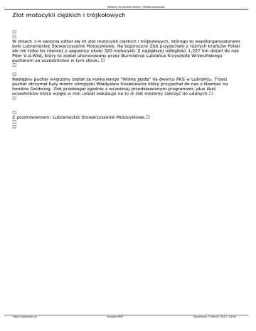 Witamy na stronie Gminy i Miasta Lubraniec Zlot motocykli ciężkich i trójkołowych W dniach 1-4 sierpnia odbył się VI zlot motocykli ciężkich i trójkołowych, którego to współorganizatorami było Lubranieckie Stowarzyszenie Motocyklowe. Na tegoroczny Zlot przyjechało z różnych krańców Polski ale nie tylko bo również z zagranicy około 320 motocykli. Z najdalszej odległości 1,227 km dotarł do nas Piter V.d.Wild, który to został uhonorowany przez Burmistrza Lubrańca Krzysztofa Wrzesińskiego pucharem za uczestnictwo w tym zlocie. Następny puchar wręczony został za konkurencje "Wolna jazda" na dworcu PKS w Lubrańcu. Trzeci puchar otrzymał były mistrz olimpijski Władysław Kozakiewicz który przyjechał do nas z Niemiec na hondzie Goldwing. Zlot przebiegał zgodnie z wcześniej przedstawionym programem, plus ilość uczestników która wzięła w nim udział wskazuje na to iż zlot możemy zaliczyć do udanych. Z pozdrowieniem: Lubranieckie Stowarzyszenie Motocyklowe. http://lubraniec.pl Kreator PDF Utworzono 7 March, 2017, 13:01
