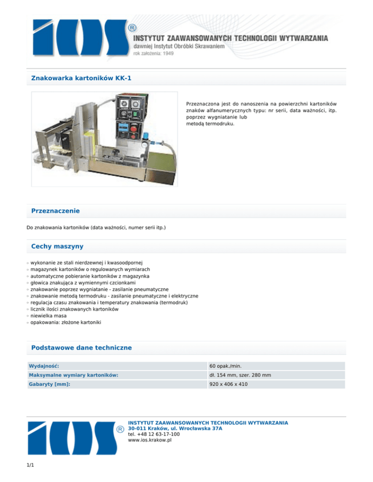Znakowarka kartoników KK-1 Przeznaczona jest do nanoszenia na powierzchni kartoników znaków alfanumerycznych typu: nr serii, data ważności, itp. poprzez wygniatanie lub metodą termodruku. Przeznaczenie Do znakowania kartoników (data ważności, numer serii itp.) Cechy maszyny ❍ ❍ ❍ ❍ ❍ ❍ ❍ ❍ ❍ ❍ wykonanie ze stali nierdzewnej i kwasoodpornej magazynek kartoników o regulowanych wymiarach automatyczne pobieranie kartoników z magazynka głowica znakująca z wymiennymi czcionkami znakowanie poprzez wygniatanie - zasilanie pneumatyczne znakowanie metodą termodruku - zasilanie pneumatyczne i elektryczne regulacja czasu znakowania i temperatury znakowania (termodruk) licznik ilości znakowanych kartoników niewielka masa opakowania: złożone kartoniki Podstawowe dane techniczne Wydajność: 60 opak./min. Maksymalne wymiary kartoników: dł. 154 mm, szer. 280 mm Gabaryty [mm]: 920 x 406 x 410 INSTYTUT ZAAWANSOWANYCH TECHNOLOGII WYTWARZANIA 30-011 Kraków, ul. Wrocławska 37A tel. +48 12 63-17-100 www.ios.krakow.pl 1/1