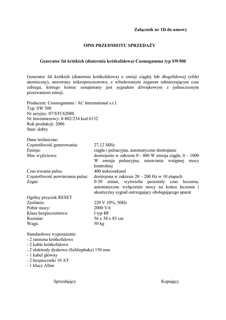 Załącznik nr 1D do umowy OPIS PRZEDMIOTU SPRZEDAŻY Generator fal krótkich (diatermia krótkofalowa) Cosmogamma typ SW500 Generator fal krótkich (diatermia krótkofalowa) o emisji ciągłej lub długofalowej (efekt atermiczny), sterowany mikroprocesorowo, z wbudowanym zegarem odmierzającym czas zabiegu, którego koniec oznajmiany jest sygnałem dźwiękowym z jednoczesnym przerwaniem emisji. Producent: Cosmogamma / AC International s.r.l. Typ: SW 500 Nr seryjny: 07/STC62080 Nr inwentarzowy: 8-802/234 kod 6132 Rok produkcji: 2006 Stan: dobry Dane techniczne: Częstotliwość generowania: Emisja: Moc wyjściowa: Czas trwania pulsu: Częstotliwość powtarzania pulsu: Zegar: Ogólny przycisk RESET Zasilanie: Pobór mocy: Klasa bezpieczeństwa: Rozmiar: Waga: 27,12 MHz ciągła i pulsacyjna, automatyczne dostrajanie dostrojenie w zakresie 0 - 400 W emisja ciągła, 0 – 1000 W emisja pulsacyjna, ustawianie wstępnej mocy kontrolnej 400 mikrosekund dostrojona w zakresie 20 – 200 Hz w 10 etapach 0-30 minut, wyświetla pozostały czas leczenia, automatyczne wyłączenie mocy na końcu leczenia i akustyczny sygnał ostrzegający obsługującego aparat 220 V 10%, 50Hz 2000 VA I typ BF 56 x 38 x 83 cm 50 kg Standardowe wyposażenie: - 2 ramiona krótkofalowe - 2 kable krótkofalowe - 2 elektrody dyskowe (Schliephake) 150 mm - 1 kabel główny - 2 bezpieczniki 10 AT - 1 klucz Allan Sprzedający Kupujący