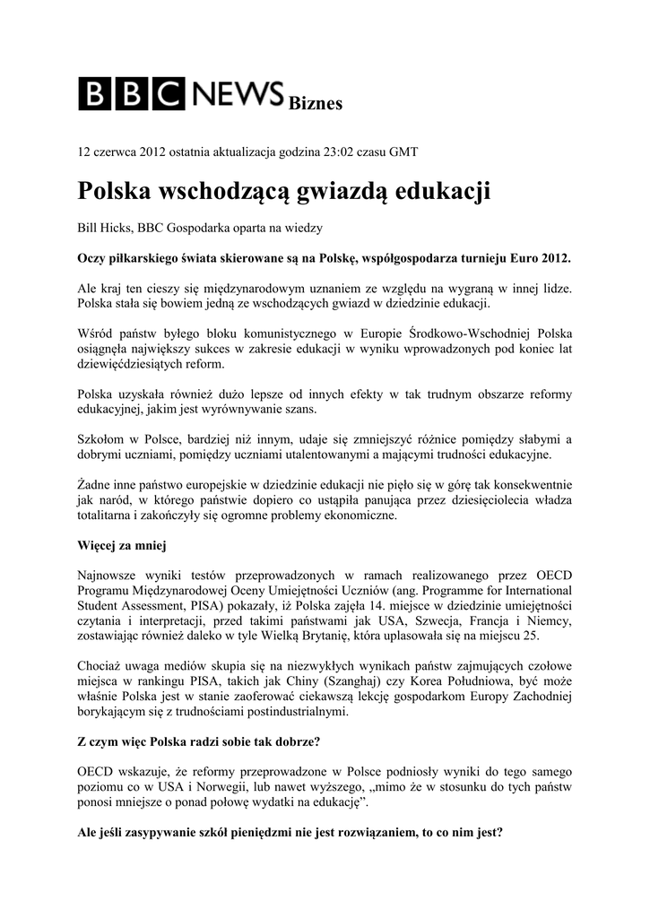 Biznes 12 czerwca 2012 ostatnia aktualizacja godzina 23:02 czasu GMT Polska wschodzącą gwiazdą edukacji Bill Hicks, BBC Gospodarka oparta na wiedzy Oczy piłkarskiego świata skierowane są na Polskę, współgospodarza turnieju Euro 2012. Ale kraj ten cieszy się międzynarodowym uznaniem ze względu na wygraną w innej lidze. Polska stała się bowiem jedną ze wschodzących gwiazd w dziedzinie edukacji. Wśród państw byłego bloku komunistycznego w Europie Środkowo-Wschodniej Polska osiągnęła największy sukces w zakresie edukacji w wyniku wprowadzonych pod koniec lat dziewięćdziesiątych reform. Polska uzyskała również dużo lepsze od innych efekty w tak trudnym obszarze reformy edukacyjnej, jakim jest wyrównywanie szans. Szkołom w Polsce, bardziej niż innym, udaje się zmniejszyć różnice pomiędzy słabymi a dobrymi uczniami, pomiędzy uczniami utalentowanymi a mającymi trudności edukacyjne. Żadne inne państwo europejskie w dziedzinie edukacji nie pięło się w górę tak konsekwentnie jak naród, w którego państwie dopiero co ustąpiła panująca przez dziesięciolecia władza totalitarna i zakończyły się ogromne problemy ekonomiczne. Więcej za mniej Najnowsze wyniki testów przeprowadzonych w ramach realizowanego przez OECD Programu Międzynarodowej Oceny Umiejętności Uczniów (ang. Programme for International Student Assessment, PISA) pokazały, iż Polska zajęła 14. miejsce w dziedzinie umiejętności czytania i interpretacji, przed takimi państwami jak USA, Szwecja, Francja i Niemcy, zostawiając również daleko w tyle Wielką Brytanię, która uplasowała się na miejscu 25. Chociaż uwaga mediów skupia się na niezwykłych wynikach państw zajmujących czołowe miejsca w rankingu PISA, takich jak Chiny (Szanghaj) czy Korea Południowa, być może właśnie Polska jest w stanie zaoferować ciekawszą lekcję gospodarkom Europy Zachodniej borykającym się z trudnościami postindustrialnymi. Z czym więc Polska radzi sobie tak dobrze? OECD wskazuje, że reformy przeprowadzone w Polsce podniosły wyniki do tego samego poziomu co w USA i Norwegii, lub nawet wyższego, „mimo że w stosunku do tych państw ponosi mniejsze o ponad połowę wydatki na edukację”. Ale jeśli zasypywanie szkół pieniędzmi nie jest rozwiązaniem, to co nim jest? Dr Michał Federowicz, dyrektor Instytutu Badań Edukacyjnych w Warszawie, bada podstawy sukcesu od mrocznych czasów stanu wojennego wprowadzonego po zakończeniu tzw. „karnawału Solidarności” w roku 1981, kiedy to, jak ujął, „zduszono ludzi wykształconych”. Twierdzi on, że przez większość część lat 80. Polska odwracała się od edukacji - tak więc w momencie, gdy w końcu w roku 1990 roku przywrócono w kraju demokrację, oswobodzono jednocześnie masowy apetyt na zmiany w życiu gospodarczym i kulturalnym. To wkrótce przełożyło się na zapotrzebowanie na lepszą edukację. Sowieckie programy nauczania Pierwsze reformy wprowadzane na początku lat 90. skoncentrowały się na usunięciu treści ideologicznych z wzorowanych na sowieckich programów nauczania. Ale głębsze zmiany strukturalne zaakceptowano dopiero, wprowadzając ustawę o oświacie w roku 1999. Ustawa ta wprowadzała radykalne zmiany. Szkołę podstawową w Polsce skrócono z ośmiu do sześciu lat, wprowadzając jednocześnie nowe trzyletnie gimnazja, dla uczniów w wielu 13-16 lat. Dało to wszystkim uczniom tak istotny, dodatkowy rok przed podjęciem decyzji o wyborze dalszej ścieżki edukacyjnej lub kształcenia zawodowego. „Wolą polityczną było osiągnięcie znaczących zmian w jakości edukacji i innych sfer usług publicznych”, mówi dr Federowicz. „Jednakże zmiany te nie były możliwe bez całościowych reform struktury samego samorządu, dzięki czemu osiągnięto większy poziom lokalnej autonomii.” Były wiceminister edukacji i szkolnictwa wyższego w Polsce, profesor Zbigniew Marciniak, wskazuje na czynniki spoza nakazów politycznych i gospodarczych. „Stoi za tym duch ludzi. Wysiłek, jaki rodzice i rodziny włożyły w kształcenie dzieci w szkole.... Społeczeństwo zrobiło to za nas, my tylko stworzyliśmy odpowiednie ku temu warunki." Mimo, że tak istotne było zdecentralizowanie procesu decyzyjnego, konieczna była rządowa interwencja na uboższych obszarach wiejskich, a także przy tworzeniu jednolitych w całym kraju egzaminów i szkoleniu nauczycieli. „Skala problemu” Polska korzysta z badania PISA od roku 2000 w celu podniesienia swojej pozycji. „Wiedzieliśmy o naszych problemach - ale pierwsze badanie PISA pokazało nam ich skalę”, mówi profesor Marciniak. Pomogło ono ujawnić jedno z największych niepowodzeń starego systemu – „Syndrom Ósmej Klasy”, w wyniku którego połowa populacji szkolnej rezygnowała z nauki akademickiej w wieku 15 lat. „Badanie PISA wykazało, że ogromna liczba tych dzieciaków zapominała to wszystko, czego nauczyła się w szkole podstawowej... A najbardziej dramatyczny był fakt, że nie mogły dalej się uczyć”. Kolejna runda badań PISA wykonana w 2003 roku zbiegła się z ukończeniem przez pierwszy rocznik trzyletniego cyklu gimnazjalnego. „Uzyskaliśmy ogromną poprawę” dodaje profesor Marciniak. „Nie przeceniając sytuacji, zaczynaliśmy od bardzo niskiego poziomu, jednak decyzja o wymieszaniu słabszych dzieci z pozostałymi, i umożliwienie im kontynuowania ogólnej nauki zaczęło działać, a efekty były zaskakujące. Ale bardzo dla nas pozytywne”. Słabsi uczniowie radzili sobie lepiej, podobnie jak i ci lepsi. Egzaminy pod lupą Zmiana szkoły w wieku 12–13 lat dała również dzieciom szansę na nowy początek, ucieczkę od piętna wcześniejszych niepowodzeń. Stworzenie 7000 nowych gimnazjów przyczyniło się również do podniesienia poziomu przygotowania samych nauczycieli. „Nauczyciele włożyli ogromny wysiłek, aby pokazać, że są odpowiednio przygotowani do nauczania w tych szko