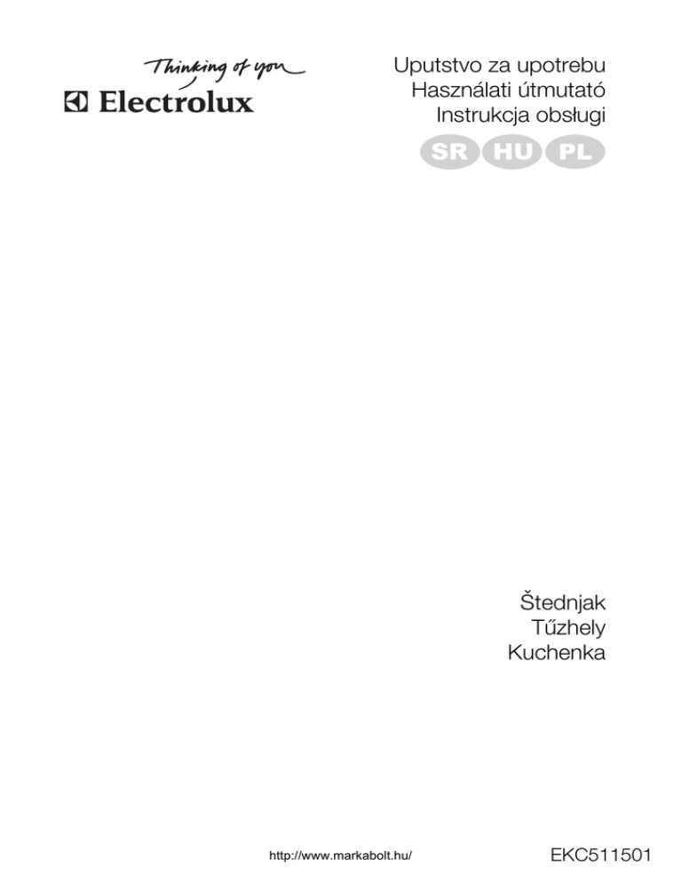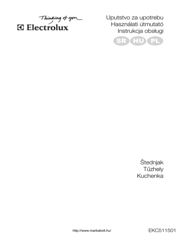 Uputstvo za upotrebu Használati útmutató Instrukcja obsługi SR HU PL Štednjak Tűzhely Kuchenka http://www.markabolt.hu/ EKC511501 2 electrolux Sadržaj Važne informacije o bezbednosti Instaliranje Bezbednost dece U toku upotrebe Opis proizvoda Opis uređaja Komandna tabla Upotreba uređaja Pre prve upotrebe Dnevna upotreba Termostat pećnice Upotreba pećnice Pečenje Donji element pećnice Pečenje i kuvanje sa ventilatorom Gril Tabela Za Kuvanje Tabela Za Pečenje Tabela Za Pečenje Na Grilu Zone za kuvanje Pribor isporučen sa uređajem Održavanje i čišćenje Zamena sijalice u pećnici Šta treba učiniti ukoliko 3 3 3 3 4 4 5 5 5 5 6 6 6 7 7 7 9 10 10 10 11 12 15 15 Tehnički podaci Instaliranje Mesto postavljanja Nivelisanje Priključci na struju Uslovi garancije Postprodajni servis Kako da čitate knjigu uputstava Simboli ispod će vam pomoći u čitanju ove knjige uputstava Sigurnosne instrukcije Operacije korak po korak Saveti i preporuke Informacije o zaštiti okoline http://www.markabolt.hu/ 16 16 17 17 17 19 19 electrolux 3 Važne informacije o bezbednosti Najvažnije je da se ovo Uputstvo za upotrebu sačuva zajedno sa uređajem radi budućeg konsultovanja. Ako uređaj treba da se proda ili prenese nekom drugom licu, uverite se uvek u to da je uputstvo priloženo uz uređaj, kako bi novi vlasnik mogao da se upozna sa funkcijama uređaja i odgovarajućim upozorenjima. Ova upozorenja su data u interesu bezbednosti. MORATE pažljivo da ih pročitate pre instaliranja ili upotrebe uređaja. Instaliranje • Ovaj štednjak mora da instalira kvalifikovano osoblje prema uputstvima proizvođača. • Popravke uređaja mogu da obave samo tehničari ovlašćenog servisa. • Ovaj štednjak treba da popravi ili servisira tehničar ovlašćenog Servisa i treba da se upotrebe samo odobreni originalni delovi. • Ovaj štednjak je težak. Budite pažljivi pri njegovom premeštanju. • Uklonite sav materijal za pakovanje pre upotrebe štednjaka. • Uverite se u to da električna mreža za napajanje odgovara tipu koji je naveden na pločici sa nominalnim vrednostima. • Nemojte pokušavati da napravite nikakve izmene na štednjaku na bilo koji način. Bezbednost dece • Ovaj štednjak je konstruisan da njime mogu da rukuju odrasle osobe. Deca treba da budu pod nadzorom kako bi se obezbedilo da se ne igraju sa uređajem. • Štednjak se zagreva u toku njegove upotrebe i zadržava svoju toplotu u toku dugog perioda posle upotrebe. Decu treba držati na odstojanju sve dok se ne ohladi. • • Deca mogu takođe da se ozlede povlačenjem šerpi ili lonaca sa štednjaka. Ovaj aparat nije namenjen za upotrebu od strane osoba (uključujući i decu) sa smanjenim fizičkim, čulnim ili mentalnim sposobnostima, ili za one kojima ostaje iskustvo i znanje, ukoliko im se ne obezbedi nadzor ili im se ne daju uputstva u vezi upotrebe aparata od strane osobe koja je zadužena za bezbednost. U toku upotrebe • Ovaj štednjak je namenjen samo za kuvanje i pečenje u domaćinstvu. Nije konstruisan za komercijalne ili industrijske svrhe. • Nemojte koristiti ovaj štednjak ukoliko je u kontaktu sa vodom. Nemojte uključivati štednjak vlažnim rukama. • Plitka posuda za pečenje na grilu se jako zagreva za vreme upotrebe, koristite uvek rukavice za pećnicu kod vađenja ili stavljanja plitke posude za pečenje na vrući gril. • U toku upotrebe uređaj će se zagrejati. Treba postupati pažljivo da bi se izbeglo dodirivanje grejnih elemenata unutar pećnice. • Uverite se u to da su komandna dugmad u položaju ‘OFF’ (isklj.) kada se ne koriste. • Kada koristite druge električne uređaje, uverite se u to da kabl ne dođe u kontakt sa vrućim površinama štednjaka. • Nikada ne ostavljajte štednjak bez nadzora kada kuvate se uljem i mašću. • Ovaj štednjak treba održavati čistim za sve vreme. Sakupljanje masnoća ili ostataka hrane moglo bi da dovede do pojave požara. • Ovu pećnicu čistiti samo u skladi sa uputstvima. http://www.markabolt.hu/ 4 • • • • • • electrolux Nemojte koristiti ploču za kuvanje kao radnu površinu ili za odlaganje. Nemojte koristiti zone za kuvanje sa praznim posudama, ili bez posuda. Staklokeramika je neosetljiva na toplotni udar i veoma je masivna, ali ipak nije nesalomiva. Posebno, tvrdi i oštri predmeti mogu da oštete površinu za kuvanje ukoliko padnu na nju. Nemojte koristiti posude od livenog gvožđa ili posude sa oštećenim dnom koja su rapava ili grubih ivica. Može doći do stvaranja ogrebotina ako posude skliznu. Obezbedite da tečnosti koje sadrže kiseline, na pr. sirće, limun ili sredstvo za otklanjanje kamenca ne dođu u kontakt sa okvirom ploče za kuvanje, inače se mogu javiti mutne mrlje. Ukoliko šećer ili jelo koje sadrži šećer dođe u kontakt sa vrućom zonom za kuvanje i onda se istopi, uklonite odmah zaprljanje dok je još vruće pomoću strugača. • Držite sve predmete i materijale koji moga da se istope dalje od staklokeramičke površine, na pr. plastiku, aluminijumsku foliju, ili foliju za pećnice. Ukoliko bi se nešto od ovoga istopilo na staklokeramičku površinu, onda se to mora odmah ukloniti pomoću strugača. Upotrebljavajte samo posude sa ravnim dnom bez grubih ivica kako bi se sprečilo da ostave ogrebotine. Ne upotrebljavajte nikada plastične sudove u pećnici. Ne oblažite nijedan deo pećnice aluminijumskom folijom. Osigurajte uvek da ventilacioni otvor koji se nalazi nazad na ploči za kuvanje, ne bude zapušen kako bi se obezbedila ventilacija unutrašnjosti pećnice. • • • Servisiranje • Ovaj proizvod treba da servisira ovlašćeni servisni inženjer, i treba koristiti samo originalne rezervne delove. Opis proizvoda Opis uređaja A A. Keramička ploča B. Kontrolna ploča C. Ručica vrata D. Vrata rerne E. Pomerljiva fioka F. Podesive nožice B C D E F http://www.markabolt.hu/ electrolux 5 Komandna tabla Komandno dugme zadnje leve zone za kuvanje Minutni podsetnik Komandno