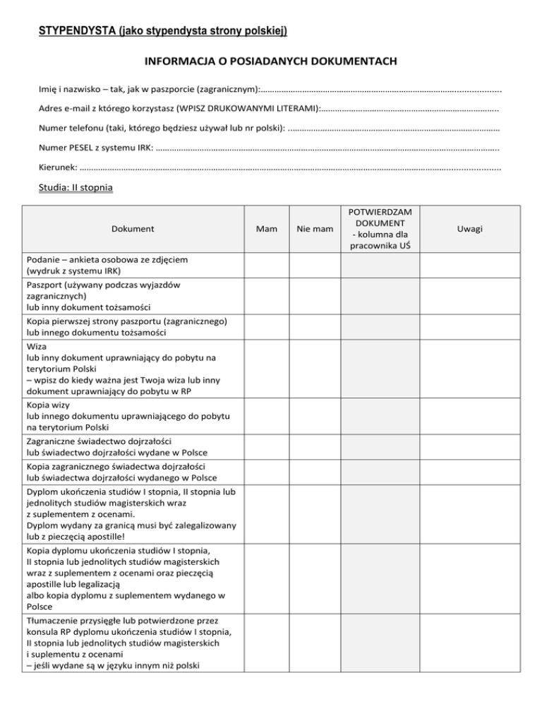 STYPENDYSTA (jako stypendysta strony polskiej) INFORMACJA O POSIADANYCH DOKUMENTACH Imię i nazwisko – tak, jak w paszporcie (zagranicznym):…………………………………………………………………………................... Adres e-mail z którego korzystasz (WPISZ DRUKOWANYMI LITERAMI):………………………………………………………………….. Numer telefonu (taki, którego będziesz używał lub nr polski): ..……………………………………………………………………………… Numer PESEL z systemu IRK: ………………………………………………………………………………………………………………………………….. Kierunek: ……………………………………………………………………………………………………………………………………………...................... Studia: II stopnia Dokument Podanie – ankieta osobowa ze zdjęciem (wydruk z systemu IRK) Paszport (używany podczas wyjazdów zagranicznych) lub inny dokument tożsamości Kopia pierwszej strony paszportu (zagranicznego) lub innego dokumentu tożsamości Wiza lub inny dokument uprawniający do pobytu na terytorium Polski – wpisz do kiedy ważna jest Twoja wiza lub inny dokument uprawniający do pobytu w RP Kopia wizy lub innego dokumentu uprawniającego do pobytu na terytorium Polski Zagraniczne świadectwo dojrzałości lub świadectwo dojrzałości wydane w Polsce Kopia zagranicznego świadectwa dojrzałości lub świadectwa dojrzałości wydanego w Polsce Dyplom ukooczenia studiów I stopnia, II stopnia lub jednolitych studiów magisterskich wraz z suplementem z ocenami. Dyplom wydany za granicą musi byd zalegalizowany lub z pieczęcią apostille! Kopia dyplomu ukooczenia studiów I stopnia, II stopnia lub jednolitych studiów magisterskich wraz z suplementem z ocenami oraz pieczęcią apostille lub legalizacją albo kopia dyplomu z suplementem wydanego w Polsce Tłumaczenie przysięgłe lub potwierdzone przez konsula RP dyplomu ukooczenia studiów I stopnia, II stopnia lub jednolitych studiów magisterskich i suplementu z ocenami – jeśli wydane są w języku innym niż polski Mam Nie mam POTWIERDZAM DOKUMENT - kolumna dla pracownika UŚ Uwagi Dokument Mam Nie mam POTWIERDZAM DOKUMENT - kolumna dla pracownika UŚ Uwagi Zaświadczenie o średniej ocen z ukooczonych studiów wyższych – jeśli średnia stanowi kryterium kwalifikacji na kierunek Tłumaczenie przysięgłe lub poświadczone przez konsula RP zaświadczenia o średniej ocen z ukooczonych studiów wyższych – jeśli zaświadczenie jest w języku innym niż polski Dokument potwierdzający znajomośd języka polskiego – jeśli posiadasz Kopia Certyfikatu Paostwowej Komisji Poświadczania Znajomości Języka Polskiego jako Obcego – jeśli masz taki dokument Zaświadczenie lekarskie z informacją o braku przeciwwskazao do podjęcia studiów na wybranym kierunku Tłumaczenie przysięgłe na język polski zaświadczenia lekarskiego – jeśli zaświadczenie jest wydane w języku innym niż polski Oświadczenie kandydata (wydruk z systemu IRK) 2 fotografie w formie papierowej podpisane z tyłu imieniem i nazwiskiem oraz numerem PESEL z systemu IRK Polisa ubezpieczeniowa na wypadek choroby lub następstw nieszczęśliwych wypadków na okres kształcenia w Polsce, Europejska Karta Ubezpieczenia Zdrowotnego lub potwierdzenie ubezpieczenia w Narodowym Funduszu Zdrowia – napisz datę ważności Kopia polisy ubezpieczeniowej na wypadek choroby lub następstw nieszczęśliwych wypadków na okres kształcenia w Polsce, EKUZ lub potwierdzenia ubezpieczenia w NFZ Karta Polaka – jeśli posiadasz; wpisz datę ważności Kopia Karty Polaka – jeśli posiadasz Oświadczam, że wszystkie informacje podane powyżej są prawdziwe i zgodne ze stanem na dzieo wypełnienia ankiety. Miejscowośd, data Podpis