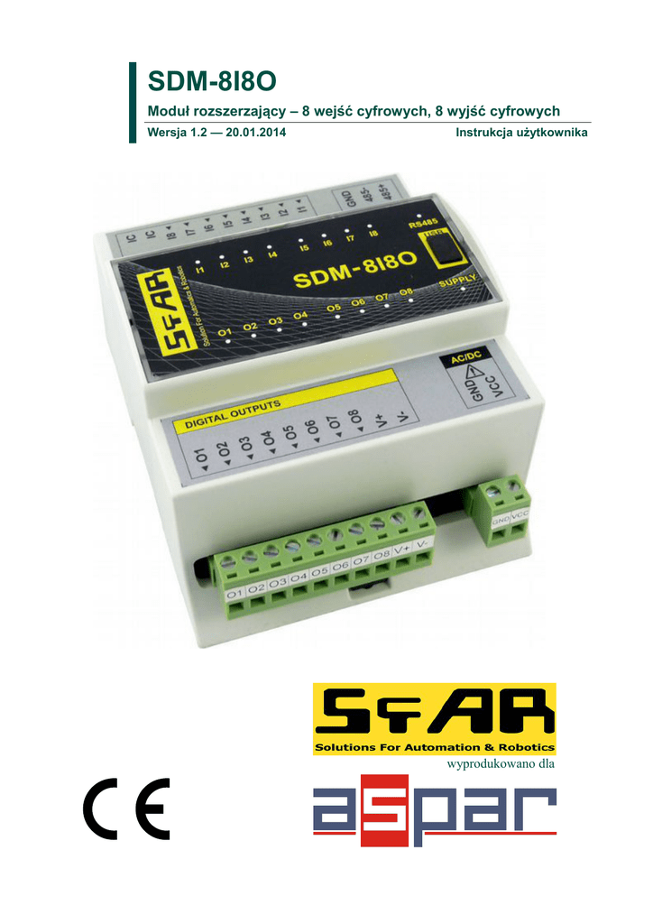 SDM-8I8O Moduł rozszerzający – 8 wejść cyfrowych, 8 wyjść cyfrowych Wersja 1.2 — 20.01.2014 Instrukcja użytkownika wyprodukowano dla SDM-8I8O SfAR Instrukcja użytkownika Dziękujemy za wybór naszego produktu. Niniejsza instrukcja ułatwi Państwu prawidłową obsługę i poprawną eksploatację opisywanego urządzenia. Informacje zawarte w niniejszej instrukcji przygotowane zostały z najwyższą uwagą przez naszych specjalistów i służą jako opis produktu bez ponoszenia jakiejkolwiek odpowiedzialności w rozumieniu prawa handlowego. Informacje te nie zwalniają użytkownika z obowiązku poddania produktu własnej ocenie i sprawdzenia jego właściwości. Zastrzegamy sobie możliwość zmiany parametrów produktów bez powiadomienia. Prosimy o uważne przeczytanie instrukcji i stosowanie się do zawartych w niej zaleceń UWAGA! Niedostosowanie się do instrukcji może spowodować uszkodzenie urządzenia albo utrudnić posługiwanie się sprzętem lub oprogramowaniem. Moduł rozszerzający – 8 wejść cyfrowych, 8 wyjść cyfrowych Instrukcja użytkownika © SfAR 2014. Wszelkie prawa zastrzeżone. Wersja 1.2 - 20.01.2014 2 z 17 SDM-8I8O SfAR Instrukcja użytkownika 1. Zasady bezpieczeństwa • Przed pierwszym uruchomieniem urządzenia należy zapoznać się z niniejszą instrukcją obsługi; • Przed pierwszym uruchomieniem urządzenia należy upewnić się, że wszystkie przewody zostały podłączone prawidłowo; • Należy zapewnić właściwe warunki pracy, zgodne ze specyfikacją urządzenia (np.: napięcie zasilania, temperatura, maksymalny pobór prądu); • Przed dokonaniem jakichkolwiek modyfikacji przyłączeń przewodów, należy wyłączyć napięcie zasilania. 2. Charakterystyka modułu 2.1. Przeznaczenie i opis modułu Moduł SDM-8I8O jest innowacyjnym urządzeniem zapewniającym proste i niedrogie rozszerzenie ilości linii wejściowych oraz wyjściowych w popularnych sterownikach PLC. Moduł posiada 8 wejść cyfrowych z opcją konfigurowalnego licznika oraz 8 wyjść cyfrowych. Dodatkowo zaciski IN1 i IN2 oraz IN3 i IN4 można wykorzystać do podłączenia dwóch enkoderów. Wszystkie wejścia oraz wyjścia są izolowane od logiki za pomocą transoptorów. Każdy kanał może być indywidualnie skonfigurowany w jeden z kilku trybów. Moduł ten podłączany jest do magistrali RS485 za pomocą dwu przewodowej skrętki. Komunikacja odbywa się z wykorzystaniem protokołu MODBUS RTU lub MODBUS ASCII. Zastosowanie 32-bitowego procesora z rdzeniem ARM zapewnia szybkie przetwarzanie danych i szybką komunikację. Prędkość transmisji jest konfigurowalna od 2400 do 115200. Moduł przeznaczony jest do montażu na szynie DIN zgodnie z normą DIN EN 5002. Moduł został wyposażony z zestaw diod LED (kontrolek), używanych do wskazywania stanu wejść i wyjść przydatnych w celach diagnostycznych i pomagających w znalezieniu błędów. Konfiguracja modułu odbywa się przez USB za pomocą dedykowanego programu komputerowego. Możliwa jest również zmiana parametrów za pomocą protokołu MODBUS. Moduł rozszerzający – 8 wejść cyfrowych, 8 wyjść cyfrowych Instrukcja użytkownika © SfAR 2014. Wszelkie prawa zastrzeżone. Wersja 1.2 - 20.01.2014 3 z 17 SDM-8I8O SfAR Instrukcja użytkownika 2.2. Specyfikacja techniczna Zasilanie Wejścia cyfrowe Wyjścia cyfrowe Izolacja Liczniki Temperatura Złącza Wymiary Interfejs * Napięcie 10-30 VDC; 10-28VAC Prąd maksymalny* DC: 100 mA @ 24VDC AC: 125 mA @ 24VAC Maksymalna pobierana moc DC: 2.4W; AC: 3VA Liczba wejść 8 Zakres napięć 0 – 36V Stan niski „0” 0 – 3V Stan wysoki „1” 6 – 36V Impedancja wejściowa 4kΩ Izolacja 1500 Vrms Typ wejść PNP lub NPN Liczba wyjść 8 Maksymalne napięcie 30V Maksymalny prąd wyjścia 500mA Typ wyjścia PNP Zabezpieczenie wyjść Bezpiecznik polimerowy 4A 1500 Vrms Ilość 8 Rozdzielczość 32 bity Częstotliwość 1kHz (max) Szerokość impulsu 500 μs (min) Pracy -10 °C - +50°C Przechowywania -40 °C - +85°C Zasilające 2 pinowe Komunikacyjne 3 pinowe Wejścia 10 pinowe Wyjścia 10 pinowe Konfiguracyjne Mini USB Wysokość 110 mm Głębokość 62 mm Szerokość 88 mm RS485 Do 128 urządzeń Maksymalny prąd przy aktywnej transmisji Modbus, załączonych wszystkich wyjściach i stanie wysokim na wszystkich wejściach Moduł rozszerzający – 8 wejść cyfrowych, 8 wyjść cyfrowych Instrukcja użytkownika © SfAR 2014. Wszelkie prawa zastrzeżone. Wersja 1.2 - 20.01.2014 4 z 17 SDM-8I8O SfAR Instrukcja użytkownika 2.3. Wymiary modułu Wygląd i wymiary modułu znajdują się na rysunku poniżej. Moduł mocowany jest bezpośrednio do szyny w przemysłowym standardzie DIN. Złącza zasilające, komunikacyjne oraz wejść znajdują się od dołu i góry modułu. Złącze konfiguracyjne USB oraz wskaźniki znajdują się z przodu modułu. 91 45 110 42,3 35 110 88 Moduł rozszerzający – 8 wejść cyfrowych, 8 wyjść cyfrowych Instrukcja użytkownika © SfAR 2014. Wszelkie prawa zastrzeżone. Wersja 1.2 - 20.01.2014 5 z 17 SDM-8I8O SfAR Instrukcja użytkownika 3. Konfiguracja komunikacji 3.1. Uziemienie i ekranowanie Moduł może być zainstalowany wraz z innymi urządzeniami, które generują promieniowanie elektromagnetyczne. Przykładami takich urządzeń są przekaźniki i styczniki, transformatory, sterowniki silników itp. To promieniowanie elektromagnetyczne może powodować zakłócenia elektryczne zasilania i przewodów sygnałowych, a także promieniując bezpośrednio do modułu, powodując negatywne skutki dla systemu. Odpowiednie uziemienie, osłony oraz inne działania ochronne należy podjąć na etapie instalacji, aby zapobiec tym efektom. Te działania ochronne obejmują m.in. uziemienie szafy sterowniczej, uziemienie modułu, uziemienie ekranowania przewodów, zabezpieczenie urządzeń przełączających, prawidłowego okablowania, jak również uwzględnienie typów kabli i ich przekrojów. 3.2. Terminator Efekty linii transmisyjne