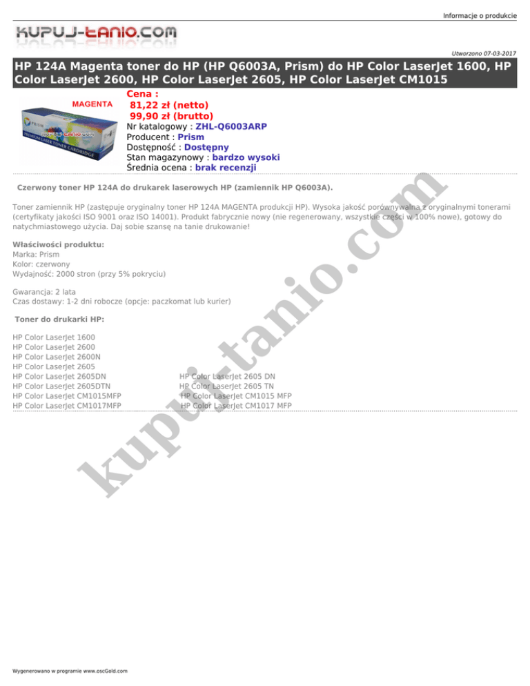 Informacje o produkcie Utworzono 07-03-2017 HP 124A Magenta toner do HP (HP Q6003A, Prism) do HP Color LaserJet 1600, HP Color LaserJet 2600, HP Color LaserJet 2605, HP Color LaserJet CM1015 Cena : 81,22 zł (netto) 99,90 zł (brutto) Nr katalogowy : ZHL-Q6003ARP Producent : Prism Dostępność : Dostępny Stan magazynowy : bardzo wysoki Średnia ocena : brak recenzji io .c om Czerwony toner HP 124A do drukarek laserowych HP (zamiennik HP Q6003A). Toner zamiennik HP (zastępuje oryginalny toner HP 124A MAGENTA produkcji HP). Wysoka jakość porównywalna z oryginalnymi tonerami (certyfikaty jakości ISO 9001 oraz ISO 14001). Produkt fabrycznie nowy (nie regenerowany, wszystkie części w 100% nowe), gotowy do natychmiastowego użycia. Daj sobie szansę na tanie drukowanie! Właściwości produktu: Marka: Prism Kolor: czerwony Wydajność: 2000 stron (przy 5% pokryciu) an Gwarancja: 2 lata Czas dostawy: 1-2 dni robocze (opcje: paczkomat lub kurier) Wygenerowano w programie www.oscGold.com HP Color LaserJet 2605 DN HP Color LaserJet 2605 TN HP Color LaserJet CM1015 MFP HP Color LaserJet CM1017 MFP uj ku p HP Color LaserJet 1600 HP Color LaserJet 2600 HP Color LaserJet 2600N HP Color LaserJet 2605 HP Color LaserJet 2605DN HP Color LaserJet 2605DTN HP Color LaserJet CM1015MFP HP Color LaserJet CM1017MFP -t Toner do drukarki HP:
