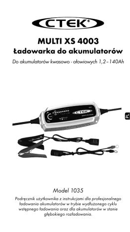 MULTI XS 4003 Ładowarka do akumulatorów PL Do akumulatorów kwasowo - ołowiowych 1,2–140Ah Model 1035 Podręcznik użytkownika z instrukcjami dla profesjonalnego ładowania akumulatorów w trybie wydłużonego cyklu wstępnego ładowania oraz dla akumulatorów w stanie głębokiego rozładowania. WSTĘP Gratulujemy ci zakupu nowej profesjonalnej ładowarki do akumulatorów - typ z przełącznikiem. Ta ładowarka wchodzi w skład serii profesjonalnych ładowarek produkcji firmy CTEK SWEDEN AB i reprezentuje poziom najnowszej technologii w ładowaniu akumulatorów. Proszę uważnie przeczytać ten podręcznik i postępować zgodnie z instrukcjami w nim zawartymi. BEZPIECZEŃSTWO • Ładowarka służy do ładowania akumulatorów kwasowo - ołowiowych 12V. Nie należy jej używać do żadnych innych celów. • Należy zawsze stosować okulary ochronne i odwracać twarz od akumulatora, gdy podłączamy lub odłączamy zaciski. • Kwas z akumulatora powoduje korozję. Gdy kwas uzyska przypadkowy kontakt ze skórą lub oczami przemyj je natychmiast, i poszukaj pomocy medycznej. • Zapewnij, by kable nie zakleszczały się na ostrych krawędziach przedmiotów lub nie stykały się z rozgrzanymi powierzchniami. • Ładowany akumulator może emitować gazy, które mogą spowodować eksplozję, i dlatego ważne jest, aby zapobiegać jakiemukolwiek pojawianiu się iskier w pobliżu akumulatora. Gdy akumulator jest doładowywany pod koniec jego okresu żywotności, może się pojawiać iskrzenie wewnętrzne. • Podczas ładowania należy zawsze zapewnić odpowiednią wentylację. • Należy unikać przykrywania czymkolwiek pracującej ładowarki. • Należy zapewnić, aby kabel głównej sieci zasilającej nie były narażone na kontakt z wodą i zawilgocenie. • Nie należy nigdy próbować ładować zamarzniętych akumulatorów. • Nie należy nigdy próbować ładować uszkodzonych akumulatorów. • Podczas ładowania nie należy nigdy kłaść ładowarki na akumulatorze. • Podłączenie do głównej sieć zasilającej musi być zgodne z przepisami państwowymi odnośnie instalacji elektrycznych. • Sprawdź kable ładowarki przed jej użyciem. Należy się upewnić, czy nie pojawiły się rysy lub pęknięcia na samych kablach lub na zabezpieczeniach w ich zagięciach. Ładowarka o uszkodzonych kablach nie może być użytkowana. • Zanim pozostawimy ładowarkę bez nadzoru lub podłączoną na dłuższy czas, należy zawsze sprawdzić, czy ładowarka została przełączona w tryb ładowania konserwacyjnego. Jeżeli ładowarka nie została przełączona w tryb ładowania konserwacyjnego w ciągu 72 godzin, pojawi się kontrolka/wskaźnik błędu. W takich przypadkach ładowarka musi być odłączona ręcznie. • Wszelkie akumulatory prędzej czy później zawodzą. Akumulator, który zawiedzie podczas ładowania, zostaje objęty nadzorem przez zaawansowany system kontrolny ładowarki, lecz pewne rzadkie przypadki pojawiania się błędów i wad akumulatora nadal występują. Nie należy pozostawiać akumulatora bez nadzoru przez dłuższy okres czasu. • Ładowarkę należy zamontować na płaskiej powierzchni. • To urządzenie nie jest przeznaczone do użytkowania przez dzieci lub osoby, które nie potrafią przeczytać i zrozumieć podręcznika użytkownika, chyba, że znajdują się pod nadzorem osoby odpowiedzialnej, która zapewni, że mogą one bezpiecznie używać ładowarkę akumulatora. Należy przechowywać i użytkować ładowarkę akumulatorów z dala od dostępu przez dzieci, oraz zapewnić, aby dzieci nie bawiły się ładowarką. • Akumulatory pobierają wodę podczas użytkowania i ładowania. Dla akumulatorów, w których można dolewać wodę, poziom wody powinien być sprawdzany regularnie. Jeżeli poziom wody jest niski, należy dolać wodę destylowaną. 2 TYPY I USTAWIENIA AKUMULATORÓW Model MULTI XS 4003 posiada różne ustawienia w zakresie ładowania wymagane do sprawnego działania. Niniejsze zalecenia powinny być traktowane jedynie jako wskazówki. W przypadku jakichkolwiek wątpliwości należy przestrzegać zaleceń podanych przez producenta akumulatora. Ustawień dokonuje się poprzez naciśnięcie przycisku „TRYB” („MODE”) i przewijanie do przodu, poprzez pojedyncze naciskanie tego przycisku, aż zostanie osiągnięty wymagany tryb, przy którym przycisk należy zwolnić. Po około dwóch sekundach ładowarka zostanie zaktywowana na wybrany tryb. Ustawienia tego wybranego trybu zostaną przywrócone następnym razem, gdy ładowarka zostanie podłączona. Poniższa tablica wyjaśnia różne pojawiające się kontrolki/wskaźniki: RECOND Pojemność akumulatora (Ah) Wyjaśnienie 1.2–14 Tryb 14,4V/0,8A Ten tryb powinien być używany w akumulatorach o pojemności mniejszej niż 14Ah. 14–140 Tryb 14,4V/4A Normalny tryb dla akumulatorów mokrych, MF i większości akumulatorów typu GEL. 14–140 Tryb 14,7V/4A Ten tryb jest zalecany dla ładowania akumulatorów przy temperaturze niższej niż +5°C. Jest on także zalecany dla wielu akumulatorów AGM. Ten tryb nie jest zalecany dla ładowania konserwacyjnego akumulatorów, gdy temperatura chwilowo przekracza +5°C. Tutaj zalecamy tryb 14,4V/4A lub 14,4V/0,8A. 14–140 Ten tryb jest zalecany dla regeneracji i przywracania głęboko rozładowanych akumulatorów, gdzie można by się było spodziewać ułożonego warstwami kwasu (wysoka gęstość kwasu u dołu, a niska u góry). Ten problem pojawia się głównie w akumulatorach z otwartym dostępem (z otworem odpowietrzającym), tj. nie będących typu GEL i AGM. Proszę używać tej opcji ostrożnie, ponieważ wysokie napięcie może powodować niewielką utratę wody w akumulatorze. W przypadku pojawienia się jakichkolwiek wątpliwości proszę skontaktować się z dostawcą akumulatora. 15,8V normalnie nie stanowi żadnego problemu dla elektroniki w systemach 12V, lecz w przypadku pojawienia się jakichkolwiek wątpliwości pros