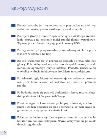 BIOPSJA W¥TROBY Biopsja w¹troby jest wykonywana w przypadku zapaleñ w¹troby, marskoœci, guzów z³oœliwych i niez³oœliwych. Biopsja w¹troby z u¿yciem specjalnej ig³y i lokalnego znieczulenia pozwala na pobranie ma³ej próbki tkanki w¹trobowej. Wykonuje siê równie¿ biopsjê pod kontrol¹ USG. Zabieg mo¿e byæ przeprowadzany ambulatoryjnie lub z pozostaniem w szpitalu na noc. Biopsjê wykonuje siê w pozycji na plecach i praw¹ rêk¹ pod g³ow¹. Pole skóry nad w¹trob¹ jest dezynfekowane, aby do minimum ograniczyæ ryzyko infekcji. Ponadto znieczula siê w okolicy wk³ucia miejscowym œrodkiem znieczulaj¹cym. Po za³o¿eniu ig³y biopsyjnej otrzymuje siê polecenie pozostania przez kilka sekund na wdechu, co umo¿liwi pobranie próbki. Po badaniu mo¿e siê pojawiæ dyskomfort, który mo¿na z³agodziæ podaniem leków przeciwbólowych. Pomimo tego, ¿e krwawienie po biopsji zdarza siê rzadko, to przez 6 godzin pozostaje siê pod obserwacj¹. W tym czasie regularnie bada siê têtno i ciœnienie krwi. Pobrany do badania wycinek w¹troby, zostanie zbadany w laboratorium pod mikroskopem. Wynik otrzymuje siê po oko³o dwóch tygodniach. 10 BIOPSJA W¥TROBY W¹troba Miejsce wk³ucia ig³y Po³o¿enie w¹troby Ig³ê do biopsji wprowadza siê pomiêdzy ¿ebra. W chwili wk³ucia trzeba zatrzymaæ oddech, aby w¹troba nie przemieszcza³a siê Ig³a do biopsji W¹troba ¯ebro 11