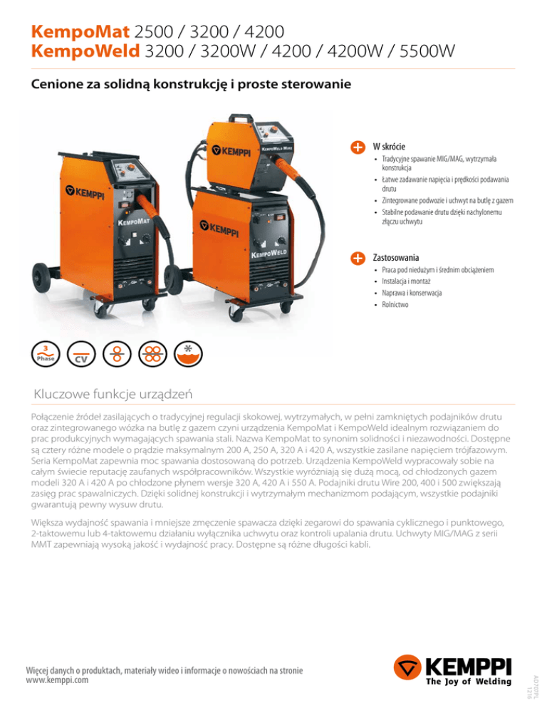 KempoMat 2500 / 3200 / 4200 KempoWeld 3200 / 3200W / 4200 / 4200W / 5500W Cenione za solidną konstrukcję i proste sterowanie W skrócie • Tradycyjne spawanie MIG/MAG, wytrzymała konstrukcja • Łatwe zadawanie napięcia i prędkości podawania drutu • Zintegrowane podwozie i uchwyt na butlę z gazem • Stabilne podawanie drutu dzięki nachylonemu złączu uchwytu Zastosowania • • • • 3 Phase CV Praca pod niedużym i średnim obciążeniem Instalacja i montaż Naprawa i konserwacja Rolnictwo * Kluczowe funkcje urządzeń Połączenie źródeł zasilających o tradycyjnej regulacji skokowej, wytrzymałych, w pełni zamkniętych podajników drutu oraz zintegrowanego wózka na butlę z gazem czyni urządzenia KempoMat i KempoWeld idealnym rozwiązaniem do prac produkcyjnych wymagających spawania stali. Nazwa KempoMat to synonim solidności i niezawodności. Dostępne są cztery różne modele o prądzie maksymalnym 200 A, 250 A, 320 A i 420 A, wszystkie zasilane napięciem trójfazowym. Seria KempoMat zapewnia moc spawania dostosowaną do potrzeb. Urządzenia KempoWeld wypracowały sobie na całym świecie reputację zaufanych współpracowników. Wszystkie wyróżniają się dużą mocą, od chłodzonych gazem modeli 320 A i 420 A po chłodzone płynem wersje 320 A, 420 A i 550 A. Podajniki drutu Wire 200, 400 i 500 zwiększają zasięg prac spawalniczych. Dzięki solidnej konstrukcji i wytrzymałym mechanizmom podającym, wszystkie podajniki gwarantują pewny wysuw drutu. Większa wydajność spawania i mniejsze zmęczenie spawacza dzięki zegarowi do spawania cyklicznego i punktowego, 2-taktowemu lub 4-taktowemu działaniu wyłącznika uchwytu oraz kontroli upalania drutu. Uchwyty MIG/MAG z serii MMT zapewniają wysoką jakość i wydajność pracy. Dostępne są różne długości kabli. AD707PL 1216 Więcej danych o produktach, materiały wideo i informacje o nowościach na stronie www.kemppi.com KempoMat 2500 / 3200 / 4200 KempoWeld 3200 / 3200W / 4200 / 4200W / 5500W Dane techniczne Kempomat Napięcie zasilania 2500 3200 4200 230 V / 400 V 230 V / 400 V 3~ 400 V 380 V -10% ... 415 V +6% 380 V -10% ... 415 V +6% 380 V -10% ... 415 V +6% 3~ 230 V 220 V -10% ... 240 V +6% 220 V -10% ... 240 V +6% 220 V -10% ... 240 V +6% 9,2 kVA (30 % ED) 13,6 kVA (40 % ED) 18,5 kVA (40 % ED) 5,9 kVA 10,0 kVA 13,5 kVA Moc pobierana (max.) 230 V / 400 V 60 % ED 100 % ED 4,0 kVA 6,6 kVA 9,0 kVA 250 A/26 V (30 % ED) 320 A / 32 V (40 % ED) 420 A / 37,5 V (40 % ED) 60 % ED 180 A/23 V 265 A / 27 V 325 A / 31 V 100 % ED 140 A/21 V 205 A / 24 V 265 A / 27 V Zakres regulacji 40 – 250 A/14 – 26 V 40 - 320 A / 15 - 32 V 40 - 420 A / 15 - 37,5 V Voltage steps 10 stopniowa 40 stopniowa 32 stopniowa / 230 V; 56 stopniowa / 400 V Obciążalność 40 °C 35 V 42 V 48 V Sprawność dla prądu maks. Maks. napięcie biegu jałowego 250 A/26 V 75 % (320 A / 32 V ) 75 % (420 A / 37,5 V ) 80 % Współczynnik mocy dla prądu maks. 250 A/26 V 0,95 (320 A / 32 V ) 0,95 (420 A / 37,5 V) 0,95 Zabezpieczenie (zwłoczne) 8A 8A 8A Mechanizm podający 2-rolkowy 4-rolkowy 4-rolkowy Średnica rolek podajnika 32 mm 32 mm 32 mm 0 – 18 m / min 0 – 18 m / min 0 – 18 m / min Prędkość podawania drutu I II 0 – 25 m / min 0 – 25 m / min 0 – 25 m / min Druty elektrodowe ø Fe, Ss 0,6 – 1,2 mm 0,6 – 1,2 mm 0,6 – 1,2 mm ø Rdzeniowe 0,8 – 1,2 mm 0,8 – 1,6 mm 0,8 – 1,6 mm ø Al 1,0 – 1,2 mm 1,0 – 1,6 mm 1,0 – 1,6 mm max. masa 20 kg 20 kg 20 kg max. ø ø 300 mm ø 300 mm ø 300 mm Euro Euro Euro Klasa cieplna H (180 °C) H (180 °C) H (180 °C) Zakres temperatur pracy -20 ... +40 °C -20 ... +40 ° -20 ... +40 ° Zakres temperatur przechowywania -40 ... +60 °C -40 ... +60 °C -40 ... +60 °C Stopień ochrony IP23S IP23S IP23S Klasa kompatybilności elektromagnetycznej A A A Wymiary zewnętrzne 930 x 440 x 860 mm 970 x 480 x 970 970 x 480 x 970 80 kg 118 kg 130 kg Szpula drutu Złącze uchwytu D×S×W Masa Numery do zamówienia Kempomat Kempomat 2500 230/400 V 621425002 Kempomat 3200 230/400 V 621432002 Kempomat 4200 230 V 6214422 Kempomat 4200 400 V 6214424 KMW sync 2 (Synchronizator) 6219150 MSD 1 (miernik prądu) 6185666 GH 20 (gniazdo spoczynkowe uchwytu) 6256020 AD707PL 1216 Więcej danych o produktach, materiały wideo i informacje o nowościach na stronie www.kemppi.com KempoMat 2500 / 3200 / 4200 KempoWeld 3200 / 3200W / 4200 / 4200W / 5500W Dane techniczne Kempoweld Napięcie zasilania Moc 230 V / 400 V Przewód zasilania / Bezpiecznik 3200 3200W 3 ~ 400 V 380 V -10 % ... 415 V +6 % 380 V -10 % ... 415 V +6 % 3 ~ 230 V 220 V -10 % ... 240 V +6 % 220 V -10 % ... 240 V +6 % 40 % ED 13,6 kVA 13,6 kVA 60 % ED 10,0 kVA 10,0 kVA 100 % ED 6,6 kVA 6,6 kVA 220 - 240 V 4 x 2,5 mm² / 20 A zwłoczny 4 x 2,5 mm² / 20 A zwłoczny 380 - 415 V 4 x 2,5 mm² / 16 A zwłoczny 4 x 2,5 mm² / 16 A zwłoczny 30 V / 250 VA 30 V / 250 VA Zasilanie podajnika drutu Bezpiecznik zwłoczny 8A 8A 40 % ED 320 A / 32 V 320 A / 32 V 60 % ED 265 A / 27 V 265 A / 27 V 100 % ED 205 A / 24 V 205 A / 24 V Zakres regulacji o 40-stopniach 40 – 320 A / 15 – 32 V 40 – 320 A / 15 – 32 V Napięcie biegu jałowego (16 stopni) 15 – 40 V 15 – 40 V Obciążalność Pobór mocy na biegu jałowym < 50 W < 50 W Sprawność 320 A / 32 V 75 % 75 % Współczynnik mocy 320 A / 32 V 0,95 0,95 Klasa izolacji H (180 °C) H (180 °C) Zakres temperatur użytkowania -20 ... +60 °C -20 ... +60 °C Zakres temperatur przechowywania -40 ... +60 °C -40 ... +60 °C Stopień ochrony IP23S IP23S A A 990 x 530 x 880 mm 990 x 530 x 1090 mm 106 kg 118 kg Klasa kompatybilności elektromagnetycznej Wymiary zewnętrzne Masa D×S×W Numery do zamówienia Kempoweld Kempoweld 3200 621532002 Kempoweld 3200W 621632002 Podajnik drutu Kempoweld WIRE 400 AD707PL 1216 Więcej danych o produktach, materiały wideo i informacje o nowościach na stronie www.kemppi.com 621740001 KempoMat 2500 / 3200 / 4200 KempoWeld 3200 / 3200W / 4200 / 4200W / 5500W Dane