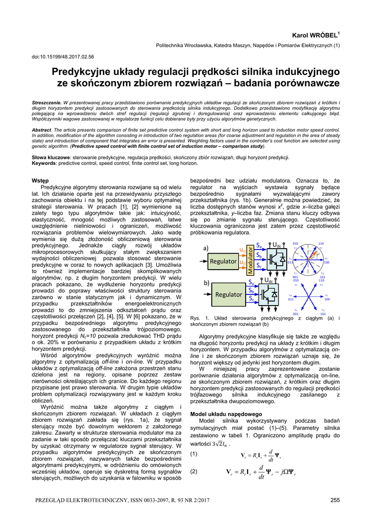 Karol WRÓBEL1 Politechnika Wrocławska, Katedra Maszyn, Napędów i Pomiarów Elektrycznych (1) doi:10.15199/48.2017.02.56 Predykcyjne układy regulacji prędkości silnika indukcyjnego ze skończonym zbiorem rozwiązań – badania porównawcze Streszczenie. W prezentowanej pracy przedstawiono porównanie predykcyjnych układów regulacji ze skończonym zbiorem rozwiązań z krótkim i długim horyzontem predykcji zastosowanych do sterowania prędkością silnika indukcyjnego. Dodatkowo przedstawiono modyfikację algorytmu polegającą na wprowadzeniu dwóch stref regulacji (regulacji zgrubnej i doregulowania) oraz wprowadzeniu elementu całkującego błąd. Współczynniki wagowe zastosowanej w regulatorze funkcji celu dobierane były przy użyciu algorytmów genetycznych. Abstract. The article presents comparison of finite set predictive control system with short and long horizon used to induction motor speed control. In addition, modification of the algorithm consisting in introduction of two regulation areas (for coarse adjustment and regulation in the area of steady state) and introduction of component that integrates an error is presented. Weighting factors used in the controller’s cost function are selected using genetic algorithm. (Predictive speed control with finite control set of induction motor – comparison study). Słowa kluczowe: sterowanie predykcyjne, regulacja prędkości, skończony zbiór rozwiązań, długi horyzont predykcji. Keywords: predictive control, speed control, finite control set, long horizon. bezpośredni bez udziału modulatora. Oznacza to, że regulator na wyjściach wystawia sygnały będące bezpośrednio sygnałami wyzwalającymi zawory przekształtnika (rys. 1b). Generalnie można powiedzieć, że liczba dostępnych stanów wynosi xy, gdzie x–liczba gałęzi przekształtnika, y–liczba faz. Zmiana stanu kluczy odbywa się po zmianie sygnału sterującego. Częstotliwość kluczowania ograniczona jest zatem przez częstotliwość próbkowania regulatora. a) u Regulator u b) Modulator Wstęp Predykcyjne algorytmy sterowania rozwijane są od wielu lat. Ich działanie oparte jest na przewidywaniu przyszłego zachowania obiektu i na tej podstawie wyboru optymalnej strategii sterowania. W pracach [1], [2] wymienione są zalety tego typu algorytmów takie jak: intuicyjność, elastyczność, mnogość możliwych zastosowań, łatwe uwzględnienie nieliniowości i ograniczeń, możliwość rozwiązania problemów wielowymiarowych. Jako wadę wymienia się dużą złożoność obliczeniową sterowania predykcyjnego. Jednakże ciągły rozwój układów mikroprocesorowych skutkujący stałym zwiększaniem wydajności obliczeniowej pozwala stosować sterowanie predykcyjne w coraz to nowych aplikacjach [3]. Umożliwia to również implementacje bardziej skomplikowanych algorytmów, np. z długim horyzontem predykcji. W wielu pracach pokazano, że wydłużenie horyzontu predykcji prowadzi do poprawy właściwości struktury sterowania zarówno w stanie statycznym jak i dynamicznym. W przypadku przekształtników energoelektronicznych prowadzi to do zmniejszenia odkształceń prądu oraz częstotliwości przełączeń [2], [4], [5]. W [6] pokazano, że w przypadku bezpośredniego algorytmu predykcyjnego zastosowanego do przekształtnika trójpoziomowego, horyzont predykcji Nc=10 pozwala zredukować THD prądu o ok. 20% w porównaniu z przypadkiem układu z krótkim horyzontem predykcji. Wśród algorytmów predykcyjnych wyróżnić można algorytmy z optymalizacją off-line i on-line. W przypadku układów z optymalizacją off-line założona przestrzeń stanu dzielona jest na regiony, opisane poprzez zestaw nierówności określających ich granice. Do każdego regionu przypisane jest prawo sterowania. W drugim typie układów problem optymalizacji rozwiązywany jest w każdym kroku obliczeń. Wyróżnić można także algorytmy z ciągłym i skończonym zbiorem rozwiązań. W układach z ciągłym zbiorem rozwiązań zakłada się (rys. 1a), że sygnał sterujący może być dowolnym wektorem z założonego zakresu. Zawarty w strukturze sterowania modulator ma za zadanie w taki sposób przełączać kluczami przekształtnika by uzyskać otrzymany w regulatorze sygnał sterujący. W przypadku algorytmów predykcyjnych ze skończonym zbiorem rozwiązań, nazywanych także bezpośrednimi algorytmami predykcyjnymi, w odróżnieniu do omówionych wcześniej układów, operuje się dyskretną formą sygnałów sterujących, możliwych do uzyskania w falowniku w sposób Sa Sb Sc Sa S Regulator b Sc Udc 010 v3 110 v2 v1 100 v4 011 Udc v5 001 010 v3 v6 101 110 v2 v1 100 v4 011 v5 001 v6 101 Rys. 1. Układ sterowania predykcyjnego z ciągłym skończonym zbiorem rozwiązań (b) (a) i Algorytmy predykcyjne klasyfikuje się także ze względu na długość horyzontu predykcji na układy z krótkim i długim horyzontem. W przypadku algorytmów z optymalizacją online i ze skończonym zbiorem rozwiązań uznaje się, że horyzont większy od jedynki jest horyzontem długim. W niniejszej pracy zaprezentowane zostanie porównanie działania algorytmów z optymalizacją on-line, ze skończonym zbiorem rozwiązań, z krótkim oraz długim horyzontem predykcji zastosowanych do regulacji prędkości trójfazowego silnika indukcyjnego zasilanego z przekształtnika dwupoziomowego. Model układu napędowego Model silnika wykorzystywany podczas badań symulacyjnych miał postać (1)–(5). Parametry silnika zestawiono w tabeli 1. Ograniczono amplitudę prądu do wartości 3√2 . d (1) Vs Rs I s Ψ s dt (2) PRZEGLĄD ELEKTROTECHNICZNY, ISSN 0033-2097, R. 93 NR 2/2017 Vr Rr I r d Ψ r jΨ r dt 255 próbkowania, =Ls/RR=Rs+kr2Rr, kr=Lm/Lr, r=Lr/Rr, =1Lm2/(LrLs), k – chwila czasowa, n – krok predykcji. Ψ s Ls I s LmI r Ψ r Lr I r LmI s (3) (4) Przedstawiona sekwencja powtarzana jest dla każdego z założonych kroków predykcji i dla każdego z dostępnych wektorów sterują