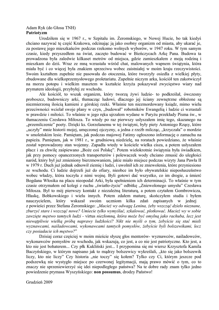 Adam Ryk (do Głosu TNH) Patriotyzm Urodziłem się w 1967 r., w Szpitalu im. Żeromskiego, w Nowej Hucie, bo tak kiedyś chciano nazywać tę część Krakowa, odcinając ją jako osobny organizm od miasta, aby ukarać je, za postawę jego mieszkańców podczas rzekomo wolnych wyborów, w 1947 roku. W tym samym czasie, kiedy przyszedłem na świat, zaczęto budować w Bieńczycach Arkę Pana. Budowa ta prowadzona była zaledwie kilkaset metrów od miejsca, gdzie zamieszkałem z moją rodziną i mieszkam do dziś. Wraz ze mną wzrastała wśród chat, malowanych wapnem świątynia, która miała być i co więcej była znakiem sprzeciwu wobec zaistniałej w moim kraju rzeczywistości. Swoim kształtem zupełnie nie pasowała do otoczenia, które tworzyły osiedla z wielkiej płyty, zbudowane dla wielkoprzemysłowego proletariatu. Zupełnie niczym arka, kościół ten zakotwiczył na morzu potopu i wielkim masztem w kształcie krzyża pokazywał zwycięstwo wiary nad prymatem ideologii, przybyłej ze wschodu. Ale kościół, to wszak organizm, który tworzą żywi ludzie- to podkreślał, ówczesny proboszcz, budowniczy arki, tłumacząc ludowi, dlaczego jej ściany zewnętrzne obłożone są niezmierzoną ilością kamieni z górskiej rzeki. Właśnie ten niezmordowany ksiądz, mimo wielu przeciwności wcielał swoje plany w czyn, „budował” robotników Ewangelią i ludzie ci wzrastali w prawdzie i miłości. To właśnie w jego ręku ujrzałem wydane w Paryżu przekłady Pisma św., w tłumaczeniu Czesława Miłosza. To wtedy po raz pierwszy usłyszałem imię tego, skazanego na „przemilczenie” poety. Dzięki ks. Gorzelanemu w tej świątyni, były piety Antoniego Rząsy, które „uczyły” mnie historii mojej, umęczonej ojczyzny, a jedna z rzeźb milcząc, „krzyczała” o mordzie w smoleńskim lesie. Pamiętam, jak podczas majowej Fatimy ogłoszono informację o zamachu na papieża. Pamiętam, jak w 1981 r., w grudniową niedzielę, na roratach powiedziano, że właśnie został wprowadzony stan wojenny. Zapadła wtedy w kościele wielka cisza, a potem usłyszałem płacz i za chwilę zaśpiewano „Boże coś Polskę”. Potem wielokrotnie świątynia była świadkiem, jak przy pomocy opancerzonych transporterów i polewaczek wody chciano zmusić do uległości naród, który był już zmieniony bierzmowaniem, jakie miało miejsce podczas wizyty Jana Pawła II w 1979 r. Duch już jednak odnowił ziemię i ludzi, i uwolnił ich ze zniewolenia, które przyniesiono ze wschodu. Ci ludzie dojrzeli już do ofiary, nieobce im było obywatelskie nieposłuszeństwo wobec władzy, która toczyła z nimi wojnę. Byli gotowi dać wszystko, co im drogie, a śmierć Bogdana Włosika na placu nieopodal Arki, była spełnieniem ich determinacji. To właśnie w tym czasie otrzymałem od kolegi z ruchu „światło-życie” odbitkę „Zniewolonego umysłu” Czesława Miłosza. Był to mój pierwszy kontakt z niezależną literaturą, a potem czytałem Gombrowicza, Hłaskę, Bobkowskiego i wielu innych. Potem zdałem maturę, skończyłem studia i byłem nauczycielem, który wskazał swoim uczniom kilka zdań zapisanych w jednej z powieści przez Stefana Żeromskiego: „Macież wy odwagę Lenina, żeby wszcząć dzieło nieznane, zburzyć stare i wszcząć nowe? Umiecie tylko wymyślać, szkalować, plotkować. Macież wy w sobie zawzięte męstwo tamtych ludzi - virtus niezłomną, która może być omylną jako rachuba, lecz jest niewątpliwie wielką próbą naprawy ludzkości? Nikt nie myśli o tym, żebyście się stać mieli wyznawcami, naśladowcami, wykonawcami tamtych pomysłów, żebyście byli bolszewikami, lecz czy posiadacie ich męstwo?” Dzisiaj coraz częściej w moim mieście słyszę głos mentorów- wyznawców, naśladowców, wykonawców pomysłów ze wschodu, jak wskazują, co jest, a co nie jest patriotyczne. Kto jest, a kto nie jest bohaterem... Czy płk Kukliński jest... I przypomina się mi wiersz Krzysztofa Kamila Baczyńskiego, w którym napisano jak to mądrzy bolszewicy wykreślali, „kto się jako bolszewik liczy, kto nie liczy” Czy historia „nie toczy” się kołem? Tylko czy Ci, którym jeszcze pod podszewką nie wystygło miejsce po czerwonej legitymacji, mają prawo mówić o tym, co to znaczy nie sprzeniewierzyć się idei niepodległego państwa? Na te dobre rady znam tylko jedno powiedzenie prymasa Wyszyńskiego: non possumus, drodzy Państwo! Grudzień 2009
