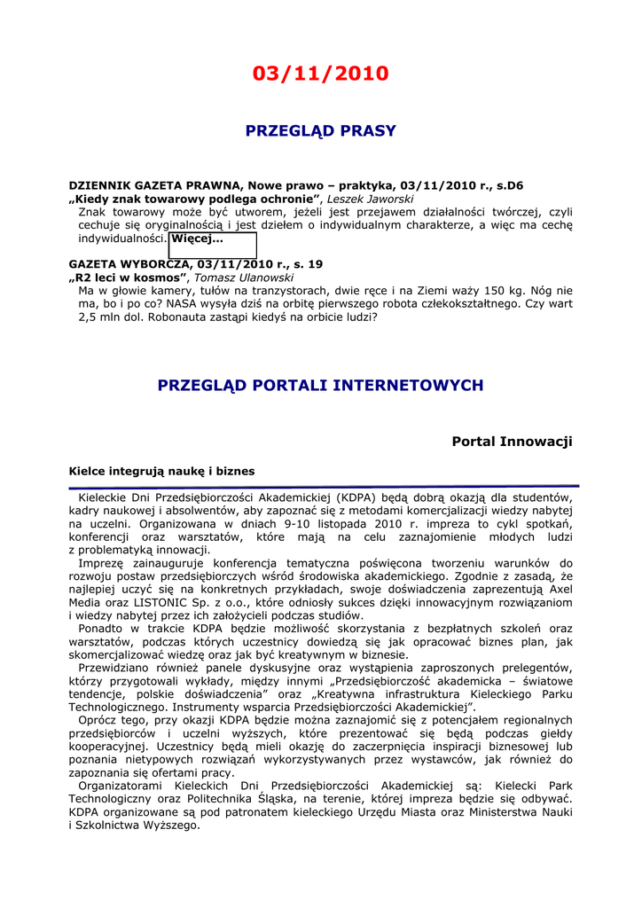 03/11/2010 PRZEGLĄD PRASY DZIENNIK GAZETA PRAWNA, Nowe prawo – praktyka, 03/11/2010 r., s.D6 „Kiedy znak towarowy podlega ochronie”, Leszek Jaworski Znak towarowy może być utworem, jeżeli jest przejawem działalności twórczej, czyli cechuje się oryginalnością i jest dziełem o indywidualnym charakterze, a więc ma cechę indywidualności. Więcej… GAZETA WYBORCZA, 03/11/2010 r., s. 19 „R2 leci w kosmos”, Tomasz Ulanowski Ma w głowie kamery, tułów na tranzystorach, dwie ręce i na Ziemi waży 150 kg. Nóg nie ma, bo i po co? NASA wysyła dziś na orbitę pierwszego robota człekokształtnego. Czy wart 2,5 mln dol. Robonauta zastąpi kiedyś na orbicie ludzi? PRZEGLĄD PORTALI INTERNETOWYCH Portal Innowacji Kielce integrują naukę i biznes Kieleckie Dni Przedsiębiorczości Akademickiej (KDPA) będą dobrą okazją dla studentów, kadry naukowej i absolwentów, aby zapoznać się z metodami komercjalizacji wiedzy nabytej na uczelni. Organizowana w dniach 9-10 listopada 2010 r. impreza to cykl spotkań, konferencji oraz warsztatów, które mają na celu zaznajomienie młodych ludzi z problematyką innowacji. Imprezę zainauguruje konferencja tematyczna poświęcona tworzeniu warunków do rozwoju postaw przedsiębiorczych wśród środowiska akademickiego. Zgodnie z zasadą, że najlepiej uczyć się na konkretnych przykładach, swoje doświadczenia zaprezentują Axel Media oraz LISTONIC Sp. z o.o., które odniosły sukces dzięki innowacyjnym rozwiązaniom i wiedzy nabytej przez ich założycieli podczas studiów. Ponadto w trakcie KDPA będzie możliwość skorzystania z bezpłatnych szkoleń oraz warsztatów, podczas których uczestnicy dowiedzą się jak opracować biznes plan, jak skomercjalizować wiedzę oraz jak być kreatywnym w biznesie. Przewidziano również panele dyskusyjne oraz wystąpienia zaproszonych prelegentów, którzy przygotowali wykłady, między innymi „Przedsiębiorczość akademicka – światowe tendencje, polskie doświadczenia” oraz „Kreatywna infrastruktura Kieleckiego Parku Technologicznego. Instrumenty wsparcia Przedsiębiorczości Akademickiej”. Oprócz tego, przy okazji KDPA będzie można zaznajomić się z potencjałem regionalnych przedsiębiorców i uczelni wyższych, które prezentować się będą podczas giełdy kooperacyjnej. Uczestnicy będą mieli okazję do zaczerpnięcia inspiracji biznesowej lub poznania nietypowych rozwiązań wykorzystywanych przez wystawców, jak również do zapoznania się ofertami pracy. Organizatorami Kieleckich Dni Przedsiębiorczości Akademickiej są: Kielecki Park Technologiczny oraz Politechnika Śląska, na terenie, której impreza będzie się odbywać. KDPA organizowane są pod patronatem kieleckiego Urzędu Miasta oraz Ministerstwa Nauki i Szkolnictwa Wyższego. Gdański klaster wśród najlepszych Klastry w naszym kraju rozwijają się coraz sprawniej, a ich rozwój był przedmiotem niedawnego badania przeprowadzonego przez PARP. Wśród 47 przebadanych klastrów, Pomorski Klaster ICT okazał się jednym z najlepszych. O wynikach badania z perspektywy województwa pomorskiego informuje Portal trójmiasto.pl. O benchmarkingu klastrów w Polsce pisaliśmy już niejednokrotnie na łamach Portalu Innowacji. Celem badania była analiza stanu powiązań między polskimi firmami. Jak przypomina portal trójmiasto.pl, w badaniu pod lupę wzięto 47 klastrów. Wiele z nich jest jeszcze we wczesnej fazie rozwoju, jednak znalazły się też takie, jak Pomorski Klaster ICT, który może być przykładem dla innych. Pomorski Klaster ICT został po raz pierwszy wyróżniony w zeszłym roku, kiedy otrzymał status klastra kluczowego dla gospodarki regionu. Tegoroczne wysokie miejsce w badaniu PARP to tylko dowód na to, że klaster bardzo dobrze się rozwija i skutecznie integruje branżę informatyczno-telekomunikacjną. Trojmiasto.pl podaje, że pomorski klaster charakteryzuje się znacznym stopniem rozwoju. Co to oznacza? W artykule przeczytamy, że Pomorski Klaster ICT już dziś skupia 80 podmiotów, z czego większość to przedsiębiorstwa. Oznacza to, że generuje wiele miejsc pracy, a także przyczynia się do rozwoju całego Pomorza. O tym, jak wielkie znaczenie mają klastry dla rozwoju regionów pisaliśmy na Portalu Innowacji m.in. w artykule „Klastry szansą dla Pomorza”. W artykule czytamy, że władze województwa pomorskiego wiedzą o potrzebie wspierania tego typu powiązań, w tym celu powstał „Regionalny Program Wspierania Klastrów dla Województwa Pomorskiego na lata 2009-2015.” Konferencja „Małopolska - region wiedzy" Zapraszam do udziału w konferencji „Małopolska - region wiedzy”, która odbędzie się 16 listopada 2010 roku w Muzeum Sztuki i Techniki Japońskiej Manggha w Krakowie. Konferencja podsumuje projekt „Perspektywa Technologiczna Kraków – Małopolska 2020”, którego celem jest wyznaczenie kierunków rozwoju gospodarczego województwa małopolskiego oraz wskazanie priorytetowych kierunków badań i wdrożeń pozwalających efektywniej wykorzystywać potencjał społeczno-gospodarczy naszego regionu. Wyniki projektu stanowić będą wsparcie dla kadr nowoczesnej gospodarki, wzrostu konkurencyjności innowacyjnych przedsiębiorstw, wdrożenia polityki samorządu w zakresie wybranych technologii oraz efektywnego gospodarowania środkami publicznymi i prywatnymi. Spotkanie poświęcone będzie upowszechnieniu wyników projektu. W ramach dotychczas przeprowadzonych prac przeanalizowano potencjał regionu związany z wysokimi technologiami oraz wyodrębniono 10 kluczowych zastosowań technologicznych o szczególnym znaczeniu dla rozwoju województwa. Program konferencji obejmuje także prezentację wizji przyszłości i celów rozwojowych w kolejnej dekadzie z perspektywy kraju, regionu i społeczności lokalnej. Podczas spotkania dyskutowane będą czynniki rozwoju nowoczesnej gospodarki oraz potencjał społeczno-ekonomiczny związany z roz