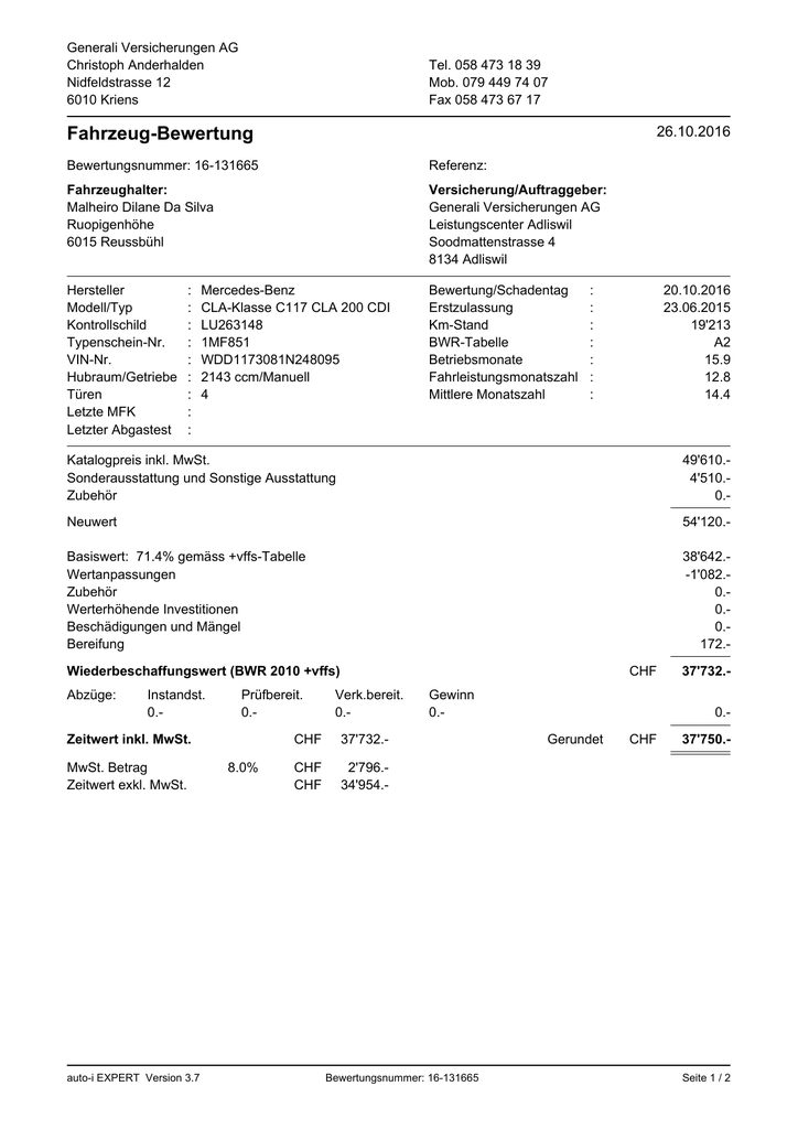 Generali Versicherungen AG Christoph Anderhalden Nidfeldstrasse 12 6010 Kriens Tel. 058 473 18 39 Mob. 079 449 74 07 Fax 058 473 67 17 26.10.2016 Fahrzeug-Bewertung Bewertungsnummer: 16-131665 Referenz: Fahrzeughalter: Malheiro Dilane Da Silva Ruopigenhöhe 6015 Reussbühl Versicherung/Auftraggeber: Generali Versicherungen AG Leistungscenter Adliswil Soodmattenstrasse 4 8134 Adliswil Hersteller Modell/Typ Kontrollschild Typenschein-Nr. VIN-Nr. Hubraum/Getriebe Türen Letzte MFK Letzter Abgastest Bewertung/Schadentag Erstzulassung Km-Stand BWR-Tabelle Betriebsmonate Fahrleistungsmonatszahl Mittlere Monatszahl : : : : : : : : : Mercedes-Benz CLA-Klasse C117 CLA 200 CDI LU263148 1MF851 WDD1173081N248095 2143 ccm/Manuell 4 : : : : : : : 20.10.2016 23.06.2015 19'213 A2 15.9 12.8 14.4 Katalogpreis inkl. MwSt. Sonderausstattung und Sonstige Ausstattung Zubehör 49'610.4'510.0.- Neuwert 54'120.- Basiswert: 71.4% gemäss +vffs-Tabelle Wertanpassungen Zubehör Werterhöhende Investitionen Beschädigungen und Mängel Bereifung 38'642.-1'082.0.0.0.172.- Wiederbeschaffungswert (BWR 2010 +vffs) Abzüge: Instandst. 0.- Prüfbereit. 0.- Zeitwert inkl. MwSt. MwSt. Betrag Zeitwert exkl. MwSt. auto-i EXPERT Version 3.7 8.0% CHF Verk.bereit. 0.- CHF 37'732.- CHF CHF 2'796.34'954.- Gewinn 0.- Bewertungsnummer: 16-131665 37'732.0.- Gerundet CHF 37'750.- Seite 1 / 2 Generali Versicherungen AG Christoph Anderhalden Nidfeldstrasse 12 6010 Kriens Tel. 058 473 18 39 Mob. 079 449 74 07 Fax 058 473 67 17 26.10.2016 Details zur Fahrzeug-Bewertung Serienausstattung Elektronische Wegfahrsperre, Zentralverriegelung mit Innenschalter, Aussenspiegel elektrisch verstellbar und heizbar, Wärmedämmendes Glas, Dieselpartikelfilter, Klimaanlage mit Pollenfilter, Airbag Fahrer und Beifahrerseite, Knieairbag Fahrer, Seitenairbag Fahrer und Beifahrerseite, Windowbag, Sitzbelegungserkennung für Beifahrerairbag, Zierteile in Aluminium, Multifunktionslenkrad Leder, Einzeln abklappbare Rücksitzlehnen 60/40, Isofix-Vorbereitung Rücksitze aussen, Aussentemperaturanzeige, Radio/ CD Audio 20, Keine Gewähr auf die Angaben der Serienausstattungen Sonderaustattung und Sonstige Ausstattung Neupreis Pack Sitzkomfort Pack Spiegel Rückfahrkamera Wärmedämmendes Glas dunkel getönt Bi-Xenon-Scheinwerfer Leichtmetallräder 18" AMG Vielspeichen schwarz Klimaautomat Thermotronic Sitzheizung vorne 110.460.485.385.1'300.540.785.445.- Wertanpassungen Marktlage Bereifung 4'510.- Prozent Betrag -2.0 -1'082.- Total -1'082.- Wert Anzahl Pr.-Tiefe Pr.-Norm Neupreis 4 8.0 8.0 600.- Durchschnittliche Profiltiefe: 100.0% Total 600.- 172.- 1. Inverk. Km-Stand Preis 23.06.2015 23.06.2015 19'213 19'213 26'700.32'138.- Atlas 225/45 R 17 94 V Polarbear 2 XL TL Vergleichsangebot auto-i Bewertung Eintausch (Daten 13.10.2016) auto-i Bewertung Verkauf (Daten 13.10.2016) auto-i EXPERT Version 3.7 Total Bewertungsnummer: 16-131665 Seite 2 / 2