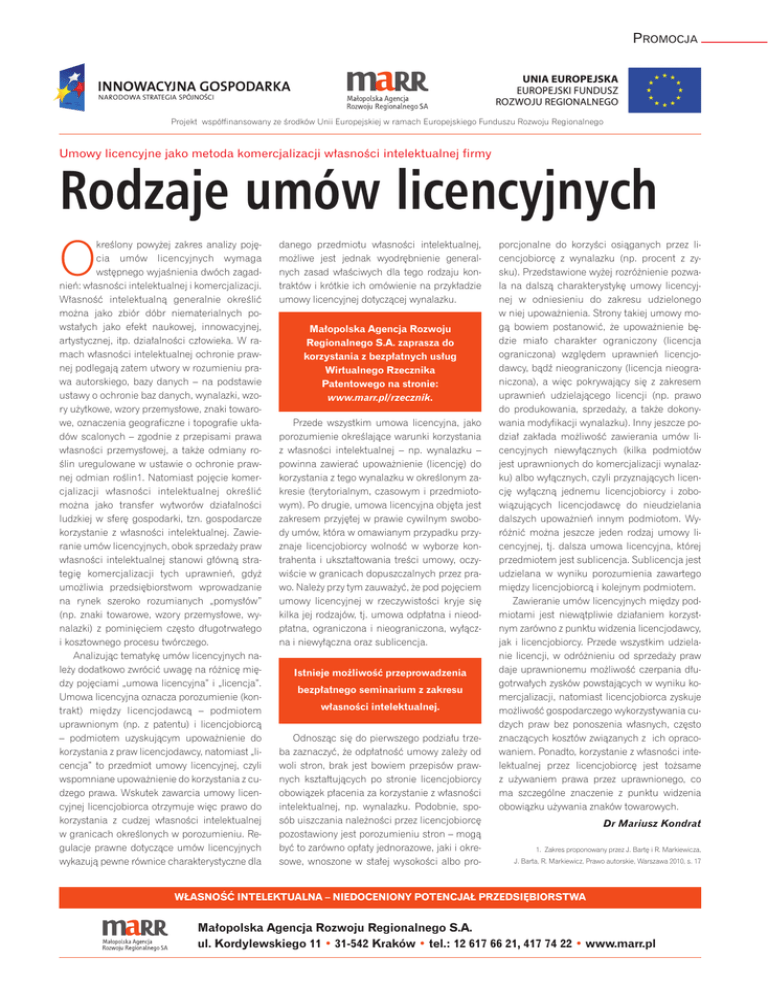 PROMOCJA Projekt wspó∏finansowany ze Êrodków Unii Europejskiej w ramach Europejskiego Funduszu Rozwoju Regionalnego Umowy licencyjne jako metoda komercjalizacji w∏asnoÊci intelektualnej firmy Rodzaje umów licencyjnych O kreÊlony powy˝ej zakres analizy poj´cia umów licencyjnych wymaga wst´pnego wyjaÊnienia dwóch zagadnieƒ: w∏asnoÊci intelektualnej i komercjalizacji. W∏asnoÊç intelektualnà generalnie okreÊliç mo˝na jako zbiór dóbr niematerialnych powsta∏ych jako efekt naukowej, innowacyjnej, artystycznej, itp. dzia∏alnoÊci cz∏owieka. W ramach w∏asnoÊci intelektualnej ochronie prawnej podlegajà zatem utwory w rozumieniu prawa autorskiego, bazy danych – na podstawie ustawy o ochronie baz danych, wynalazki, wzory u˝ytkowe, wzory przemys∏owe, znaki towarowe, oznaczenia geograficzne i topografie uk∏adów scalonych – zgodnie z przepisami prawa w∏asnoÊci przemys∏owej, a tak˝e odmiany roÊlin uregulowane w ustawie o ochronie prawnej odmian roÊlin1. Natomiast poj´cie komercjalizacji w∏asnoÊci intelektualnej okreÊliç mo˝na jako transfer wytworów dzia∏alnoÊci ludzkiej w sfer´ gospodarki, tzn. gospodarcze korzystanie z w∏asnoÊci intelektualnej. Zawieranie umów licencyjnych, obok sprzeda˝y praw w∏asnoÊci intelektualnej stanowi g∏ównà strategi´ komercjalizacji tych uprawnieƒ, gdy˝ umo˝liwia przedsi´biorstwom wprowadzanie na rynek szeroko rozumianych „pomys∏ów” (np. znaki towarowe, wzory przemys∏owe, wynalazki) z pomini´ciem cz´sto d∏ugotrwa∏ego i kosztownego procesu twórczego. Analizujàc tematyk´ umów licencyjnych nale˝y dodatkowo zwróciç uwag´ na ró˝nic´ mi´dzy poj´ciami „umowa licencyjna” i „licencja”. Umowa licencyjna oznacza porozumienie (kontrakt) mi´dzy licencjodawcà – podmiotem uprawnionym (np. z patentu) i licencjobiorcà – podmiotem uzyskujàcym upowa˝nienie do korzystania z praw licencjodawcy, natomiast „licencja” to przedmiot umowy licencyjnej, czyli wspomniane upowa˝nienie do korzystania z cudzego prawa. Wskutek zawarcia umowy licencyjnej licencjobiorca otrzymuje wi´c prawo do korzystania z cudzej w∏asnoÊci intelektualnej w granicach okreÊlonych w porozumieniu. Regulacje prawne dotyczàce umów licencyjnych wykazujà pewne równice charakterystyczne dla danego przedmiotu w∏asnoÊci intelektualnej, mo˝liwe jest jednak wyodr´bnienie generalnych zasad w∏aÊciwych dla tego rodzaju kontraktów i krótkie ich omówienie na przyk∏adzie umowy licencyjnej dotyczàcej wynalazku. Ma∏opolska Agencja Rozwoju Regionalnego S.A. zaprasza do korzystania z bezp∏atnych us∏ug Wirtualnego Rzecznika Patentowego na stronie: www.marr.pl/rzecznik. Przede wszystkim umowa licencyjna, jako porozumienie okreÊlajàce warunki korzystania z w∏asnoÊci intelektualnej – np. wynalazku – powinna zawieraç upowa˝nienie (licencj´) do korzystania z tego wynalazku w okreÊlonym zakresie (terytorialnym, czasowym i przedmiotowym). Po drugie, umowa licencyjna obj´ta jest zakresem przyj´tej w prawie cywilnym swobody umów, która w omawianym przypadku przyznaje licencjobiorcy wolnoÊç w wyborze kontrahenta i ukszta∏towania treÊci umowy, oczywiÊcie w granicach dopuszczalnych przez prawo. Nale˝y przy tym zauwa˝yç, ˝e pod poj´ciem umowy licencyjnej w rzeczywistoÊci kryje si´ kilka jej rodzajów, tj. umowa odp∏atna i nieodp∏atna, ograniczona i nieograniczona, wy∏àczna i niewy∏àczna oraz sublicencja. Istnieje mo˝liwoÊç przeprowadzenia bezp∏atnego seminarium z zakresu w∏asnoÊci intelektualnej. Odnoszàc si´ do pierwszego podzia∏u trzeba zaznaczyç, ˝e odp∏atnoÊç umowy zale˝y od woli stron, brak jest bowiem przepisów prawnych kszta∏tujàcych po stronie licencjobiorcy obowiàzek p∏acenia za korzystanie z w∏asnoÊci intelektualnej, np. wynalazku. Podobnie, sposób uiszczania nale˝noÊci przez licencjobiorc´ pozostawiony jest porozumieniu stron – mogà byç to zarówno op∏aty jednorazowe, jaki i okresowe, wnoszone w sta∏ej wysokoÊci albo pro- porcjonalne do korzyÊci osiàganych przez licencjobiorc´ z wynalazku (np. procent z zysku). Przedstawione wy˝ej rozró˝nienie pozwala na dalszà charakterystyk´ umowy licencyjnej w odniesieniu do zakresu udzielonego w niej upowa˝nienia. Strony takiej umowy mogà bowiem postanowiç, ˝e upowa˝nienie b´dzie mia∏o charakter ograniczony (licencja ograniczona) wzgl´dem uprawnieƒ licencjodawcy, bàdê nieograniczony (licencja nieograniczona), a wi´c pokrywajàcy si´ z zakresem uprawnieƒ udzielajàcego licencji (np. prawo do produkowania, sprzeda˝y, a tak˝e dokonywania modyfikacji wynalazku). Inny jeszcze podzia∏ zak∏ada mo˝liwoÊç zawierania umów licencyjnych niewy∏àcznych (kilka podmiotów jest uprawnionych do komercjalizacji wynalazku) albo wy∏àcznych, czyli przyznajàcych licencj´ wy∏àcznà jednemu licencjobiorcy i zobowiàzujàcych licencjodawc´ do nieudzielania dalszych upowa˝nieƒ innym podmiotom. Wyró˝niç mo˝na jeszcze jeden rodzaj umowy licencyjnej, tj. dalsza umowa licencyjna, której przedmiotem jest sublicencja. Sublicencja jest udzielana w wyniku porozumienia zawartego mi´dzy licencjobiorcà i kolejnym podmiotem. Zawieranie umów licencyjnych mi´dzy podmiotami jest niewàtpliwie dzia∏aniem korzystnym zarówno z punktu widzenia licencjodawcy, jak i licencjobiorcy. Przede wszystkim udzielanie licencji, w odró˝nieniu od sprzeda˝y praw daje uprawnionemu mo˝liwoÊç czerpania d∏ugotrwa∏ych zysków powstajàcych w wyniku komercjalizacji, natomiast licencjobiorca zyskuje mo˝liwoÊç gospodarczego wykorzystywania cudzych praw bez ponoszenia w∏asnych, cz´sto znaczàcych kosztów zwiàzanych z ich opracowaniem. Ponadto, korzystanie z w∏asnoÊci intelektualnej przez licencjobiorc´ jest to˝same z u˝ywaniem prawa przez uprawnionego, co ma szczególne znaczenie z punktu widzenia obowiàzku u˝ywania znaków towarowych. Dr Mariusz Kondrat 1