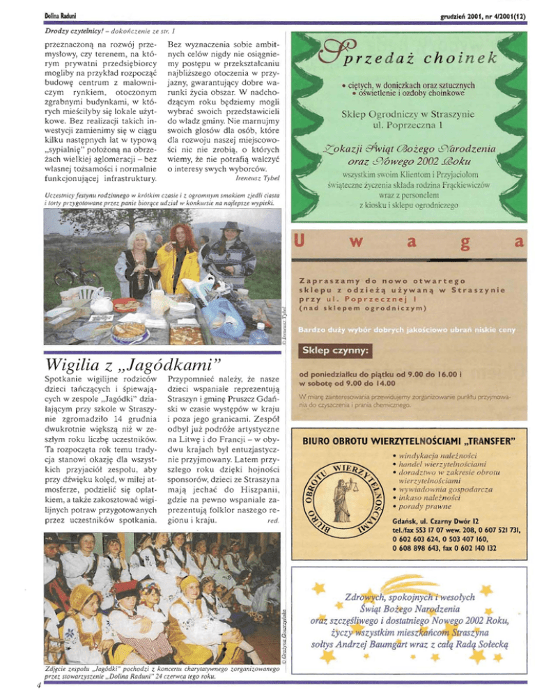 Zdro wych, spokojnych i wesolych 'swiqt Boiego Narodzenia otaz szcz~liwego i dostatniego Nowego 2002 Roku, zyczy wszystkim mieszkancom Straszyna soltys Andrzej Baumgart wraz z calq Radtj Soleckq Zdjrcie zespolu "Jag6dki" pochodzi z koncerru charylarylVnego zorganizolVanego