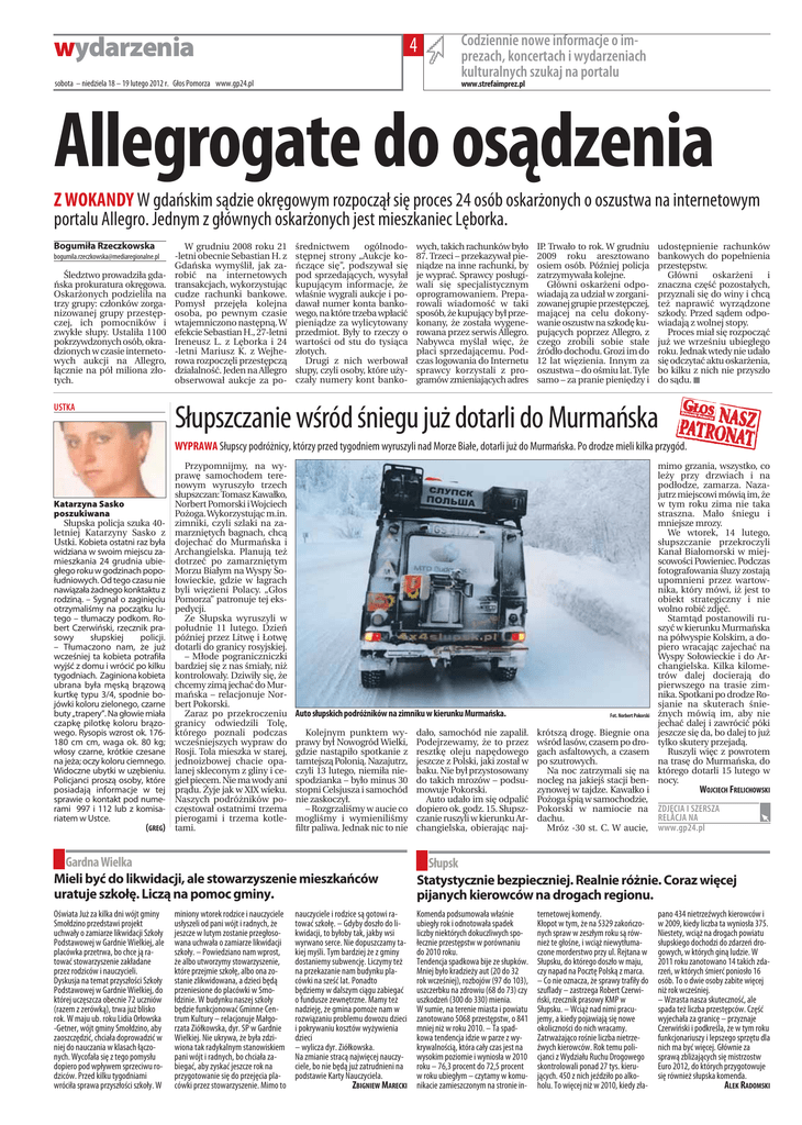 wydarzenia 4 sobota – niedziela 18 – 19 lutego 2012 r. Głos Pomorza www.gp24.pl Codziennie nowe informacje o imprezach, koncertach i wydarzeniach kulturalnych szukaj na portalu www.strefaimprez.pl Allegrogate do osądzenia Z WOKANDY W gdańskim sądzie okręgowym rozpoczął się proces 24 osób oskarżonych o oszustwa na internetowym portalu Allegro. Jednym z głównych oskarżonych jest mieszkaniec Lęborka. Bogumiła Rzeczkowska [email protected] Śledztwo prowadziła gdańska prokuratura okręgowa. Oskarżonych podzieliła na trzy grupy: członków zorganizowanej grupy przestępczej, ich pomocników i zwykłe słupy. Ustaliła 1100 pokrzywdzonych osób, okradzionych w czasie internetowych aukcji na Allegro, łącznie na pół miliona złotych. USTKA W grudniu 2008 roku 21 -letni obecnie Sebastian H. z Gdańska wymyślił, jak zarobić na internetowych transakcjach, wykorzystując cudze rachunki bankowe. Pomysł przejęła kolejna osoba, po pewnym czasie wtajemniczono następną. W efekcie Sebastian H., 27-letni Ireneusz L. z Lęborka i 24 -letni Mariusz K. z Wejherowa rozpoczęli przestępczą działalność. Jeden na Allegro obserwował aukcje za po- średnictwem ogólnodostępnej strony „Aukcje kończące się”, podszywał się pod sprzedających, wysyłał kupującym informacje, że właśnie wygrali aukcje i podawał numer konta bankowego, na które trzeba wpłacić pieniądze za wylicytowany przedmiot. Były to rzeczy o wartości od stu do tysiąca złotych. Drugi z nich werbował słupy, czyli osoby, które użyczały numery kont banko- wych, takich rachunków było 87. Trzeci – przekazywał pieniądze na inne rachunki, by je wyprać. Sprawcy posługiwali się specjalistycznym oprogramowaniem. Preparowali wiadomość w taki sposób, że kupujący był przekonany, że została wygenerowana przez serwis Allegro. Nabywca myślał więc, że płaci sprzedającemu. Podczas logowania do Internetu sprawcy korzystali z programów zmieniających adres IP. Trwało to rok. W grudniu 2009 roku aresztowano osiem osób. Później policja zatrzymywała kolejne. Główni oskarżeni odpowiadają za udział w zorganizowanej grupie przestępczej, mającej na celu dokonywanie oszustw na szkodę kupujących poprzez Allegro, z czego zrobili sobie stałe źródło dochodu. Grozi im do 12 lat więzienia. Innym za oszustwa – do ośmiu lat. Tyle samo – za pranie pieniędzy i udostępnienie rachunków bankowych do popełnienia przestępstw. Główni oskarżeni i znaczna część pozostałych, przyznali się do winy i chcą też naprawić wyrządzone szkody. Przed sądem odpowiadają z wolnej stopy. Proces miał się rozpocząć już we wrześniu ubiegłego roku. Jednak wtedy nie udało się odczytać aktu oskarżenia, bo kilku z nich nie przyszło do sądu. d Słupszczanie wśród śniegu już dotarli do Murmańska WYPRAWA Słupscy podróżnicy, którzy przed tygodniem wyruszyli nad Morze Białe, dotarli już do Murmańska. Po drodze mieli kilka przygód. Katarzyna Sasko poszukiwana Słupska policja szuka 40letniej Katarzyny Sasko z Ustki. Kobieta ostatni raz była widziana w swoim miejscu zamieszkania 24 grudnia ubiegłego roku w godzinach popołudniowych. Od tego czasu nie nawiązała żadnego konktaktu z rodziną. – Sygnał o zaginięciu otrzymaliśmy na początku lutego – tłumaczy podkom. Robert Czerwiński, rzecznik prasowy słupskiej policji. – Tłumaczono nam, że już wcześniej ta kobieta potrafiła wyjść z domu i wrócić po kilku tygodniach. Zaginiona kobieta ubrana była męską brązową kurtkę typu 3/4, spodnie bojówki koloru zielonego, czarne buty „trapery”. Na głowie miała czapkę pilotkę koloru brązowego. Rysopis wzrost ok. 176180 cm cm, waga ok. 80 kg; włosy czarne, krótkie czesane na jeża; oczy koloru ciemnego. Widoczne ubytki w uzębieniu. Policjanci proszą osoby, które posiadają informacje w tej sprawie o kontakt pod numerami 997 i 112 lub z komisariatem w Ustce. (GREG) Przypomnijmy, na wyprawę samochodem terenowym wyruszyło trzech słupszczan: Tomasz Kawałko, Norbert Pomorski i Wojciech Pożoga. Wykorzystując m.in. zimniki, czyli szlaki na zamarzniętych bagnach, chcą dojechać do Murmańska i Archangielska. Planują też dotrzeć po zamarzniętym Morzu Białym na Wyspy Sołowieckie, gdzie w łagrach byli więzieni Polacy. „Głos Pomorza” patronuje tej ekspedycji. Ze Słupska wyruszyli w południe 11 lutego. Dzień później przez Litwę i Łotwę dotarli do granicy rosyjskiej. – Młode pograniczniczki bardziej się z nas śmiały, niż kontrolowały. Dziwiły się, że chcemy zimą jechać do Murmańska – relacjonuje Norbert Pokorski. Zaraz po przekroczeniu granicy odwiedzili Tolę, którego poznali podczas wcześniejszych wypraw do Rosji. Tola mieszka w starej, jednoizbowej chacie opalanej skleconym z gliny i cegieł piecem. Nie ma wody ani prądu. Żyje jak w XIX wieku. Naszych podróżników poczęstował ostatnimi trzema pierogami i trzema kotletami. Auto słupskich podróżników na zimniku w kierunku Murmańska. Kolejnym punktem wyprawy był Nowogród Wielki, gdzie nastąpiło spotkanie z tamtejszą Polonią. Nazajutrz, czyli 13 lutego, niemiła niespodzianka – było minus 30 stopni Celsjusza i samochód nie zaskoczył. – Rozgrzaliśmy w aucie co mogliśmy i wymieniliśmy filtr paliwa. Jednak nic to nie Gardna Wielka Mieli być do likwidacji, ale stowarzyszenie mieszkańców uratuje szkołę. Liczą na pomoc gminy. Oświata Już za kilka dni wójt gminy Smołdzino przedstawi projekt uchwały o zamiarze likwidacji Szkoły Podstawowej w Gardnie Wielkiej, ale placówka przetrwa, bo chce ją ratować stowarzyszenie zakładane przez rodziców i nauczycieli. Dyskusja na temat przyszłości Szkoły Podstawowej w Gardnie Wielkiej, do której uczęszcza obecnie 72 uczniów (razem z zerówką), trwa już blisko rok. W maju ub. roku Lidia Orłowska -Getner, wójt gminy Smołdzino, aby zaoszczędzić, chciała doprowadzić w niej d