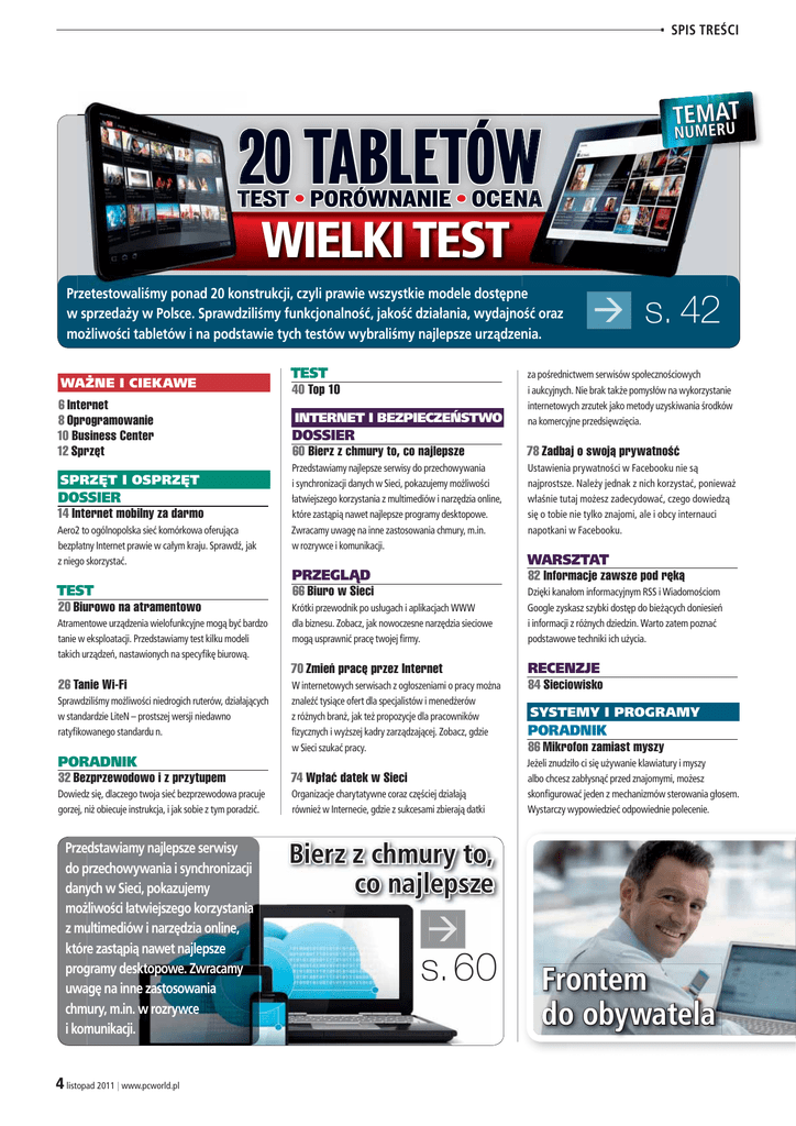 SPIS TREŚCI T TEMEA RU 20 TABLETÓW NUM TEST • PORÓWNANIE • OCENA WIELKI TEST Przetestowaliśmy ponad 20 konstrukcji, czyli prawie wszystkie modele dostępne w sprzedaży w Polsce. Sprawdziliśmy funkcjonalność, jakość działania, wydajność oraz możliwości tabletów i na podstawie tych testów wybraliśmy najlepsze urządzenia. WAŻNE I CIEKAWE 6 Internet 8 Oprogramowanie 10 Business Center 12 Sprz÷t SPRZĘT I OSPRZĘT DOSSIER 14 Internet mobilny za darmo Aero2 to ogólnopolska sieć komórkowa oferująca bezpłatny Internet prawie w całym kraju. Sprawdź, jak z niego skorzystać. TEST 20 Biurowo na atramentowo Atramentowe urządzenia wielofunkcyjne mogą być bardzo tanie w eksploatacji. Przedstawiamy test kilku modeli takich urządzeń, nastawionych na specyfikę biurową. 26 Tanie Wi-Fi Sprawdziliśmy możliwości niedrogich ruterów, działających w standardzie LiteN – prostszej wersji niedawno ratyfikowanego standardu n. PORADNIK TEST INTERNET I BEZPIECZEŃSTWO za pośrednictwem serwisów społecznościowych i aukcyjnych. Nie brak także pomysłów na wykorzystanie internetowych zrzutek jako metody uzyskiwania środków na komercyjne przedsięwzięcia. 60 Bierz z chmury to, co najlepsze 78 Zadbaj o swojã prywatnoijå Przedstawiamy najlepsze serwisy do przechowywania i synchronizacji danych w Sieci, pokazujemy możliwości łatwiejszego korzystania z multimediów i narzędzia online, które zastąpią nawet najlepsze programy desktopowe. Zwracamy uwagę na inne zastosowania chmury, m.in. w rozrywce i komunikacji. Ustawienia prywatności w Facebooku nie są najprostsze. Należy jednak z nich korzystać, ponieważ właśnie tutaj możesz zadecydować, czego dowiedzą się o tobie nie tylko znajomi, ale i obcy internauci napotkani w Facebooku. 40 Top 10 DOSSIER PRZEGLĄD Krótki przewodnik po usługach i aplikacjach WWW dla biznesu. Zobacz, jak nowoczesne narzędzia sieciowe mogą usprawnić pracę twojej firmy. Dzięki kanałom informacyjnym RSS i Wiadomościom Google zyskasz szybki dostęp do bieżących doniesień i informacji z różnych dziedzin. Warto zatem poznać podstawowe techniki ich użycia. 70 Zmieġ prac÷ przez Internet RECENZJE W internetowych serwisach z ogłoszeniami o pracy można znaleźć tysiące ofert dla specjalistów i menedżerów z różnych branż, jak też propozycje dla pracowników fizycznych i wyższej kadry zarządzającej. Zobacz, gdzie w Sieci szukać pracy. 84 Sieciowisko 32 Bezprzewodowo i z przytupem 74 Wpğaå datek w Sieci Organizacje charytatywne coraz częściej działają również w Internecie, gdzie z sukcesami zbierają datki 4 listopad 2011 | www.pcworld.pl WARSZTAT 82 Informacje zawsze pod r÷kã 66 Biuro w Sieci Dowiedz się, dlaczego twoja sieć bezprzewodowa pracuje gorzej, niż obiecuje instrukcja, i jak sobie z tym poradzić. Przedstawiamy najlepsze serwisy do przechowywania i synchronizacji danych w Sieci, pokazujemy możliwości łatwiejszego korzystania z multimediów i narzędzia online, które zastąpią nawet najlepsze programy desktopowe. Zwracamy uwagę na inne zastosowania chmury, m.in. w rozrywce i komunikacji. Æ s. 42 SYSTEMY I PROGRAMY PORADNIK 86 Mikrofon zamiast myszy Jeżeli znudziło ci się używanie klawiatury i myszy albo chcesz zabłysnąć przed znajomymi, możesz skonfigurować jeden z mechanizmów sterowania głosem. Wystarczy wypowiedzieć odpowiednie polecenie. Bierz z chmury to, co najlepsze s. 60 Frontem do obywatela SPIS TREŚCI Wiele osób może czytać wszystko, co piszesz w korespondencji e-mail. Na szczęście są sposoby zabezpieczenia się przed pocztowym szpiegowaniem. Redakcja Stop pocztowym podglądaczom! Æ s.116 Dominik Błaszczykiewicz Ludwik Krakowiak Jerzy Krupiński Paweł Brągoszewski Maciej Kluk Krzysztof Daszkiewicz Robert Szyszka Edward Wawrzyniak Paweł Wimmer redaktor naczelny zastępca redaktora naczelnego sekretarz redakcji DVD manager redaktor działu Ważne i Ciekawe redaktor działu Know How redaktor działu Systemy i Programy redaktor działu Sprzęt i Osprzęt redaktor działu Internet i Bezpieczeństwo Sekretariat Joanna Cierkońska korekta Laboratorium Edward Wawrzyniak Marek Czapelski Michał Reinholz Dawid Kosiński kierownik Laboratorium redaktor, testy redaktor, testy redaktor, testy Zgłoszenia sprzętu do testów Sławomir Kołak, tel. 22 3217730 [email protected] PRZEGLĄD WARSZTAT 92 Pierwsze wraőenia z Windows 8 110 PDF? To proste! [email protected] Sprawdzamy pierwszą publicznie dostępną wersję systemu Windows 8. Produkt oferuje wiele nowych rozwiązań, usprawnia wykorzystanie ekranów dotykowych i w znacznej mierze zintegrowany jest z chmurą obliczeniową. Dowiedz się, jak tworzyć dokumenty w formacie PDF i modyfikować ich treść – pomoże ci w tym nasz poradnik. Opisujemy narzędzia do bezpłatnej edycji, komentowania i zapisywania PDF-ów i wskazujemy, jak z nich efektywnie korzystać. Zgłoszenia programów do działu Download PRZEWODNIK RECENZJE 94 Frontem do obywatela 112 Nowoijci rynku Platforma ePUAP daje możliwość załatwiania spraw urzędowych o każdej porze dnia bez wychodzenia z domu. Wszystko, czego potrzebujesz, to komputer z dostępem do Internetu. TEST 100 Elektroniczny ksi÷gowy Gdy nie wystarcza ci na opłacenie rachunków lub przygniatają cię raty kredytu, zastanów się, czy twój budżet domowy jest dobrze skonstruowany. Zleć to zadanie dobrej aplikacji. Dzięki naszemu testowi poznasz możliwości oprogramowania do zarządzania finansami. 106 Oglãdaj filmy bez nerwów Idealny odtwarzacz wideo musi spełniać wiele wymogów, by zadowolić domowego użytkownika. Dlatego przetestowaliśmy najpopularniejsze aplikacje umożliwiające oglądanie filmów z komputera. KNOW HOW DOSSIER 116 Stop pocztowym podglãdaczom! Wiele osób może czytać wszystko, co piszesz w korespondencji e-mail. Na szczęście są sposoby zabezpieczenia się przed pocztowym szpiegowaniem – jeden z nich to szyfrowanie skrzynki e-mail.
