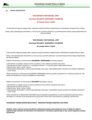 Powiatowy Urząd Pracy w Opolu http://pup.opole.pl/wydarzenie/268/uwaga-bezrobotni UWAGA BEZROBOTNI MINI-BROWAR I RESTAURACJA „SPIŻ” poszukuje KUCHARZY, BARMANÓW I KELNERÓW do nowego lokalu w Opolu O zatrudnienie mogą się ubiegać tylko i wyłącznie osoby bezrobotne zarejestrowane w Powiatowym Urzędzie Pracy w Opolu. Osoby, które pozostają bez zatrudnienia, a nie uczą się w systemie dziennym i są zainteresowane ofertą mogą zarejestrować się jako bezrobotne. MINI-BROWAR I RESTAURACJA „SPIŻ” poszukuje KUCHARZY, BARMANÓW I KELNERÓW do nowego lokalu w Opolu O zatrudnienie mogą się ubiegać tylko i wyłącznie osoby bezrobotne zarejestrowane w Powiatowym Urzędzie Pracy w Opolu. Osoby, które pozostają bez zatrudnienia, a nie uczą się w systemie dziennym i są zainteresowane ofertą mogą zarejestrować się jako bezrobotne. Osobom zatrudnionym na stanowiskach KELNERÓW I BARMANÓW pracodawca oferuje: ● ● ● ● Zatrudnienie na umowę o pracę na okres co najmniej 2 lat w pełnym wymiarze czasu pracy, Wynagrodzenie 2200 zł. brutto/ m-c + prowizję od obrotów + co najmniej jeden ciepły posiłek dziennie, Miejsce pracy: Opole , Rynek –Ratusz, Wykonywanie obowiązków w ramach równoważnego czasu pracy. Lokal będzie otwarty od wtorku do niedzieli w godzinach 12.00- 24.00. Osoby zatrudnione na stanowiskach KELNERÓW I BARMANÓW powinny posiadać wykształcenie co najmniej zasadnicze, mile widziane doświadczenie w pracy na podobnych stanowiskach. Osobom zatrudnionym na stanowiskach KUCHARZY pracodawca oferuje: ● ● ● ● Zatrudnienie na umowę o pracę na okres co najmniej 2 lat w pełnym wymiarze czasu pracy, Wynagrodzenie 2700 zł. brutto/ m-c, Miejsce pracy: Opole , Rynek –Ratusz, Wykonywanie obowiązków w ramach równoważnego czasu pracy. Lokal będzie otwarty od wtorku do niedzieli w godzinach 12.00- 24.00. Osoby zatrudnione na stanowiskach KUCHARZY powinny posiadać wykształcenie co najmniej zasadnicze gastronomiczne, wymagane co najmniej roczne doświadczenie w pracy jako kucharz lub na stanowiskach o podobnym zakresie prac. PLANOWANY TERMIN ROZPOCZĘCIA PRACY: PIERWSZA POŁOWA KWIETNIA 2016 ROKU UWAGA: Osoby wybrane przez pracodawcę zobowiązane będą przed podjęciem pracy w Opolu do odbycia tygodniowego szkolenia we Wrocławiu lub Katowicach. Pracodawca gwarantuje w tym czasie bezpłatny nocleg i wyżywienie. Zainteresowane osoby prosimy o przesyłanie CV wraz listem motywacyjnym na adres: [email protected] w terminie do 11 marca 2016 r. do godziny 12.00. W temacie e-maila proszę podać nazwę stanowiska, na które osoba będzie aplikować np. KUCHARZ Prosimy o umieszczenie w CV następującej klauzuli: "Wyrażam zgodę na przetwarzanie moich danych osobowych zawartych w mojej ofercie pracy dla potrzeb niezbędnych do realizacji procesu rekrutacji (zgodnie z ustawą z dnia 29.08.1997 r. o Ochronie Danych Osobowych ( t.j. Dz. U. z 2015 r. poz. 2135 z późn. zm. ). W dniu 11 marca 2016 r. pracownicy urzędu skontaktują się z wybranymi osobami i podadzą termin bezpośredniego spotkania z pracodawcą