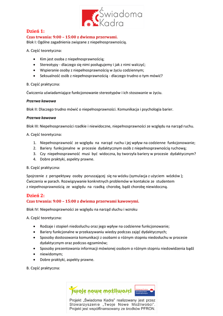 Dzień 1: Czas trwania: 9:00 – 15:00 z dwiema przerwami. Blok I: Ogólne zagadnienia związane z niepełnosprawnością. A. Część teoretyczna: Kim jest osoba z niepełnosprawnością; Stereotypy - dlaczego się nimi posługujemy i jak z nimi walczyć; Wspieranie osoby z niepełnosprawnością w życiu codziennym; Seksualność osób z niepełnosprawnością - dlaczego trudno o tym mówić? B. Część praktyczna: Ćwiczenia uświadamiające funkcjonowanie stereotypów i ich stosowanie w życiu. Przerwa kawowa Blok II: Dlaczego trudno mówić o niepełnosprawności. Komunikacja i psychologia barier. Przerwa kawowa Blok III: Niepełnosprawności rzadkie i niewidoczne, niepełnosprawności ze względu na narząd ruchu. A. Część teoretyczna: 1. 2. 3. 4. Niepełnosprawność ze względu na narząd ruchu i jej wpływ na codzienne funkcjonowanie; Bariery funkcjonalne w procesie dydaktycznym osób z niepełnosprawnością ruchową; Czy niepełnosprawność musi być widoczna, by tworzyła bariery w procesie dydaktycznym? Dobre praktyki, aspekty prawne. B. Część praktyczna: Spojrzenie z perspektywy osoby poruszającej się na wózku (symulacja z użyciem wózków ); Ćwiczenia w parach. Rozwiązywanie konkretnych problemów w kontakcie ze studentem z niepełnosprawnością ze względu na rzadką chorobę, bądź chorobę niewidoczną. Dzień 2: Czas trwania: 9:00 – 15:00 z dwiema przerwami kawowymi. Blok IV: Niepełnosprawności ze względu na narząd słuchu i wzroku A. Część teoretyczna: Rodzaje i stopień niedosłuchu oraz jego wpływ na codzienne funkcjonowanie; Bariery funkcjonalne w przekazywaniu wiedzy podczas zajęć dydaktycznych; Sposoby dostosowania komunikacji z osobami o różnym stopniu niedosłuchu w procesie dydaktycznym oraz podczas egzaminów; Sposoby prezentowania informacji mówionej osobom o różnym stopniu niedowidzenia bądź niewidomym; Dobre praktyki, aspekty prawne. B. Część praktyczna: Zapoznanie ze metodami wspomagającym proces dydaktyczny osób z niepełnosprawnością narządu słuchu; Spojrzenie z perspektywy osób z niedosłuchem. Przerwa kawowa Blok V: Niepełnosprawności neurologiczne i ze względu na zdrowie psychiczne. A. Część teoretyczna: 1. Różne rodzaje schorzeń neurologicznych; 2. Bariery funkcjonalne w procesie dydaktycznym u osób z niepełnosprawnościami neurologicznymi; 3. Różne rodzaje chorób o podłożu psychicznym; 4. Bariery funkcjonalne w procesie dydaktycznym u osób z niepełnosprawnościami o podłożu psychicznym; 5. Dobre praktyki, aspekty prawne. B. Część praktyczna: Ćwiczenia w parach. Rozwiązywanie konkretnych problemów w kontakcie ze studentem z niepełno sprawnością neurologiczną bądź ze względu na chorobę psychiczną. Przerwa kawowa Blok VI: Osoba z niepełnosprawnością, jej wykształcenie i przyszłość na ryku pracy. Każdy blok trwa około 1:45 minut. Czas realizacji poszczególnych bloków zależeć jednak będzie od dynamiki grupy i jej rzeczywistych zapotrzebowań na wiedzę z konkretnego zakresu.
