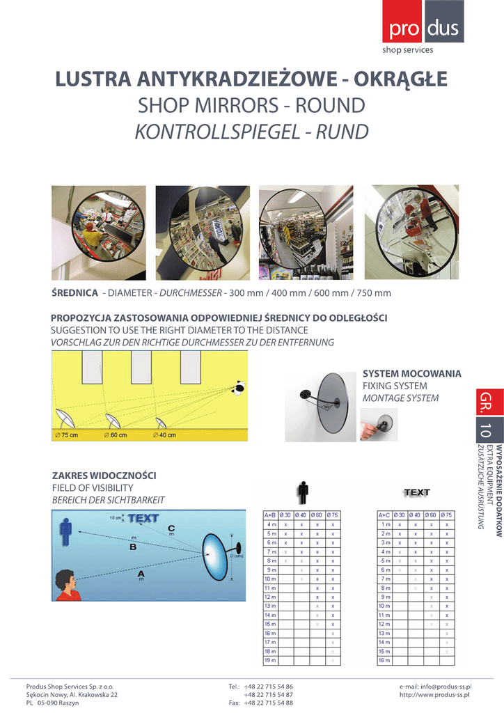 LUSTRA ANTYKRADZIEŻOWE - OKRĄGŁE SHOP MIRRORS - ROUND KONTROLLSPIEGEL - RUND ŚREDNICA - DIAMETER - DURCHMESSER - 300 mm / 400 mm / 600 mm / 750 mm PROPOZYCJA ZASTOSOWANIA ODPOWIEDNIEJ ŚREDNICY DO ODLEGŁOŚCI SUGGESTION TO USE THE RIGHT DIAMETER TO THE DISTANCE VORSCHLAG ZUR DEN RICHTIGE DURCHMESSER ZU DER ENTFERNUNG SYSTEM MOCOWANIA FIXING SYSTEM MONTAGE SYSTEM ZAKRES WIDOCZNOŚCI FIELD OF VISIBILITY BEREICH DER SICHTBARKEIT