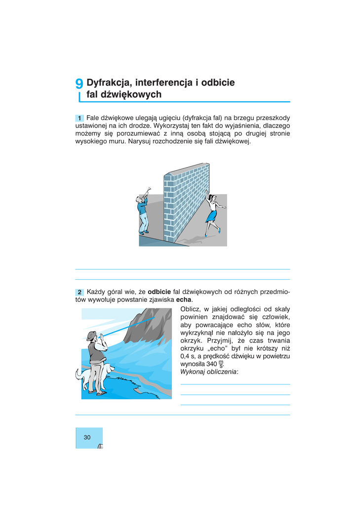 9 Dyfrakcja, interferencja i odbicie fal dêwi´kowych 1 Fale dêwi´kowe ulegajà ugi´ciu (dyfrakcja fal) na brzegu przeszkody ustawionej na ich drodze. Wykorzystaj ten fakt do wyjaÊnienia, dlaczego mo˝emy si´ porozumiewaç z innà osobà stojàcà po drugiej stronie wysokiego muru. Narysuj rozchodzenie si´ fali dêwi´kowej. 2 Ka˝dy góral wie, ˝e odbicie fal dêwi´kowych od ró˝nych przedmiotów wywo∏uje powstanie zjawiska echa. Oblicz, w jakiej odleg∏oÊci od ska∏y powinien znajdowaç si´ cz∏owiek, aby powracajàce echo s∏ów, które wykrzyknà∏ nie na∏o˝y∏o si´ na jego okrzyk. Przyjmij, ˝e czas trwania okrzyku „echo” by∏ nie krótszy ni˝ 0,4 s, a pr´dkoÊç dêwi´ku w powietrzu wynosi∏a 340 m –s. Wykonaj obliczenia: 30 Odpowiedê: Aby cz∏owiek us∏ysza∏ powracajàce echo s∏ów, które wykrzyknà∏ powinien znajdowaç si´ w odleg∏oÊci m od skalnej Êciany. 3 Nak∏adanie si´ dêwi´ków powracajàcych po odbiciu od ró˝nych przedmiotów na dêwi´ki wytwarzane przez êród∏o nazywa si´ pog∏osem. WyjaÊnij, dlaczego zjawisko pog∏osu nie jest korzystne: a) w teatrze? b) w filharmonii? c) *Jak powinny byç budowane sale teatralne i koncertowe, aby przeciwdzia∏aç temu zjawisku? 4 Czas trwania pog∏osu w Baptysterium w Pizie (obok krzywej wie˝y na placu Miracoli), wynosi 20 sekund. Daje to niezwyk∏e wra˝enia dêwi´kowe; podczas demonstrowania tego efektu nie wolno klaskaç! Jakà odleg∏oÊç przebywa w tym czasie dêwi´k, wielokrotnie odbijajàc si´ od Êcian? Wykonaj obliczenia: Odpowiedê: 31