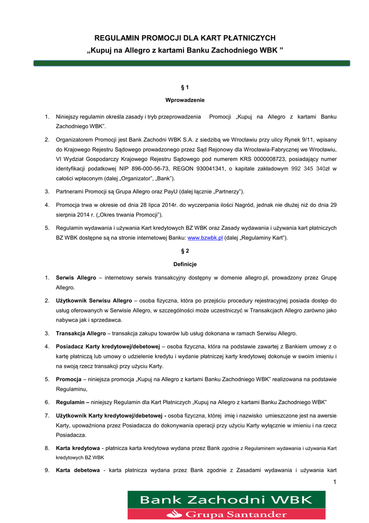 REGULAMIN PROMOCJI DLA KART PŁATNICZYCH „Kupuj na Allegro z kartami Banku Zachodniego WBK ” §1 Wprowadzenie 1. Niniejszy regulamin określa zasady i tryb przeprowadzenia Promocji „Kupuj na Allegro z kartami Banku Zachodniego WBK”. 2. Organizatorem Promocji jest Bank Zachodni WBK S.A. z siedzibą we Wrocławiu przy ulicy Rynek 9/11, wpisany do Krajowego Rejestru Sądowego prowadzonego przez Sąd Rejonowy dla Wrocławia-Fabrycznej we Wrocławiu, VI Wydział Gospodarczy Krajowego Rejestru Sądowego pod numerem KRS 0000008723, posiadający numer identyfikacji podatkowej NIP 896-000-56-73, REGON 930041341, o kapitale zakładowym 992 345 340zł w całości wpłaconym (dalej „Organizator”, „Bank”). 3. Partnerami Promocji są Grupa Allegro oraz PayU (dalej łącznie „Partnerzy”). 4. Promocja trwa w okresie od dnia 28 lipca 2014r. do wyczerpania ilości Nagród, jednak nie dłuŜej niŜ do dnia 29 sierpnia 2014 r. („Okres trwania Promocji”). 5. Regulamin wydawania i uŜywania Kart kredytowych BZ WBK oraz Zasady wydawania i uŜywania kart płatniczych BZ WBK dostępne są na stronie internetowej Banku: www.bzwbk.pl (dalej „Regulaminy Kart”). §2 Definicje 1. Serwis Allegro – internetowy serwis transakcyjny dostępny w domenie allegro.pl, prowadzony przez Grupę Allegro. 2. UŜytkownik Serwisu Allegro – osoba fizyczna, która po przejściu procedury rejestracyjnej posiada dostęp do usług oferowanych w Serwisie Allegro, w szczególności moŜe uczestniczyć w Transakcjach Allegro zarówno jako nabywca jak i sprzedawca. 3. Transakcja Allegro – transakcja zakupu towarów lub usług dokonana w ramach Serwisu Allegro. 4. Posiadacz Karty kredytowej/debetowej – osoba fizyczna, która na podstawie zawartej z Bankiem umowy z o kartę płatniczą lub umowy o udzielenie kredytu i wydanie płatniczej karty kredytowej dokonuje w swoim imieniu i na swoją rzecz transakcji przy uŜyciu Karty. 5. Promocja – niniejsza promocja „Kupuj na Allegro z kartami Banku Zachodniego WBK” realizowana na podstawie Regulaminu, 6. Regulamin – niniejszy Regulamin dla Kart Płatniczych „Kupuj na Allegro z kartami Banku Zachodniego WBK” 7. UŜytkownik Karty kredytowej/debetowej - osoba fizyczna, której imię i nazwisko umieszczone jest na awersie Karty, upowaŜniona przez Posiadacza do dokonywania operacji przy uŜyciu Karty wyłącznie w imieniu i na rzecz Posiadacza. 8. Karta kredytowa - płatnicza karta kredytowa wydana przez Bank zgodnie z Regulaminem wydawania i uŜywania Kart kredytowych BZ WBK 9. Karta debetowa - karta płatnicza wydana przez Bank zgodnie z Zasadami wydawania i uŜywania kart 1 REGULAMIN PROMOCJI DLA KART PŁATNICZYCH „Kupuj na Allegro z kartami Banku Zachodniego WBK ” płatniczych Banku Zachodniego WBK dla ludności 10. Kod Promocyjny – nagroda uprawniająca do uzyskania bonifikaty pienięŜnej przy dokonywaniu kolejnej Transakcji Allegro na zasadach określonych w niniejszym Regulaminie. 11. Uczestnik Promocji – osoba spełniająca warunki określone w § 3 ust. 1 niniejszego Regulaminu. 12. Regulamin Serwisu Allegro- regulamin Serwisu Allegro, którego aktualna treść znajduje się na stronie www.allegro.pl 13. Strona Kodów Promocyjnych – strona internetowa, która umoŜliwia po zalogowaniu się danymi z Serwisu Allegro (tj. email lub login oraz hasło), pobranie przyznanego przez Bank Kodu Promocyjnego, znajdująca się pod następującym adresem https://bzwbk. allegro.pl. 14. Rejestracja do Serwisu Allegro - procedura zakładania konta w Serwisie Allegro na zasadach określonych w Regulaminie Serwisu Allegro. 15. Grupa Allegro - Grupa Allegro Sp. z o.o. z siedzibą w Poznaniu, 60-166 Poznań, przy ul. Grunwaldzkiej 182, wpisana do rejestru przedsiębiorców prowadzonego przez Sąd Rejonowy Poznań – Nowe Miasto i Wilda w Poznaniu, Wydział VIII Gospodarczy Krajowego Rejestru Sądowego pod numerem KRS 0000268796, posiadająca numer identyfikacji podatkowej NIP: 527-25-25-995, o kapitale zakładowym w wysokości 33.976.500,00 zł. 16. PayU - PayU S.A. z siedzibą w Poznaniu 60-166 Poznań, przy ul. Grunwaldzkiej 182, wpisana do rejestru przedsiębiorców prowadzonego przez Sąd Rejonowy Poznań – Nowe Miasto i Wilda w Poznaniu, Wydział VIII Gospodarczy Krajowego Rejestru Sądowego pod numerem KRS 0000274399, posiadająca numer identyfikacji podatkowej NIP: 779-23-08-495, o kapitale zakładowym w wysokości 4.000.000 zł w całości opłaconym. §3 Zasady Promocji 1. Uczestnikiem Promocji moŜe być osoba fizyczna posiadająca pełną zdolność do czynności prawnych, która łącznie spełnia następujące warunki: a) jest Posiadaczem Karty kredytowej/debetowej lub UŜytkownikiem Karty kredytowej/debetowej, b) jest UŜytkownikiem Serwisu Allegro, c) zaakceptuje Regulamin, d) w Okresie trwania Promocji dokona dowolną Transakcję Allegro, za którą dokona płatności Kartą kredytową lub Kartą debetową. 2. Uczestnik Promocji, który w Okresie trwania Promocji dokona dowolnej Transakcji Allegro, za którą dokona płatności Kartą kredytową lub Kartą debetową, otrzyma moŜliwość pobrania Kodu Promocyjnego ze Strony Kodów Promocyjnych. 3. Uczestnik Promocji moŜe otrzymać jeden Kod Promocyjny za dokonanie płatności daną Kartą kredytową lub 2 REGULAMIN PROMOCJI DLA KART PŁATNICZYCH „Kupuj na Allegro z kartami Banku Zachodniego WBK ” Kartą debetową. Dokonanie kolejnej płatności daną Kartą kredytową lub Kartą debetową nie uprawnia do otrzymania kolejnego Kodu Promocyjnego. 4. Bank moŜe wykluczyć Uczestnika Promocji z udziału w Promocji w przypadku, gdy: a) Uczestnik Promocji narusza postanowienia niniejszego Regulaminu lub Regulaminu Serwisu Allegro, b) działa na szkodę Banku lub Partnerów. §4 Nagrody 1. Nagrodami w Promocji są Kody Promocyjne uprawniające do dokonania kolejnej Transakcji Allegro z bonifikatą w wysokości: a) 40 złotych (słownie: czterdzieści złotych) dla Transakcji Allegro opłaco