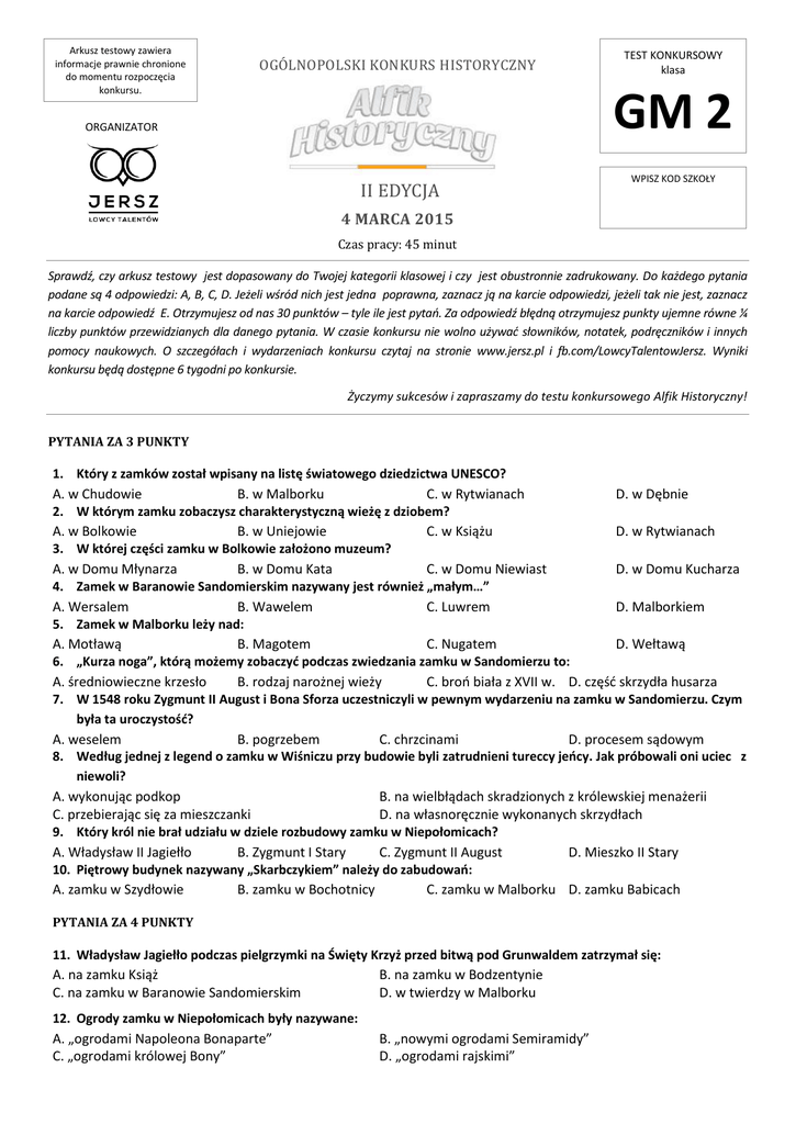 Arkusz testowy zawiera informacje prawnie chronione do momentu rozpoczęcia konkursu. OGÓLNOPOLSKI KONKURS HISTORYCZNY TEST KONKURSOWY klasa GM 2 ORGANIZATOR II EDYCJA WPISZ KOD SZKOŁY 4 MARCA 2015 Czas pracy: 45 minut Sprawdź, czy arkusz testowy jest dopasowany do Twojej kategorii klasowej i czy jest obustronnie zadrukowany. Do każdego pytania podane są 4 odpowiedzi: A, B, C, D. Jeżeli wśród nich jest jedna poprawna, zaznacz ją na karcie odpowiedzi, jeżeli tak nie jest, zaznacz na karcie odpowiedź E. Otrzymujesz od nas 30 punktów – tyle ile jest pytań. Za odpowiedź błędną otrzymujesz punkty ujemne równe ¼ liczby punktów przewidzianych dla danego pytania. W czasie konkursu nie wolno używać słowników, notatek, podręczników i innych pomocy naukowych. O szczegółach i wydarzeniach konkursu czytaj na stronie www.jersz.pl i fb.com/LowcyTalentowJersz. Wyniki konkursu będą dostępne 6 tygodni po konkursie. Życzymy sukcesów i zapraszamy do testu konkursowego Alfik Historyczny! PYTANIA ZA 3 PUNKTY 1. Który z zamków został wpisany na listę światowego dziedzictwa UNESCO? A. w Chudowie B. w Malborku C. w Rytwianach D. w Dębnie 2. W którym zamku zobaczysz charakterystyczną wieżę z dziobem? A. w Bolkowie B. w Uniejowie C. w Książu D. w Rytwianach 3. W której części zamku w Bolkowie założono muzeum? A. w Domu Młynarza B. w Domu Kata C. w Domu Niewiast D. w Domu Kucharza 4. Zamek w Baranowie Sandomierskim nazywany jest również „małym…” A. Wersalem B. Wawelem C. Luwrem D. Malborkiem 5. Zamek w Malborku leży nad: A. Motławą B. Magotem C. Nugatem D. Wełtawą 6. „Kurza noga”, którą możemy zobaczyć podczas zwiedzania zamku w Sandomierzu to: A. średniowieczne krzesło B. rodzaj narożnej wieży C. broń biała z XVII w. D. część skrzydła husarza 7. W 1548 roku Zygmunt II August i Bona Sforza uczestniczyli w pewnym wydarzeniu na zamku w Sandomierzu. Czym była ta uroczystość? A. weselem B. pogrzebem C. chrzcinami D. procesem sądowym 8. Według jednej z legend o zamku w Wiśniczu przy budowie byli zatrudnieni tureccy jeńcy. Jak próbowali oni uciec z niewoli? A. wykonując podkop B. na wielbłądach skradzionych z królewskiej menażerii C. przebierając się za mieszczanki D. na własnoręcznie wykonanych skrzydłach 9. Który król nie brał udziału w dziele rozbudowy zamku w Niepołomicach? A. Władysław II Jagiełło B. Zygmunt I Stary C. Zygmunt II August D. Mieszko II Stary 10. Piętrowy budynek nazywany „Skarbczykiem” należy do zabudowań: A. zamku w Szydłowie B. zamku w Bochotnicy C. zamku w Malborku D. zamku Babicach PYTANIA ZA 4 PUNKTY 11. Władysław Jagiełło podczas pielgrzymki na Święty Krzyż przed bitwą pod Grunwaldem zatrzymał się: A. na zamku Książ B. na zamku w Bodzentynie C. na zamku w Baranowie Sandomierskim D. w twierdzy w Malborku 12. Ogrody zamku w Niepołomicach były nazywane: A. „ogrodami Napoleona Bonaparte” C. „ogrodami królowej Bony” B. „nowymi ogrodami Semiramidy” D. „ogrodami rajskimi” 13. W połowie XIV wieku zamek w Dębnie przeszedł w posiadanie rodu herbu: A. Odrowąż B. Pogoń C. Nałęcz D. Wieniawa 14. Z kim pojednał się na zamku w Janowcu Zygmunt III Waza w 1606 r.? A. z królem Szwecji Karolem XII B. z kniaziem ruskim Nikołajem C. z Mikołajem Zebrzydowskim D. ze swoim synem Władysławem 15. Inicjator budowy zamku w Uniejowie, Jarosław Bogoria Skotnicki, był: A. biskupem krakowskim B. arcybiskupem gnieźnieńskim C. księciem sandomierskim D. kasztelanem poznańskim 16. Jacek Malczewski był autorem obrazu ołtarzowego w kaplicy na zamku: A. w Książu B. w Baranowie Sandomierskim C. w Rytwianach D. w Żywcu 17. Dokąd w poszukiwaniu złota chcieli się dostać rosyjscy żołnierze, którzy zatrzymali się w bolkowskim zamku w 1813? A. do zamkowej kuchni B. do lochu głodowego C. do dawnych królewskich sypialni D. do zamkowej kuźni 18. Jaka budowla barokowa znalazła się w obrębie gotyckich zabudowań zamku w Malborku? A. glorieta B. budynek kolegium jezuickiego C. baszta alkierzowa D. barokowa fontanna 19. Który król Polski jako pierwszy wjechał triumfalnie do zamku krzyżackiego w Malborku? A. Władysław IV Jagiellończyk B. Władysław Jagiełło C. Kazimierz Jagiellończyk D. Zygmunt II August 20. Z zamku w Sandomierzu pozostało tylko skrzydło zachodnie. Kiedy zniszczono pozostałą część? A. Podczas potopu szwedzkiego B. Podczas najazdu mongolskiego C. Podczas zaborów D. Podczas wojny trzydziestoletniej PYTANIA ZA 5 PUNKTÓW 21. Po pierwszym rozbiorze zamek w Niepołomicach: A. przeszedł pod panowanie Prus B. przejęli Rosjanie C. został zajęty przez Austrię D. został w granicach Polski 22. Za biskupa Jana Zadzika w podziemiach zamku w Bodzentynie byli uwięzieni: A. krzyżacy B. arianie i kalwini C. oszuści podatkowi D. książęta piastowscy 23. Odbudową zamku w Janowcu po potopie szwedzkim kierował: A. Tylman z Gameren B. Stefan Czarniecki C. Wit Stwosz D. Wilhelm Humboldt 24. W 1836 roku zamek w Uniejowie stał się własnością rodziny Tollów z: A. Prus B. Łotwy C. Czech D. Estonii 25. Kto zaprojektował witraże w kaplicy zamkowej w Baranowie Sandomierskim? A. Stanisław Wyspiański B. Jan Matejko C. Józef Mehoffer D. Artur Grottger 26. Który z brytyjskich premierów odwiedził zamek Książ? A. Winston Churchill B. David Cameron C. Robert Peel D. William Gladstone 27. Co było powodem wyprawy zbrojnej na zamek w Bolkowie, na czele której w 1468 r. stanął Guncel II Świnka? A. porwanie żony Guncela B. rozboje rycerza Hansa von Tschirnhausa C. heretyckie poglądy właściciela zamku D. odwet za zabójstwo brata Guncela 28. Który z zamków ma według hipotezy dr. Stulina ukrywać w sobie legendarną Bursztynową Komnatę? A. w Baranowie Sandomierskim B. w Uniejowie C. w Żywcu D. w Rzeszowie 29. Prawdopodobnie jedynym w bloku wschodnim właścicielem zamku był Leon Kozłowski, do którego należała twierdza: 