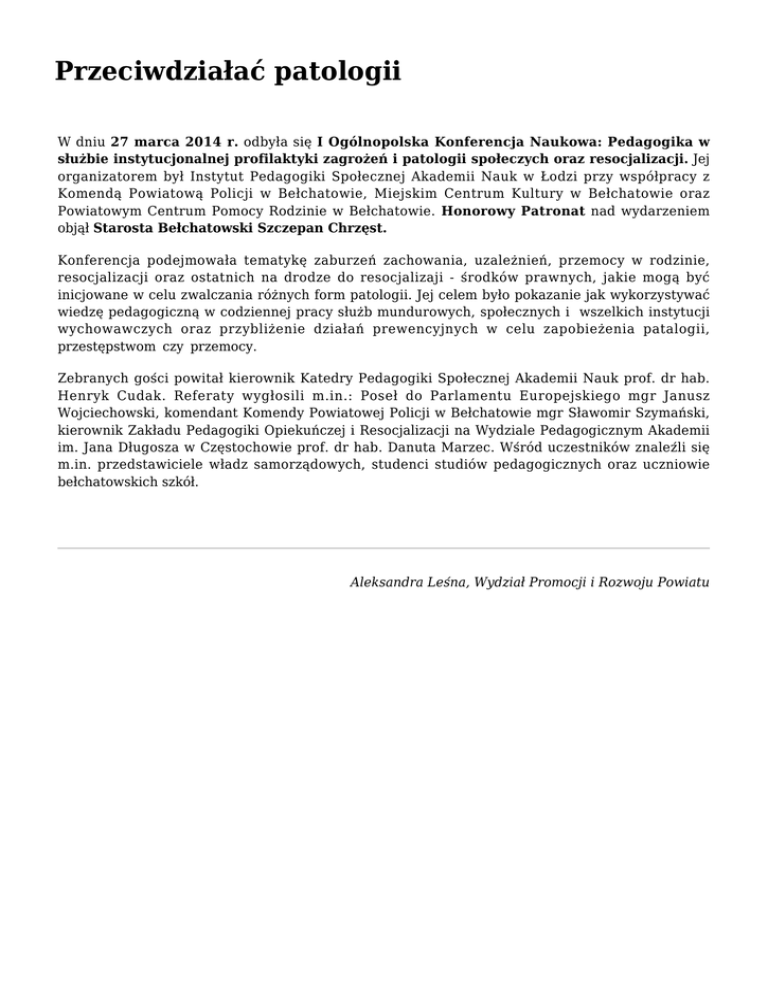 Przeciwdziałać patologii W dniu 27 marca 2014 r. odbyła się I Ogólnopolska Konferencja Naukowa: Pedagogika w służbie instytucjonalnej profilaktyki zagrożeń i patologii społeczych oraz resocjalizacji. Jej organizatorem był Instytut Pedagogiki Społecznej Akademii Nauk w Łodzi przy współpracy z Komendą Powiatową Policji w Bełchatowie, Miejskim Centrum Kultury w Bełchatowie oraz Powiatowym Centrum Pomocy Rodzinie w Bełchatowie. Honorowy Patronat nad wydarzeniem objął Starosta Bełchatowski Szczepan Chrzęst. Konferencja podejmowała tematykę zaburzeń zachowania, uzależnień, przemocy w rodzinie, resocjalizacji oraz ostatnich na drodze do resocjalizaji - środków prawnych, jakie mogą być inicjowane w celu zwalczania różnych form patologii. Jej celem było pokazanie jak wykorzystywać wiedzę pedagogiczną w codziennej pracy służb mundurowych, społecznych i wszelkich instytucji wychowawczych oraz przybliżenie działań prewencyjnych w celu zapobieżenia patalogii, przestępstwom czy przemocy. Zebranych gości powitał kierownik Katedry Pedagogiki Społecznej Akademii Nauk prof. dr hab. Henryk Cudak. Referaty wygłosili m.in.: Poseł do Parlamentu Europejskiego mgr Janusz Wojciechowski, komendant Komendy Powiatowej Policji w Bełchatowie mgr Sławomir Szymański, kierownik Zakładu Pedagogiki Opiekuńczej i Resocjalizacji na Wydziale Pedagogicznym Akademii im. Jana Długosza w Częstochowie prof. dr hab. Danuta Marzec. Wśród uczestników znaleźli się m.in. przedstawiciele władz samorządowych, studenci studiów pedagogicznych oraz uczniowie bełchatowskich szkół. Aleksandra Leśna, Wydział Promocji i Rozwoju Powiatu