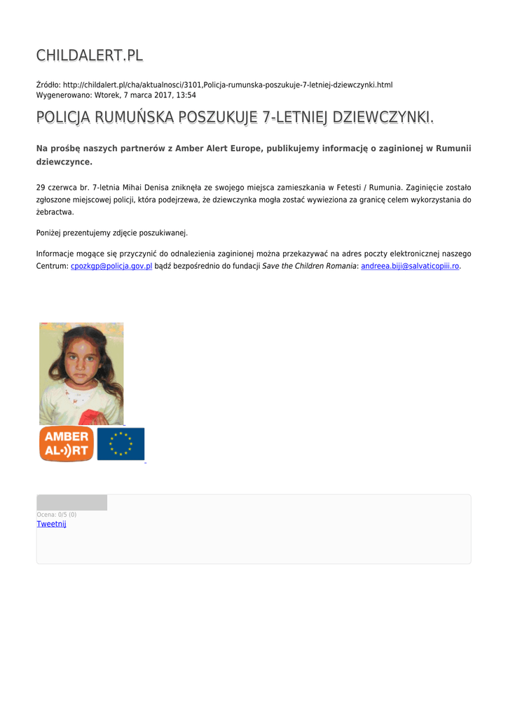CHILDALERT.PL Źródło: http://childalert.pl/cha/aktualnosci/3101,Policja-rumunska-poszukuje-7-letniej-dziewczynki.html Wygenerowano: Wtorek, 7 marca 2017, 13:54 POLICJA RUMUŃSKA POSZUKUJE 7-LETNIEJ DZIEWCZYNKI. Na prośbę naszych partnerów z Amber Alert Europe, publikujemy informację o zaginionej w Rumunii dziewczynce. 29 czerwca br. 7-letnia Mihai Denisa zniknęła ze swojego miejsca zamieszkania w Fetesti / Rumunia. Zaginięcie zostało zgłoszone miejscowej policji, która podejrzewa, że dziewczynka mogła zostać wywieziona za granicę celem wykorzystania do żebractwa. Poniżej prezentujemy zdjęcie poszukiwanej. Informacje mogące się przyczynić do odnalezienia zaginionej można przekazywać na adres poczty elektronicznej naszego Centrum: [email protected] bądź bezpośrednio do fundacji Save the Children Romania: [email protected]. Ocena: 0/5 (0) Tweetnij