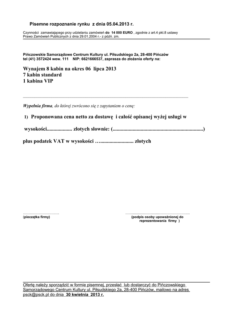 Pisemne rozpoznanie rynku z dnia 05.04.2013 r. Czynności zamawiającego przy udzielaniu zamówień do 14 000 EURO , zgodnie z art.4 pkt.8 ustawy Prawo Zamówień Publicznych z dnia 29.01.2004 r.- z późń. zm. Pińczowskie Samorządowe Centrum Kultury ul. Piłsudskiego 2a, 28-400 Pińczów tel (41) 3572424 wew. 111 NIP: 6621666537, zaprasza do złożenia oferty na: Wynajem 8 kabin na okres 06 lipca 2013 7 kabin standard 1 kabina VIP _______________________________________________________________________________________ Wypełnia firma, do której zwrócono się z zapytaniem o cenę: 1) Proponowana cena netto za dostawę i całość opisanej wyżej usługi w wysokości................... złotych słownie: (....................................................................) plus podatek VAT w wysokości …......................... złotych ………………………….. (pieczątka firmy) …….............................……………………... (podpis osoby upoważnionej do reprezentowania firmy ) Ofertę należy sporządzić w formie pisemnej, przesłać lub dostarczyć do Pińczowskiego Samorządowego Centrum Kultury ul. Piłsudskiego 2a, 28-400 Pińczów, mailowo na adres [email protected] do dnia 30 kwietnia 2013 r.