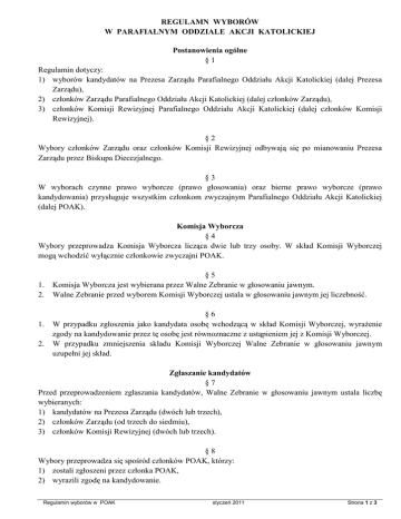 REGULAMN WYBORÓW W PARAFIALNYM ODDZIALE AKCJI KATOLICKIEJ Postanowienia ogólne §1 Regulamin dotyczy: 1) wyborów kandydatów na Prezesa Zarządu Parafialnego Oddziału Akcji Katolickiej (dalej Prezesa Zarządu), 2) członków Zarządu Parafialnego Oddziału Akcji Katolickiej (dalej członków Zarządu), 3) członków Komisji Rewizyjnej Parafialnego Oddziału Akcji Katolickiej (dalej członków Komisji Rewizyjnej). §2 Wybory członków Zarządu oraz członków Komisji Rewizyjnej odbywają się po mianowaniu Prezesa Zarządu przez Biskupa Diecezjalnego. §3 W wyborach czynne prawo wyborcze (prawo głosowania) oraz bierne prawo wyborcze (prawo kandydowania) przysługuje wszystkim członkom zwyczajnym Parafialnego Oddziału Akcji Katolickiej (dalej POAK). Komisja Wyborcza §4 Wybory przeprowadza Komisja Wyborcza licząca dwie lub trzy osoby. W skład Komisji Wyborczej mogą wchodzić wyłącznie członkowie zwyczajni POAK. 1. 2. 1. 2. §5 Komisja Wyborcza jest wybierana przez Walne Zebranie w głosowaniu jawnym. Walne Zebranie przed wyborem Komisji Wyborczej ustala w głosowaniu jawnym jej liczebność. §6 W przypadku zgłoszenia jako kandydata osobę wchodzącą w skład Komisji Wyborczej, wyraŜenie zgody na kandydowanie przez tę osobę jest równoznaczne z ustąpieniem jej z Komisji Wyborczej. W przypadku zmniejszenia składu Komisji Wyborczej Walne Zebranie w głosowaniu jawnym uzupełni jej skład. Zgłaszanie kandydatów §7 Przed przeprowadzeniem zgłaszania kandydatów, Walne Zebranie w głosowaniu jawnym ustala liczbę wybieranych: 1) kandydatów na Prezesa Zarządu (dwóch lub trzech), 2) członków Zarządu (od trzech do siedmiu), 3) członków Komisji Rewizyjnej (dwóch lub trzech). §8 Wybory przeprowadza się spośród członków POAK, którzy: 1) zostali zgłoszeni przez członka POAK, 2) wyrazili zgodę na kandydowanie. Regulamin wyborów w POAK styczeń 2011 Strona 1 z 3 §9 KaŜdy członek POAK obecny na Walnym Zebraniu moŜe zgłosić pisemnie lub ustnie tylu kandydatów, ile osób w danych wyborach jest wybieranych. § 10 Po zakończeniu zgłaszania kandydatów Komisja Wyborcza sporządza listę osób kandydujących w kolejności alfabetycznej (listę wyborczą). Na liście umieszcza wszystkich zgłoszonych kandydatów, którzy wyrazili zgodę na kandydowanie i są członkami POAK. § 11 Przed głosowaniem kaŜdy członek POAK ma prawo zadawać pytania osobom kandydującym. Głosowanie § 12 Wybory są waŜne, o ile uczestniczyła w nich co najmniej połowa członków POAK. § 13 W wyborach kaŜdy uczestnik Walnego Zebrania moŜe oddać głos na tylu kandydatów, ile osób jest wybieranych. Oddanie głosu na większą liczbę kandydatów powoduje jego niewaŜność. § 14 Głosowanie jest tajne. Oddanie głosu na daną osobę oznacza się znakiem „X” obok jej nazwiska na liście wyborczej. Ustalenie wyników wyborów sytuacji § 15 Wybrane zostają osoby, które uzyskały kolejno największą liczbę głosów. § 16 W przypadku uzyskania w wyborach przez dwóch lub więcej kandydatów równej liczby głosów, a wynik głosowania wskazuje, Ŝe tylko niektórzy z nich powinni zostać wybrani, przeprowadza się drugą turę wyborów pomiędzy tymi kandydatami. Przy ustaleniu wyników wyborów stosuje się § 15. Protokół z wyborów § 17 Komisja Wyborcza sporządza protokół z przeprowadzonych wyborów zawierający: 1) skład Komisji Wyborczej, 2) datę wyborów, 3) nazwę funkcji lub organu, do którego przeprowadzono wybory, 4) rozstrzygnięcie co do liczby wybieranych osób, 5) wykaz osób zgłoszonych przez członków POAK, 6) wykaz osób umieszczonych na liście kandydatów, 7) liczbę oddanych głosów , 8) liczbę głosów waŜnych oraz głosów niewaŜnych, 9) liczbę głosów uzyskanych przez poszczególnych kandydatów, 10) wykaz osób wybranych, 11) stwierdzenie czy istnieje konieczność przeprowadzenia drugiej tury wyborów, 12) dane dotyczące drugiej tury wyborów, wymienione wyŜej, Regulamin wyborów w POAK styczeń 2011 Strona 2 z 3 13) miejsce i datę sporządzenia protokołu oraz podpisy członków Komisji. Postanowienia końcowe § 18 Przed przystąpieniem do procedury wyborczej powinna mieć miejsce wspólna modlitwa. § 19 Niniejszy Regulamin stosuje się odpowiednio w przypadku wyborów uzupełniających. Regulamin wyborów w POAK styczeń 2011 Strona 3 z 3