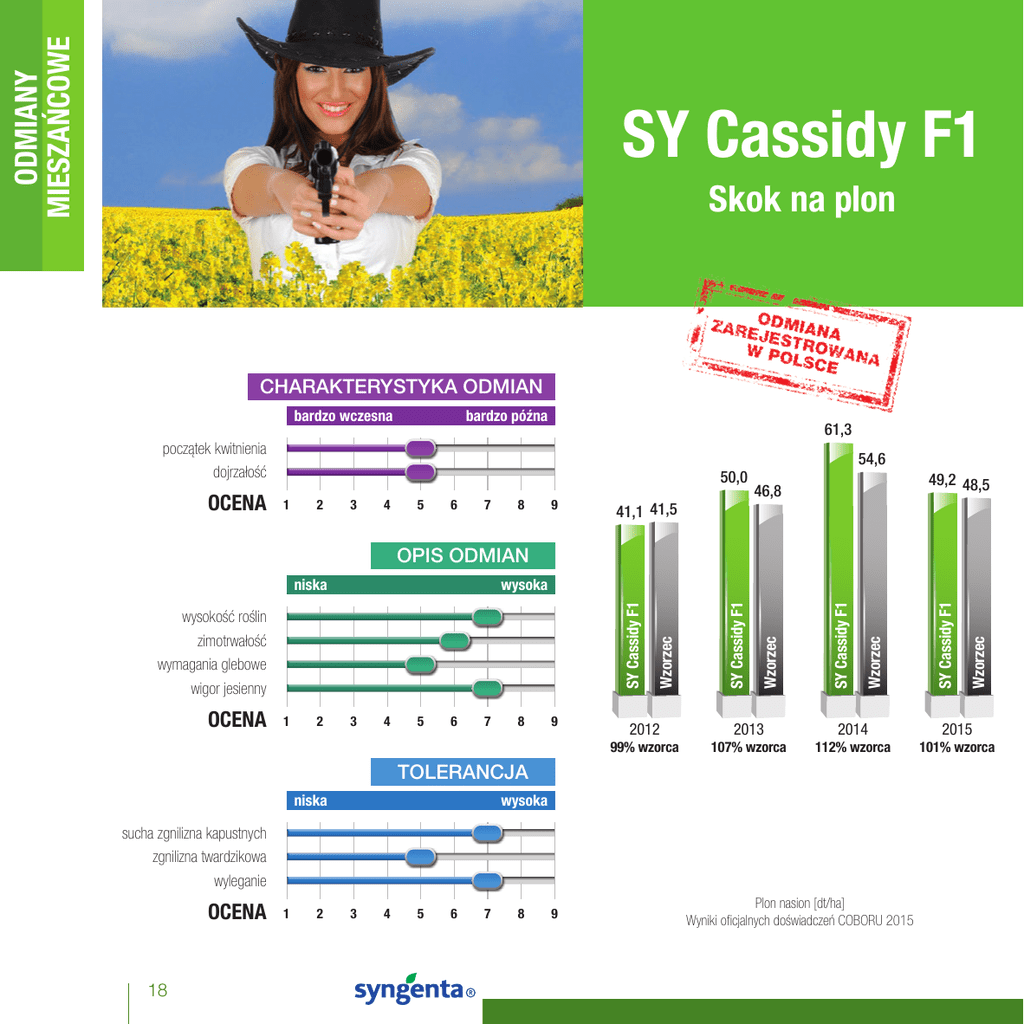 ODMIANY MIESZAŃCOWE SY Cassidy F1 Skok na plon CHARAKTERYSTYKA ODMIAN bardzo wczesna bardzo późna 61,3 początek kwitnienia dojrzałość OCENA 50,0 1 2 3 4 5 6 7 8 9 41,1 41,5 54,6 49,2 48,5 46,8 OPIS ODMIAN OCENA 1 2 3 4 5 6 7 8 9 2013 2014 2015 107% wzorca 112% wzorca 101% wzorca niskawysoka sucha zgnilizna kapustnych zgnilizna twardzikowa wyleganie 18 1 2 3 4 5 6 7 8 9 Wzorzec 2012 99% wzorca TOLERANCJA OCENA SY Cassidy F1 Wzorzec SY Cassidy F1 Wzorzec SY Cassidy F1 wysokość roślin zimotrwałość wymagania glebowe wigor jesienny Wzorzec SY Cassidy F1 niskawysoka Plon nasion [dt/ha] Wyniki oficjalnych doświadczeń COBORU 2015