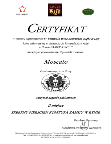 CERTYFIKAT W imieniu organizatorów IV Festiwalu Wina Bachanalia Night & Day które odbywały się w dniach 22-23 listopada 2013 roku w Hotelu ZAMEK RYN **** niniejszym potwierdzamy, iż produkt o nazwie: Moscato Prezentowany przez firmę Otrzymał nagrodę nagrodę publiczności II miejsce SREBRNY PIERŚCIEŃ KOMTURA ZAMKU W RYNIE Dyrektor Generalny Magdalena Dowgiałło-Karolczyk Mazurskie Centrum Kongresowo-Wypoczynkowe "Zamek - Ryn" Sp. z o.o. / ul. Plac Wolności 2,,11-520 Ryn; Tel. +48 87429 70 00 , fax+48 87 4297001 , e-mail:[email protected], www.zamekryn.pl NIP:739-31-12-796 , REGON: 510953863;