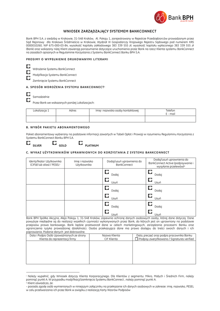 WNIOSEK ZARZĄDZAJĄCY SYSTEMEM BANKCONNECT Bank BPH S.A. z siedzibą w Krakowie, 31-548 Kraków, Al. Pokoju 1, zarejestrowany w Rejestrze Przedsiębiorców prowadzonym przez Sąd Rejonowy dla Krakowa Śródmieścia w Krakowie, Wydział XI Gospodarczy Krajowego Rejestru Sądowego pod numerem KRS 0000010260, NIP 675-000-03-84, wysokość kapitału zakładowego 383 339 555 zł, wysokość kapitału wpłaconego 383 339 555 zł (Bank) oraz wskazany niżej Klient zawierają porozumienie dotyczące uruchomienia przez Bank na rzecz Klienta systemu BankConnect na zasadach opisanych w Regulaminie Korzystania z Systemu BankConnect Banku BPH S.A. PROSIMY O WYPEŁNIENIE DRUKOWANYMI LITERAMI Wdrożenie Systemu BankConnect Modyfikacja Systemu BankConnect Zamknięcie Systemu BankConnect A. SPOSÓB WDROŻENIA SYSTEMU BANKCONNECTi Samodzielnie Przez Bank we wskazanych poniżej Lokalizacjach: Lokalizacja 1 Adres Imię i nazwisko osoby kontaktowej Telefon E - mail B. WYBÓR PAKIETU ABONAMENTOWEGO Pakiet abonamentowy wybierany na podstawie informacji zawartych w Tabeli Opłat i Prowizji w rozumieniu Regulaminu Korzystania z Systemu BankConnect Banku BPH S.A. SILVER GOLD PLATINUM C. WYKAZ UŻYTKOWNIKÓW UPRAWNIONYCH DO KORZYSTANIA Z SYSTEMU BANKCONNECT Identyfikator Użytkownika (CIF(d) lub alias) / PESELii Imię i nazwisko Użytkownika Dodaj/usuń uprawnienia do BankConnect Dodaj/usuń uprawnienia do BankConnect Active (podpisywanie i wysyłanie przelewów)iii Dodaj Dodaj Usuń Usuń Dodaj Dodaj Usuń Usuń Dodaj Dodaj Usuń Usuń Bank BPH Spółka Akcyjna, Aleja Pokoju 1, 31-548 Kraków, zapewnia ochronę danych osobowych osoby, której dane dotyczą. Dane powyższe niezbędne są do realizacji wszelkich czynności wykonywanych przez Bank, do których jest on uprawniony na podstawie przepisów prawa bankowego. Bank będzie przetwarzał dane w celach marketingowych, zarządzania procesami Banku oraz ograniczenia ryzyka prowadzonej działalności. Osoba przekazująca dane ma prawo dostępu do treści swoich danych i ich poprawiania. Podanie danych jest dobrowolne. Data i Podpis Osób Upoważnionych ze strony Nazwa Klienta Data, pieczęć oraz podpis pracownika Banku Klienta do reprezentacji firmy CIF Klienta Podpisy zweryfikowano / Signatures verified i Należy wypełnić, gdy Wniosek dotyczy Klienta Korporacyjnego. Dla Klientów z segmentu: Mikro, Małych i Średnich Firm, należy pominąć punkt A. W przypadku modyfikacji/zamknięcia Systemu BankConnect , należy pominąć punkt A. ii Klient oświadcza, że: - posiada zgodę osób wymienionych w niniejszym załączniku na przekazanie ich danych osobowych w zakresie: imię, nazwisko, PESEL w celu przetwarzania ich przez Bank w związku z realizacją Karty Wzorów Podpisów - osoby wymienione w niniejszym dokumencie zostały poinformowane, że Bank BPH Spółka Akcyjna, Aleja Pokoju 1, 31-548 Kraków, na podstawie ustawy z dnia 29 sierpnia 1997 r. o ochronie danych osobowych (Dz.U. z 2002 r. Nr 101, poz. 926 z późn. zm.) jest administratorem danych osobowych swoich i potencjalnych klientów oraz, że mają one prawo do wglądu i modyfikacji danych. iii Dodanie uprawnień do BankConnect Active jest możliwe w momencie, gdy Użytkownik posiada uprawnienia do BankConnect. Usunięcie Użytkownikowi uprawnień do BankConnect Active nie skutkuje usunięciem Użytkownikowi uprawnień do BankConnect.