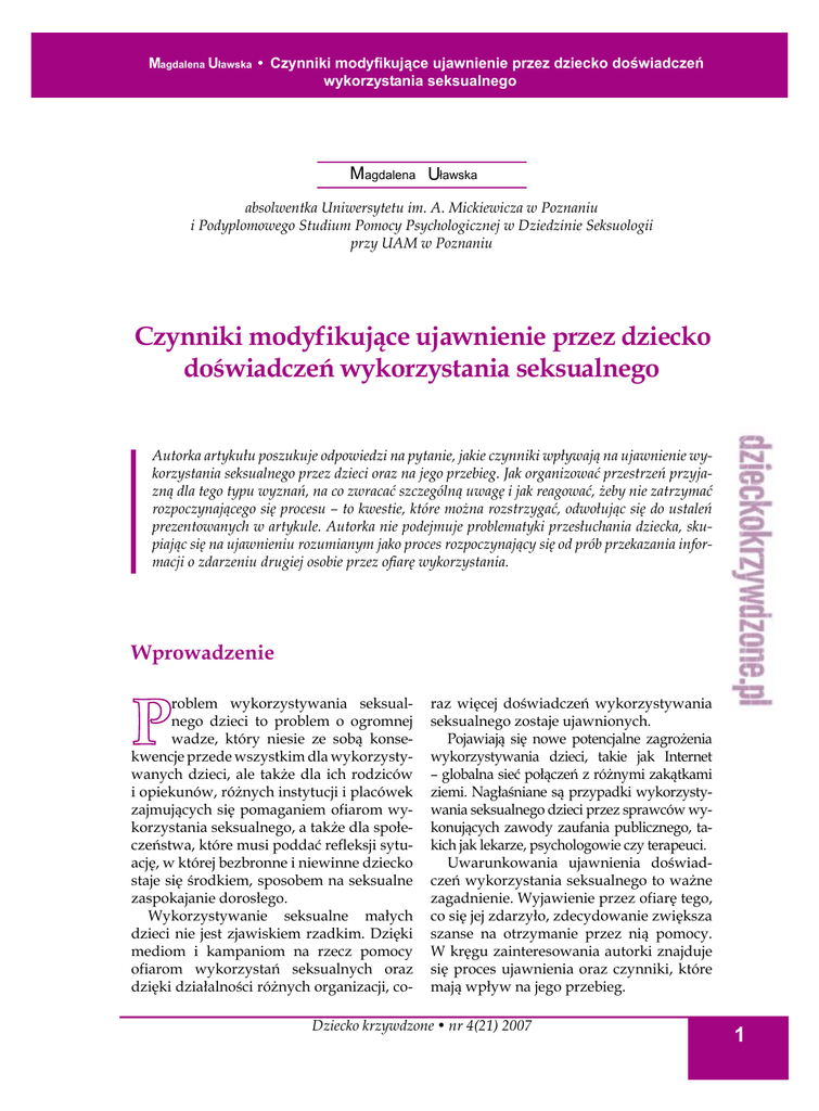 Magdalena Uławska • Czynniki modyfikujące ujawnienie przez dziecko doświadczeń wykorzystania seksualnego Magdalena Uławska absolwentka Uniwersytetu im. A. Mickiewicza w Poznaniu i Podyplomowego Studium Pomocy Psychologicznej w Dziedzinie Seksuologii przy UAM w Poznaniu Czynniki modyfikujące ujawnienie przez dziecko doświadczeń wykorzystania seksualnego Autorka artykułu poszukuje odpowiedzi na pytanie, jakie czynniki wpływają na ujawnienie wykorzystania seksualnego przez dzieci oraz na jego przebieg. Jak organizować przestrzeń przyjazną dla tego typu wyznań, na co zwracać szczególną uwagę i jak reagować, żeby nie zatrzymać rozpoczynającego się procesu – to kwestie, które można rozstrzygać, odwołując się do ustaleń prezentowanych w artykule. Autorka nie podejmuje problematyki przesłuchania dziecka, skupiając się na ujawnieniu rozumianym jako proces rozpoczynający się od prób przekazania informacji o zdarzeniu drugiej osobie przez ofiarę wykorzystania. Wprowadzenie roblem wykorzystywania seksualnego dzieci to problem o ogromnej wadze, który niesie ze sobą konsekwencje przede wszystkim dla wykorzystywanych dzieci, ale także dla ich rodziców i opiekunów, różnych instytucji i placówek zajmujących się pomaganiem ofiarom wykorzystania seksualnego, a także dla społeczeństwa, które musi poddać refleksji sytuację, w której bezbronne i niewinne dziecko staje się środkiem, sposobem na seksualne zaspokajanie dorosłego. Wykorzystywanie seksualne małych dzieci nie jest zjawiskiem rzadkim. Dzięki mediom i kampaniom na rzecz pomocy ofiarom wykorzystań seksualnych oraz dzięki działalności różnych organizacji, co- raz więcej doświadczeń wykorzystywania seksualnego zostaje ujawnionych. Pojawiają się nowe potencjalne zagrożenia wykorzystywania dzieci, takie jak Internet – globalna sieć połączeń z różnymi zakątkami ziemi. Nagłaśniane są przypadki wykorzystywania seksualnego dzieci przez sprawców wykonujących zawody zaufania publicznego, takich jak lekarze, psychologowie czy terapeuci. Uwarunkowania ujawnienia doświadczeń wykorzystania seksualnego to ważne zagadnienie. Wyjawienie przez ofiarę tego, co się jej zdarzyło, zdecydowanie zwiększa szanse na otrzymanie przez nią pomocy. W kręgu zainteresowania autorki znajduje się proces ujawnienia oraz czynniki, które mają wpływ na jego przebieg. Dziecko krzywdzone • nr 4(21) 2007 1 Magdalena Uławska • Czynniki modyfikujące ujawnienie przez dziecko doświadczeń wykorzystania seksualnego Co zatem wpływa na ujawnienie wykorzystania? Czy można mówić o specyficznych czynnikach, które muszą zaistnieć, aby ofiara zdecydowała się powiedzieć komuś o wykorzystaniu? Czy strategie radzenia sobie stosowane w obliczu wykorzystania mają istotny wpływ na jakość ujawnienia? Teorie ujawnienia wykorzystania seksualnego dzieci Wiedzę na temat procesu ujawniania doświadczenia wykorzystania seksualnego (child sexual abuse – CSA) w ciekawy sposób porządkuje koncepcja Tine Jensen (2005), dotycząca modelu odroczonego ujawnienia. Na podstawie przeprowadzonego badania Jensen stwierdziła, że żadne z uczestniczących w nim wykorzystanych dzieci nie powiadomiło nikogo z opiekunów o wykorzystaniu niezwłocznie po jego wystąpieniu. Gotowość dziecka do ujawnienia zależała od występowania trzech zmiennych: 1) okazji (opportunity), 2) powiązania (connection), 3) celu (purpose). Okazja Jensen zwróciła uwagę, jak ważne jest umożliwienie dziecku zakomunikowania faktu wystąpienia wykorzystania. Szczególnie istotna jest umiejętność nawiązywania dialogu, w którym dziecko bez skrępowania i bez przeszkód mogłoby powiedzieć o wykorzystaniu. Jednak, aby dialog taki mógł się odbyć, muszą zostać spełnione określone warunki, związane z miejscem, czasem, dostępnością opiekuna bądź nieobecnością sprawcy. Dziecko nie ujawni wykorzystania, jeśli nie będzie czuło, iż zostanie wysłuchane uważnie, oraz gdy ma wątpliwości, czy jego słowa zostaną potraktowane poważnie. Często zdarza się, że dziecko napotyka różne komunikaty zniechęcające do dalszego opowiadania. Dorośli, którym trudno jest przyjąć przedstawianą przez dziecko rzeczywistość, zarzucają mu kłamstwo wprost bądź w mniej bezpośredni sposób: pytają, czy to nie był sen, lub czy ktoś po prostu tego dziecku nie opowiedział. Jak wynika z obserwacji, dzieci są niezwykle wyczulone i wrażliwe na stany emocjonalne swoich opiekunów, a także na ich sytuację życiową. Dziecko nie będzie chciało ujawnić wykorzystania w sytuacji, w której według niego matka (bo to ona w badaniu Jensen była najczęściej adresatem ujawnienia), jest obciążona innymi problemami bądź gdy jest ewidentnie nieobecna emocjonalnie. Jensen wskazuje także cztery powody, dla których matki mogą mieć trudności z rozpoczynaniem dialogu ze swoim dzieckiem, nawet w momencie, gdy jest dla nich jasne, iż wykorzystanie miało miejsce. Jako pierwszy powód Jensen podaje obawę matek, iż nie są wystarczająco kompetentne do rozmów na ten temat. Matki obawiają się także zarzutu ze strony różnych instytucji (policja, sąd itd.), iż dziecko posługuje się słowami matki, a nie swoimi. W obawie przed „wkładaniem własnych słów w usta dziecka”, a także przed utrudnieniem późniejszych procedur, matki wolą nie podejmować tego tematu w ogóle. Trzecim z wymienionych powodów jest lęk przed skrzywdzeniem dziecka poprzez rozmowę, jak również lęk przed szkodą, jaką taka rozmowa może wyrządzić stosunkom wewnątrzrodzinnym. Ostatni z powodów wymienianych przez autorkę to chęć posiadania przez matki pewności co do zaistnienia faktu wykorzystania jeszcze przed rozpoczęciem rozmowy. Dziecko krzywdzone • nr 4(21) 2007 2 Magdalena Uławska • Czynniki modyfikujące ujawnienie przez dziecko doświadczeń wykorzystania seksualnego Niektóre sytuacje w życiu dziecka