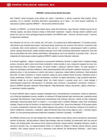 WPROST: ciemna strona Kamila Durczoka Szef „Faktów” został przyłapany przez policję, jak ucieka z mieszkania, w którym znaleziono biały proszek. Policja sprawdza, czy to narkotyki. Wcześniej dziennikarz zabarykadował się w lokalu i nie chciał wpuścić właściciela. W najnowszym wydaniu tygodnika WPROST – ciemna strona Kamila Durczoka. Ponadto we WPROST: czy Andrzej Duda będzie lepszą wersja Marcinkiewicza, czego Sławomir Izdebski nauczył się od Andrzeja Leppera, jak polscy kierowcy znikają w białoruskich więzieniach i łagrach, dlaczego polskim szpitalom grozi paraliż oraz czym są i komu pomagają hospicja perinatalne. We WPROST także – fenomen „50 twarzy Greya” i rozmowa ze Zbigniewem Izdebskim. Nie interesuje nas, kto ma z kim romans, kto z kim sypia i czy przypina się do łóżka kajdankami. To prywatne sprawy. Jeśli jednak w grę wchodzą biały proszek i interwencje policji, zaczyna się inna rozmowa. Nie mówimy o rockmanie, tylko o człowieku, który niemal codziennie z telewizora mówi, jak żyć (…) Rozmawia z najważniejszymi ludźmi w państwie. Ocenia i piętnuje dwulicowość, wydaje werdykty dotyczące innych osób, komentuje najważniejsze wydarzenia. Przez lata stał się autorytetem dla wielu młodych dziennikarzy. Obowiązują go nieco inne standardy niż gwiazdy rocka – pisze we wstępniaku do najnowszego wydania tygodnika WPROST redaktor naczelny Sylwester Latkowski. A na łamach tygodnika – zdjęcia z mieszkania na warszawskim Mokotowie. Na stole w sypialni talerz z resztkami białego proszku i akcesoria, jakich używa się do brania narkotyków: kartka zwinięta w rulon, służąca do wciągania do nosa, oraz karta kredytowa, także ze śladami proszku. W salonie torebka z opalonymi szklanymi fifkami. Tuż obok zakazany w Polsce lek zawierający pochodną amfetaminy. Obok nieprawdopodobna ilość pornografii i gadżetów erotycznych. W kącie płócienna torba, w niej roztrzaskana w drobny mak kamera i zgniecione, rozbite telefony komórkowe. Obok połamane karty SIM. W całym mieszkaniu w różnych miejscach walają się rzeczy osobiste Kamila Durczoka. Nieotwarte pismo z urzędu skarbowego. Pendrive z wyjazdu narciarskiego, na którym są zdjęcia dziennikarza i jego przyjaciół-celebrytów. Wszystko składa się na dość przerażający obraz. Nie chodzi bowiem o gwiazdę rocka, lecz o szefa jednego z najważniejszych programów informacyjnych. O człowieka, który rozmawia z prezydentami, premierami, ministrami – piszą we WPROST Sylwester Latkowski, Michał Majewski i Olga Wasilewska. Więcej o tej sprawie i zdjęcia z Mokotowa – w najnowszym wydaniu tygodnika. W nowym WPROST także o zapleczu kampanii kandydata Prawa i Sprawiedliwości na prezydenta. Krótko po ogłoszeniu, że to Duda jest kandydatem prawicy, pisaliśmy, że sztabowcy PiS będą budować jego wizerunek jako „ulepszoną wersję wczesnego Marcinkiewicza”. Część prawicowych komentatorów była wówczas oburzona. Jednak po kilku miesiącach, obserwując „brawurową akcję Dudy” na nartach (…) czy kolejne sceny z podróży Dudabusa, widać coraz wyraźniejsze analogie. Zresztą nie tylko do chwytów a la Marcinkiewicz czy Donald Tusk – pisze Anna Gielewska. W tej syntezie stylów i w nowym, prezydenckim wizerunku Dudy, rodzina odgrywa rolę ważną, o ile nie kluczową. Zwłaszcza że to rodzina na wskroś inteligencka, krakowska, z tradycjami. Agata Kornhauser-Duda żona twardo stąpa po ziemi – twierdzą znajomi Dudów. Po czym powtarzają opisywaną wielokrotnie anegdotę o śmieciach. Szczegóły – we WPROST. We WPROST również o tym, kim jest chłopski lider, który chce śladami swego mistrza, twórcy Samoobrony, poprowadzić rolników na barykady. Jest jak paskuda z Zalewu Zegrzyńskiego, atak sinic na Bałtyk, rój meteorytów, który ma zniszczyć Ziemię, i jak świńska górka. Jak wiosenne burze, jesienne przymrozki, zimowe zadymki. Występuje okresowo, zwykle w pierwszym kwartale roku, na międzynarodowej drodze A2 z Berlina do Moskwy w Zdanach (gmina Zbuczyn, powiat siedlecki). Choć czasami pojawia się też w Warszawie przed Sejmem lub Ministerstwem Rolnictwa – pisze Cezary PMPG Polskie Media SA Batory Office Building II, Al. Jerozolimskie 212, 02-486 Warszawa tel. (+48 22) 347 50 00, fax (+48 22) 347 50 01, www.point-group.pl NIP 521-00-88-831, REGON 010768408, KRS 0000051017, Kapitał zakładowy: 103 897 320 zł Łazarewicz. Jak świnie drgną lekko w górę, już go nie będzie – wróży Sławomirowi Izdebskiemu szef Krajowego Związku Rolników, Kółek i Organizacji Rolniczych Władysław Serafin. Izdebski wie, jak wzbudzić zainteresowanie dziennikarzy swoją osobą. Tego nauczyłem się od Leppera. On, jak chciał coś ważnego powiedzieć, wyzywał ministrów od złodziei i bandytów i wszystkie telewizje to pokazywały – tłumaczył kiedyś dziennikarzowi WPROST. Więcej o politycznej karierze chłopskiego lidera – w poniedziałek we WPROST. We WPROST także reportaż z Białorusi - trójkąta bermudzkiego, w którym na długie lata giną polscy kierowcy. Piekło Andrzej zaczęło się podczas powrotu z Moskwy. Na śliskiej drodze wyprzedzała go białoruska ciężarówka, ale tak nieszczęśliwie, że ciężarówki wpadły siebie. W wypadku ucierpiał jeszcze dostawczy mercedes, trzy osoby zostały ranne. Milicja aresztował tylko Andrzeja, bo jest obcokrajowcem. Kierowca wylądował jednym z najgorszych więzień, w celi z kryminalistami. Był oskarżony o spowodowanie wypadku, w którym ciężkich obrażeń doznało trzech pasażerów mercedesa. Po białorusku: statia (artykuł) 317 część 2. W żargonie więziennym DTD, czyli drogowe przestępstwo transportowe. DTD dzielą się na te z ofiarami śmiertelnymi i bez śmiertelnych ofiar. W przypadku ofiar śmiertelnych koszty są znacznie niższe. Wysyła się umyślnych z pieniędzmi, przekupuje białoruską rodzinę, która podpisuje dokument 