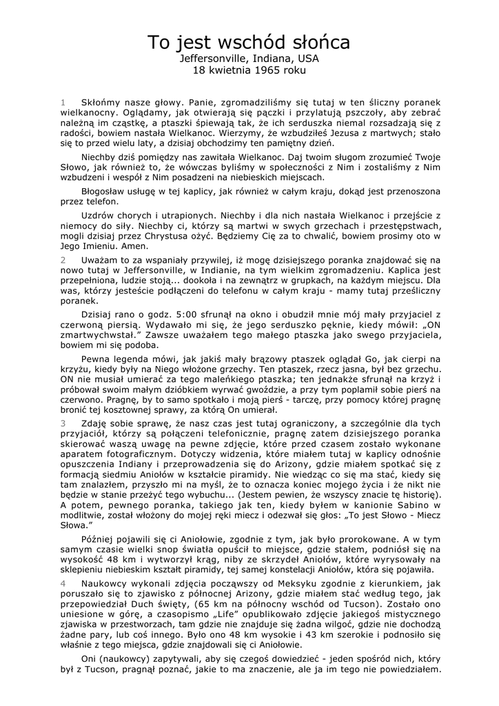 To jest wschód słońca Jeffersonville, Indiana, USA 18 kwietnia 1965 roku 1 Skłońmy nasze głowy. Panie, zgromadziliśmy się tutaj w ten śliczny poranek wielkanocny. Oglądamy, jak otwierają się pączki i przylatują pszczoły, aby zebrać należną im cząstkę, a ptaszki śpiewają tak, że ich serduszka niemal rozsadzają się z radości, bowiem nastała Wielkanoc. Wierzymy, że wzbudziłeś Jezusa z martwych; stało się to przed wielu laty, a dzisiaj obchodzimy ten pamiętny dzień. Niechby dziś pomiędzy nas zawitała Wielkanoc. Daj twoim sługom zrozumieć Twoje Słowo, jak również to, że wówczas byliśmy w społeczności z Nim i zostaliśmy z Nim wzbudzeni i wespół z Nim posadzeni na niebieskich miejscach. Błogosław usługę w tej kaplicy, jak również w całym kraju, dokąd jest przenoszona przez telefon. Uzdrów chorych i utrapionych. Niechby i dla nich nastała Wielkanoc i przejście z niemocy do siły. Niechby ci, którzy są martwi w swych grzechach i przestępstwach, mogli dzisiaj przez Chrystusa ożyć. Będziemy Cię za to chwalić, bowiem prosimy oto w Jego Imieniu. Amen. 2 Uważam to za wspaniały przywilej, iż mogę dzisiejszego poranka znajdować się na nowo tutaj w Jeffersonville, w Indianie, na tym wielkim zgromadzeniu. Kaplica jest przepełniona, ludzie stoją... dookoła i na zewnątrz w grupkach, na każdym miejscu. Dla was, którzy jesteście podłączeni do telefonu w całym kraju - mamy tutaj prześliczny poranek. Dzisiaj rano o godz. 5:00 sfrunął na okno i obudził mnie mój mały przyjaciel z czerwoną piersią. Wydawało mi się, że jego serduszko pęknie, kiedy mówił: „ON zmartwychwstał.” Zawsze uważałem tego małego ptaszka jako swego przyjaciela, bowiem mi się podoba. Pewna legenda mówi, jak jakiś mały brązowy ptaszek oglądał Go, jak cierpi na krzyżu, kiedy były na Niego włożone grzechy. Ten ptaszek, rzecz jasna, był bez grzechu. ON nie musiał umierać za tego maleńkiego ptaszka; ten jednakże sfrunął na krzyż i próbował swoim małym dzióbkiem wyrwać gwoździe, a przy tym poplamił sobie pierś na czerwono. Pragnę, by to samo spotkało i moją pierś - tarczę, przy pomocy której pragnę bronić tej kosztownej sprawy, za którą On umierał. 3 Zdaję sobie sprawę, że nasz czas jest tutaj ograniczony, a szczególnie dla tych przyjaciół, którzy są połączeni telefonicznie, pragnę zatem dzisiejszego poranka skierować waszą uwagę na pewne zdjęcie, które przed czasem zostało wykonane aparatem fotograficznym. Dotyczy widzenia, które miałem tutaj w kaplicy odnośnie opuszczenia Indiany i przeprowadzenia się do Arizony, gdzie miałem spotkać się z formacją siedmiu Aniołów w kształcie piramidy. Nie wiedząc co się ma stać, kiedy się tam znalazłem, przyszło mi na myśl, że to oznacza koniec mojego życia i że nikt nie będzie w stanie przeżyć tego wybuchu... (Jestem pewien, że wszyscy znacie tę historię). A potem, pewnego poranka, takiego jak ten, kiedy byłem w kanionie Sabino w modlitwie, został włożony do mojej ręki miecz i odezwał się głos: „To jest Słowo - Miecz Słowa.” Później pojawili się ci Aniołowie, zgodnie z tym, jak było prorokowane. A w tym samym czasie wielki snop światła opuścił to miejsce, gdzie stałem, podniósł się na wysokość 48 km i wytworzył krąg, niby ze skrzydeł Aniołów, które wyrysowały na sklepieniu niebieskim kształt piramidy, tej samej konstelacji Aniołów, która się pojawiła. 4 Naukowcy wykonali zdjęcia począwszy od Meksyku zgodnie z kierunkiem, jak poruszało się to zjawisko z północnej Arizony, gdzie miałem stać według tego, jak przepowiedział Duch święty, (65 km na północny wschód od Tucson). Zostało ono uniesione w górę, a czasopismo „Life” opublikowało zdjęcie jakiegoś mistycznego zjawiska w przestworzach, tam gdzie nie znajduje się żadna wilgoć, gdzie nie dochodzą żadne pary, lub coś innego. Było ono 48 km wysokie i 43 km szerokie i podnosiło się właśnie z tego miejsca, gdzie znajdowali się ci Aniołowie. Oni (naukowcy) zapytywali, aby się czegoś dowiedzieć - jeden spośród nich, który był z Tucson, pragnął poznać, jakie to ma znaczenie, ale ja im tego nie powiedziałem. To jest wschód słońca 2 Wy wiedzieliście o tym, gdyż to było powiedziane, zanim się to stało, ale to nie było dla nich. To było dla was. 5 Otóż, ON tam do mnie przemówił i powiedział: „Nastanie otwarcie Siedmiu Pieczęci.” Zostanie objawione siedem tajemnic - siedmioraka tajemnica Biblii, która była zamknięta od założenia świata. A my, chociaż jesteśmy tylko skromną i nieliczną grupą w porównaniu z tym światem, cieszymy się obecnie z tych błogosławieństw, słuchając takich tajemnic jak: małżeństwo i rozwód, nasienie węża itd. Wszystkie te nie jasne sprawy zostały nam całkowicie objawione, a to nie przez człowieka, lecz przez samego Boga. ON otworzył te siedem tajemnic, które dotyczą tego, czym był kościół, w jaki sposób był na początku w Chrystusie i w jaki sposób będzie objawiony w czasie ostatecznym. A obecnie, kiedy to zjawisko zostało podniesione w górę ... to zdjęcie mamy na polu na gazetce ściennej. Mam tutaj przy sobie zdjęcie, możecie popatrzyć, pochodzi z czasopisma „Life.” Ciekawi mnie, czy wszyscy tu obecni słuchacze obejrzeli już to zdjęcie we właściwy sposób? 6 Pamiętajcie, kiedy to widzenie przyszło, wygłaszałem kazania na temat Księgi Objawienia, gdzie oglądamy tych starych sędziów, gdzie również oglądaliśmy Jezusa — Objawienie 1 rozdział. Kiedy zaczęliśmy otwierać te Siedem Pieczęci, a właściwie Wieki Kościoła, które poprzedziły otwarcie Siedmiu Pieczęci. Oglądaliśmy Chrystusa, stojącego z włosami białymi jak wełna. Opisałem wam, że starodawni sędziowie w Anglii, sędziowie sprzed wielu lat, zanim stanęli przed ławą przysięgi, otrzymali symbol najwyższego autoryte
