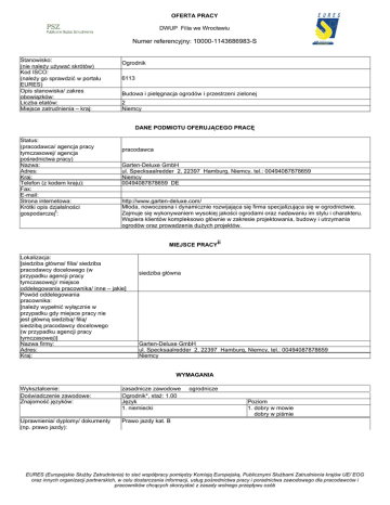 OFERTA PRACY DWUP Filia we Wrocławiu Numer referencyjny: 10000-1143686983-S Stanowisko: (nie należy używać skrótów) Kod ISCO: (należy go sprawdzić w portalu EURES) Opis stanowiska/ zakres obowiązków: Liczba etatów: Miejsce zatrudnienia – kraj: Ogrodnik 6113 Budowa i pielęgnacja ogrodów i przestrzeni zielonej 2 Niemcy DANE PODMIOTU OFERUJĄCEGO PRACĘ Status: (pracodawca/ agencja pracy tymczasowej/ agencja pośrednictwa pracy) Nazwa: Adres: Kraj: Telefon (z kodem kraju): Fax: E-mail: Strona internetowa: Krótki opis działalności gospodarczeji: pracodawca Garten-Deluxe GmbH ul. Specksaalredder 2, 22397 Hamburg, Niemcy, tel.: 00494087878659 Niemcy 00494087878659 DE http://www.garten-deluxe.com/ Młoda, nowoczesna i dynamicznie rozwijająca się firma specjalizująca się w ogrodnictwie. Zajmuje się wykonywaniem wysokiej jakości ogrodami oraz nadawaniu im stylu i charakteru. Wspiera klientów kompleksowo głównie w zakresie projektowania, budowy i utrzymania ogrodów oraz prowadzenia dużych projektów. MIEJSCE PRACYii Lokalizacja: [siedziba główna/ filia/ siedziba pracodawcy docelowego (w przypadku agencji pracy tymczasowej)/ miejsce oddelegowania pracownika/ inne – jakie] Powód oddelegowania pracownika: [należy wypełnić wyłącznie w przypadku gdy miejsce pracy nie jest główną siedzibą/ filią/ siedzibą pracodawcy docelowego (w przypadku agencji pracy tymczasowej)] Nazwa firmy: Adres: Kraj: siedziba główna Garten-Deluxe GmbH ul. Specksaalredder 2, 22397 Hamburg, Niemcy, tel.: 00494087878659 Niemcy WYMAGANIA Wykształcenie: Doświadczenie zawodowe: Znajomość języków: zasadnicze zawodowe Ogrodnik*, staż: 1.00 Język 1. niemiecki Uprawnienia/ dyplomy/ dokumenty (np. prawo jazdy): Prawo jazdy kat. B ogrodnicze Poziom 1. dobry w mowie dobry w piśmie EURES (Europejskie Służby Zatrudnienia) to sieć współpracy pomiędzy Komisją Europejską, Publicznymi Służbami Zatrudnienia krajów UE/ EOG oraz innych organizacji partnerskich, w celu dostarczania informacji, usług pośrednictwa pracy i poradnictwa zawodowego dla pracodawców i pracowników chcących skorzystać z zasady wolnego przepływu osób Inne istotne wymagania: Wykształcenie: mile widziane wykształcenie jako ogrodnik lub pokrewne Doświadczenie zawodowe: minimum roczne doświadczenie jako ogrodnik Znajomość języków: niemiecki - komunikatywny / dobry Mile widziane prawo jazdy kat. B WYNAGRODZENIE I WARUNKI ZATRUDNIENIA Wysokość pensji brutto: Wysokość pensji netto: Waluta, w jakiej wypłacana jest pensja: Rodzaj stawki wynagrodzenia: (godzinowa/ tygodniowa/ miesięczna/ roczna/ inna) Premie: Dodatkowe świadczenia (zakwaterowanie, wyżywienie, koszty związane ze zmianą miejsca zamieszkania, koszty podróży itp.): Nazwa firmy, z którą zostanie podpisana umowa: Rodzaj umowy: (umowa o pracę, umowa zlecenia, wolontariat, praktyka zawodowa/ staż, praca zdalna, agencja pracy tymczasowej, inne): Wymiar czasu pracy (praca na pełen etat/ część etatu): Czas trwania umowy: (nieokreślony/ określony) 10,00 Liczba godzin tygodniowo: Zmiany i praca w dni wolne: 40,00 Praca 1-zmianowa, w godzinach od 7:30 do 16:30, możliwe nadgodziny, które są dodatkowo wynagradzane Euro Czasowy ze stawką godzinową Wynagrodzenie: 10 – 14 Euro w zależności od kwalifikacji i doświadczenia Pracodawca organizuje zakwaterowanie, które jest płatne przez pracownika w wysokości 16 Euro / dzień i jest oddalone od miejsca pracy 10 min samochodem Garten-Deluxe GmbH umowa o pracę etat nieokreślony Data wygaśnięcia umowy (w przypadku umowy na czas określony): Data rozpoczęcia: Inne informacje: SPOSÓB SKŁADANIA WNIOSKU Wymagane dokumenty (list motywacyjny, CV itp.): Język, w którym muszą być sporządzone przedkładane dokumenty: Do kogo należy wysłać dokumenty: (do pracodawcy/ doradcy EURES) Gdzie należy wysłać dokumenty: (adres, adres e-mail, nr faksu z kodem kraju itp.) Dane teleadresowe doradcy EURES lub przedstawiciela pracodawcy: (nazwisko, adres, telefon, fax, e-mail itp.) CV, list motywacyjny, świadectwa niemiecki do pracodawcy [email protected] Pani Andrea Völkers 0049 4087878659 DODATKOWE INFORMACJE WAŻNOŚĆ 2016-06-10 Data publikacji: Termin przedkładania podań o pracę / zakończenia ważności oferty: Uprzejmie informujemy, że skontaktujemy się wyłącznie z wybranymi kandydatami. UWAGA: 1. Umowa z zagranicznym pracodawcą jest zawierana, co do zasady, zgodnie z prawem kraju zatrudnienia. Oznacza to, że wszystkie roszczenia odnośnie warunków, które obejmuje umowa, można kierować wyłącznie do odpowiedniego sądu w kraju zatrudnienia. Publiczne służby zatrudnienia (EURES) nie mogą pośredniczyć ani reprezentować pracownika w sądzie kraju zatrudnienia w EURES (Europejskie Służby Zatrudnienia) to sieć współpracy pomiędzy Komisją Europejską, Publicznymi Służbami Zatrudnienia krajów UE/ EOG oraz innych organizacji partnerskich, w celu dostarczania informacji, usług pośrednictwa pracy i poradnictwa zawodowego dla pracodawców i pracowników chcących skorzystać z zasady wolnego przepływu osób przypadku sporu z pracodawcą. 2. Publiczne służby zatrudnienia (EURES) dokładają wszelkich starań, aby zapewnić rzetelność i wiarygodność ofert pracy zgłoszonych w lokalnym urzędzie pracy. Należy wyjaśnić, że oferta pracy została zgłoszona przez stronę trzecią i EURES nie odpowiada za ewentualne rozbieżności między warunkami pracy określonymi w ofercie pracy i warunkami oferowanymi przez potencjalnego pracodawcę. 3. Publiczne służby zatrudnienia (EURES) informują, że będą zbierać, przetwarzać i przekazywać potencjalnym pracodawcom zgodnie z przepisami dotyczącymi ochrony danych osobowych wszystkie dane osobowe dostarczone przez osoby poszukujące pracy. iInformacje o firmie, takie jak: status prawny, sektor, typ działalności, rodzaj produktów lub świadczonych usług, data rozpoczęcia działalności gospodarczej, l