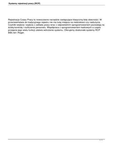 Systemy rejestracji pracy [RCP] Rejestracja Czasu Pracy to nowoczesne narzędzie zastępujące klasyczną listę obecności. W przeciwieństwie do tradycyjnego rejestru nie ma tutaj miejsca na nieścisłosci czy nadużycia. Czytniki wejścia i wyjścia z zakładu pracy wraz z odpowiednim oprogramowaniem pozwalają na ścisłą kontrolę i rozliczenie personelu. Współpraca z oprogramowaniem kadrowych a często przejęcie jego wielu funkcji ułatwia wdrożenie systemu. Oferujemy doskonałe systemy RCP BiBi.net i Roger. 1/1