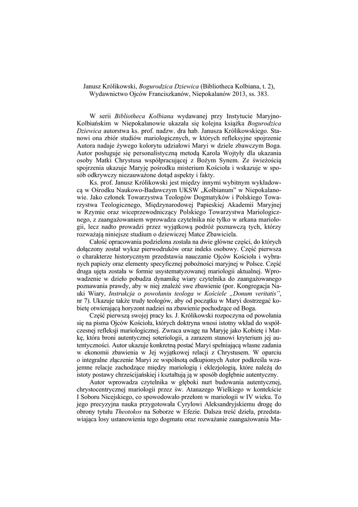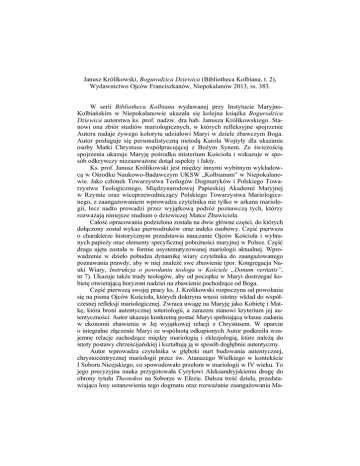 Janusz Królikowski, Bogurodzica Dziewica (Bibliotheca Kolbiana, t. 2), Wydawnictwo Ojców Franciszkanów, Niepokalanów 2013, ss. 383. W serii Bibliotheca Kolbiana wydawanej przy Instytucie MaryjnoKolbiańskim w Niepokalanowie ukazała się kolejna książka Bogurodzica Dziewica autorstwa ks. prof. nadzw. dra hab. Janusza Królikowskiego. Stanowi ona zbiór studiów mariologicznych, w których refleksyjne spojrzenie Autora nadaje żywego kolorytu udziałowi Maryi w dziele zbawczym Boga. Autor posługuje się personalistyczną metodą Karola Wojtyły dla ukazania osoby Matki Chrystusa współpracującej z Bożym Synem. Ze świeżością spojrzenia ukazuje Maryję pośrodku misterium Kościoła i wskazuje w sposób odkrywczy niezauważone dotąd aspekty i fakty. Ks. prof. Janusz Królikowski jest między innymi wybitnym wykładowcą w Ośrodku Naukowo-Badawczym UKSW „Kolbianum” w Niepokalanowie. Jako członek Towarzystwa Teologów Dogmatyków i Polskiego Towarzystwa Teologicznego, Międzynarodowej Papieskiej Akademii Maryjnej w Rzymie oraz wiceprzewodniczący Polskiego Towarzystwa Mariologicznego, z zaangażowaniem wprowadza czytelnika nie tylko w arkana mariologii, lecz nadto prowadzi przez wyjątkową podróż poznawczą tych, którzy rozważają niniejsze studium o dziewiczej Matce Zbawiciela. Całość opracowania podzielona została na dwie główne części, do których dołączony został wykaz pierwodruków oraz indeks osobowy. Część pierwsza o charakterze historycznym przedstawia nauczanie Ojców Kościoła i wybranych papieży oraz elementy specyficznej pobożności maryjnej w Polsce. Część druga ujęta została w formie usystematyzowanej mariologii aktualnej. Wprowadzenie w dzieło pobudza dynamikę wiary czytelnika do zaangażowanego poznawania prawdy, aby w niej znaleźć swe zbawienie (por. Kongregacja Nauki Wiary, Instrukcja o powołaniu teologa w Kościele „Donum veritatis”, nr 7). Ukazuje także trudy teologów, aby od początku w Maryi dostrzegać kobietę otwierającą horyzont nadziei na zbawienie pochodzące od Boga. Część pierwszą swojej pracy ks. J. Królikowski rozpoczyna od powołania się na pisma Ojców Kościoła, których doktryna wnosi istotny wkład do współczesnej refleksji mariologicznej. Zwraca uwagę na Maryję jako Kobietę i Matkę, która broni autentycznej soteriologii, a zarazem stanowi kryterium jej autentyczności. Autor ukazuje konkretną postać Maryi spełniającą własne zadania w ekonomii zbawienia w Jej wyjątkowej relacji z Chrystusem. W oparciu o integralne złączenie Maryi ze wspólnotą odkupionych Autor podkreśla wzajemne relacje zachodzące między mariologią i eklezjologią, które należą do istoty postawy chrześcijańskiej i kształtują ją w sposób dogłębnie autentyczny. Autor wprowadza czytelnika w głęboki nurt budowania autentycznej, chrystocentrycznej mariologii przez św. Atanazego Wielkiego w kontekście I Soboru Nicejskiego, co spowodowało przełom w mariologii w IV wieku. To jego precyzyjna nauka przygotowała Cyrylowi Aleksandryjskiemu drogę do obrony tytułu Theotokos na Soborze w Efezie. Dalsza treść dzieła, przedstawiająca losy ustanowienia tego dogmatu oraz rozważanie zaangażowania Ma- 154 RECENZJE ryi dla zbawienia ludzi, powoduje przemianę suchych faktów chrystologicznych w pasjonującą teologię. Swą nieustannie aktualną treścią studium to pobudza do zaangażowania się w obronę każdej z uznanych prawd wiary. Trzy opracowania dotyczące Theotokos stanowią swoisty tryptyk o Matce Bożej. Ukazując historyczne źródła specyfiki polskiej pobożności maryjnej w poszczególnych epokach, Autor zaznacza głęboką więź maryjnych aspektów wiary z losami Kościoła w historii narodu polskiego. Ks. Profesor kieruje sugestie do homiletyków i duszpasterzy, aby wzorców i argumentów w swej pracy szukali w historii maryjnej pobożności narodowej. Rozwój różnych jej form, m.in. Różańca oraz kształtowanie się kultu Ikony Jasnogórskiej jako wizerunku „Królowej Polski”, przedstawia jako konkretne uzasadnienie aktualnego znaczenia tytułu Królowej Polski. Ukazuje wpływ królewskiej ikony Matki Bożej Jasnogórskiej na kluczowe wydarzenia w historii narodowej oraz odnawiającą i jednoczącą rolę Królowej Polski dla polskiego narodu, zwłaszcza w zwycięskiej obronie Jasnej Góry, zarówno w wymiarze historycznym, jak i aktualnym. Ks. Profesor podkreśla doniosłe znaczenie bulli Sollicitudo omnium Ecclesiarum papieża Aleksandra VII oraz innych jego działań dla późniejszego ogłoszenia dogmatu o Niepokalanym Poczęciu Najświętszej Maryi Panny przez Piusa IX. Wskazuje też na aktualną potrzebę pracy metodologicznej dla doskonalenia sposobów ożywionego przekazywania prawd objawionych – dotyczy to także dogmatu Wniebowzięcia Maryi. Autor prowadzi ponad horyzont życia ziemskiego, aby tam znaleźć sens i wypełnienie celu życia człowieka. Służy temu teologia zawierzenia Maryi, która zaprowadziła Jana Pawła II na szczyty świętości, a także maryjna wiara w teologii J. Ratzingera, podkreślająca działania Matki Bożej w obecnym czasie Kościoła. Część drugą pracy ks. J. Królikowski rozpoczyna od refleksji metodologicznej, która ukazuje organiczną spójność mariologii z katolicyzmem, gdyż Maryja nadaje mu szczególny charakter względem Boga oraz wierzących. Autor uzasadnia, dlaczego bez Matki Bożej misterium zbawcze nie mogłoby tak doskonale objąć wszystkich ludzi. Przedstawiając Maryję jako reprezentantkę ludzkości, Ks. Profesor ukazuje oblubieńczą wymianę między Trzema Osobami Boga a osobą Maryi; wyjaśnia przy tym uniwersalizm pośredniczenia Maryi obejmujący wszystkich ludzi. Dalej ukazuje znaczenie soteriologiczne misterium Niepokalanego Poczęcia Maryi oraz dynamiczny model zbawienia przez więź osobową z Bogiem, w której człowiek realizuje się w swej wolnej woli. Autor dochodzi do kluczowych stwierdze