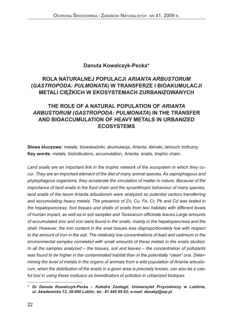 Ochrona Środowiska i Zasobów Naturalnych nr 41, 2009 r. Danuta Kowalczyk-Pecka* ROLA NATURALNEJ POPULACJI ARIANTA ARBUSTORUM (GASTROPODA: PULMONATA) W TRANSFERZE I BIOAKUMULACJI METALI CIĘŻKICH W EKOSYSTEMACH ZURBANIZOWANYCH THE ROLE OF A NATURAL POPULATION OF ARIANTA ARBUSTORUM (GASTROPODA: PULMONATA) IN THE TRANSFER AND BIOACCUMULATION OF HEAVY METALS IN URBANIZED ECOSYSTEMS Słowa kluczowe: metale, biowskaźniki, akumulacja, Arianta, ślimaki, łańcuch troficzny. Key words: metals, bioindicators, accumulation, Arianta, snails, trophic chain. Land snails are an important link in the trophic network of the ecosystem in which they occur. They are an important element of the diet of many animal species. As saprophagous and phytophagous organisms, they accelerate the circulation of matter in nature. Because of the importance of land snails in the food chain and the synanthropic behaviour of many species, land snails of the taxon Arianta arbustorum were analyzed as potential vectors transferring and accumulating heavy metals. The presence of Zn, Cu, Fe, Cr, Pb and Cd was tested in the hepatopancreas, foot tissues and shells of snails from two habitats with different levels of human impact, as well as in soil samples and Taraxacum officinale leaves.Large amounts of accumulated zinc and iron were found in the snails, mainly in the hepatopancreas and the shell. However, the iron content in the snail tissues was disproportionately low with respect to the amount of iron in the soil. The relatively low concentrations of lead and cadmium in the environmental samples correlated with small amounts of these metals in the snails studied. In all the samples analyzed – the tissues, soil and leaves – the concentration of pollutants was found to be higher in the contaminated habitat than in the potentially “clean” one. Determining the level of metals in the organs of animals from a wild population of Arianta arbustorum, when the distribution of the snails in a given area is precisely known, can also be a useful tool in using these molluscs as bioindicators of pollution in urbanized biotopes. * Dr Danuta Kowalczyk-Pecka – Katedra Zoologii, Uniwersytet Przyrodniczy w Lublinie, ul. Akademicka 13, 20-950 Lublin; tel.: 81 445 69 62; e-mail: [email protected] 22 Rola naturalnej populacji Arianta arbustorum (Gastropoda: Pulmonata) w transferze... 1. WPROWADZENIE Wiele gatunków lądowych Gastropoda wykazuje zdolność koncentracji w tkankach śladowych ilości elementów, wynikającą ze skutecznego mechanizmu asymilacji, który posiadają. Zgodnie z tym mechanizmem końcowa koncentracja metali trafiająca do ich ciała jest wynikiem procesów akumulacji obejmujących: · pobieranie metalu, · przetrzymywanie, · magazynowanie i eliminację [Dallinger i in. 2001]. Gatunki, które akumulują metale powyżej stężenia środowiskowego zostały zdefinio- wane jako makrokoncentratory, natomiast gatunki akumulujące metale w ilości równoważnej z poziomem w środowisku lub mniejszej są klasyfikowane jako mikrokoncentratory i dekoncentratory. Dotyczy to np. niektórych gatunków Helicidae, takich jak: Helix pomatia, Helix aspersa, Cepaea nemoralis, Arianta arbustorum i Arionidae. Gatunki te mogą być uznane jako makrokoncentratory dla kadmu i miedzi, zachowują się natomiast jako mikrokoncentratory w stosunku do cynku i żelaza [Laskowski i Hopkin 1996]. Jedną z trudności często pojawiających się przy wykorzystaniu lądowych Gastropoda jako biologicznych bioindykatorów zanieczyszczenia środowiska jest brak znaczącej korelacji pomiędzy koncentracją metali w tkankach mięczaków i koncentracją odpowiednich metali w ich pokarmie. Ten brak zależności może być związany między innymi z selektywnością wyboru pożywienia wykazywaną przez wiele taksonów lądowych ślimaków, gatunkowospecyficznymi właściwościami akumulacji metali, czynnikami sezonowymi. W prezentowanej pracy podjęto próbę oceny możliwości wykorzystania ślimaków z taksonu Arianta arbustorum, reprezentujących dziko żyjącą, naturalną populację bezkręgowców, jako biowskaźników zanieczyszczenia środowiska, na podstawie analizy zawartości sześciu wybranych metali: chromu (Cr), żelaza (Fe), cynku (Zn), miedzi (Cu), kadmu (Cd) i ołowiu (Pb) w ich organizmach i pożywieniu. Celem pracy było również porównanie wielkości depozytów badanych metali w różnych tkankach miękkich oraz w muszlach populacji ślimaków lądowych Arianta arbustorum pochodzących z siedlisk o różnym poziomie antropopresji, z okolic Lublina. Ślimaki należące do rodziny Helicidae, których przedstawicielem jest badany takson, mogą odżywiać się ziemią w przerwach pomiędzy odżywianiem się roślinami, w związku z czym zarówno ziemia, jak i liście roślin z gatunku Taraxacum officinale (mniszek pospolity) były badane pod kątem analizowanych metali. Ziemia została zakwalifikowana jako pokarm długoterminowo eksponowany na działanie metali oraz źródło dłuższej ekspozycji ślimaków na zanieczyszczenia w naturalnym siedlisku. Szybko rosnące liście Taraxacum były natomiast w prowadzonych badaniach przykładem diety o krótkoterminowej ekspozycji na polutanty. 23 Danuta Kowalczyk-Pecka 2. MATERIAŁ I METODY BADAŃ Dorosłe ślimaki wykorzystane do badań pochodziły z naturalnej populacji gatunku Arianta arbustorum (Linnaeus, 1758 – ślimak zaroślowy). Ślimaki zbierano ręcznie w obrębie miasta Lublina z siedlisk o różnym stopniu antropopresji. Ślimaki zaroślowe zbierano w okolicach Zalewu Zembrzyckiego, z siedliska o ograniczonym dostępie polutantów środowiskowych (N51°11’; E22°31’) – stanowisko to oznaczono w tekście jako Lokalizację I; oraz z siedliska przy jezdni o dużym natężeniu ruchu drogowego (N51°12; E22°33’) – oznaczone w tekście jako Lokalizację II. Analizowane miejsca zarośnięte były roślinnością ruderalną. Przeważały tu rośliny z rodzajów Taraxacum, Ga