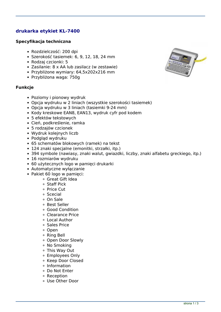 drukarka etykiet KL-7400 Specyfikacja techniczna Rozdzielczość: 200 dpi Szerokość tasiemek: 6, 9, 12, 18, 24 mm Rodzaj czcionki: 5 Zasilanie: 8 x AA lub zasilacz (w zestawie) Przybliżone wymiary: 64,5x202x216 mm Przybliżona waga: 750g Funkcje Poziomy i pionowy wydruk Opcja wydruku w 2 liniach (wszystkie szerokości tasiemek) Opcja wydruku w 3 liniach (tasiemki 9-24 mm) Kody kreskowe EAN8, EAN13, wydruk cyfr pod kodem 5 efektów tekstowych Cień, podkreślenie, ramka 5 rodzajów czcionek Wydruk kolejnych liczb Podgląd wydruku 65 schematów blokowych (ramek) na tekst 124 znaki specjalne (emonitki, strzałki, itp.) 394 symbole (nawiasy, znaki walut, gwiazdki, liczby, znaki alfabetu greckiego, itp.) 16 rozmiarów wydruku 60 użytecznych logo w pamięci drukarki Automatyczne wyłączanie Pakiet 60 logo w pamięci: Great Gift Idea Staff Pick Price Cut Scecial On Sale Best Seller Good Condition Clearance Price Local Author Sales Price Open Ring Bell Open Door Slowly No Smoking This Way Out Employees Only Keep Door Closed Information Do Not Enter Reception Use Other Door strona 1 / 3 Push Pull Private No Visitors Stairway No Pets Allowed Holding Room Storage Area Break Room Urgent Handle With Care This Side Up Fragile Do Not Bend Important Pending Do Not Drop Confidential ProgressReports Do Not Enter No Passage Flammble No Photography No Mobile Phones Do Not Touch Wath Your Head Wath Your Step Smoking Area Keep Clean Wath Your Hands First Aid Kit Safety First Warning! Caution! Danger! Open With Care Fire Extinguisher Out Of Order Do Not Use Loga dostępne w językach: angielski hiszpański niemiecki francuski włoski szwedzki Automatyczny nóż: ucinanie całej etykiety nacinanie w celu łatwiejszego odklejenia Wyświetlacz: strona 2 / 3 4 linie 16 znaków w linii Znaki specjalne dla języków: polski angielski niemiecki francuski włoski hiszpański holenderski fiński czeski portugalski szwedzki duński norweski węgierski Schematy wydruku na: Płytę CD/DVD Kasetę VHS Kasetę mini DV Dyskietkę MD/FD/MO Kasetę magnetofonową Segregator Cena brutto: 366.54 zł Producent: Casio stan na: 07-03-2017r. godz. 14:03:06 więcej informacji strona 3 / 3 Powered by TCPDF (www.tcpdf.org)
