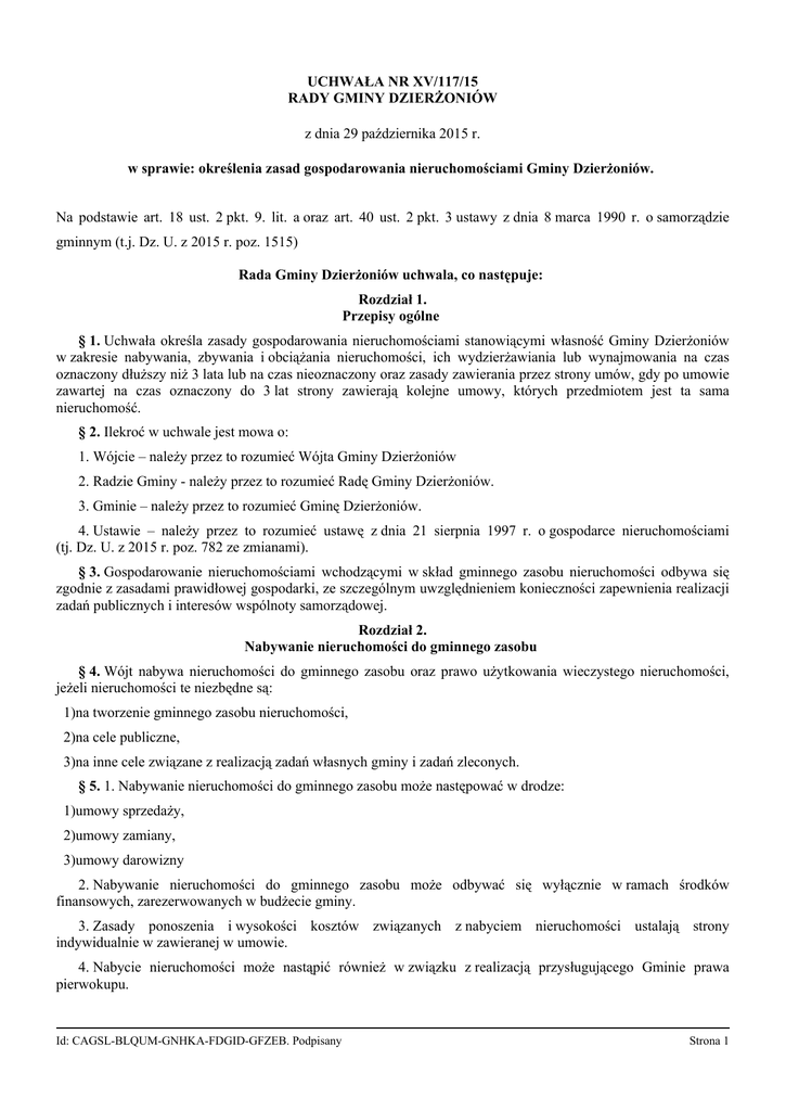 UCHWAŁA NR XV/117/15 RADY GMINY DZIERŻONIÓW z dnia 29 października 2015 r. w sprawie: określenia zasad gospodarowania nieruchomościami Gminy Dzierżoniów. Na podstawie art. 18 ust. 2 pkt. 9. lit. a oraz art. 40 ust. 2 pkt. 3 ustawy z dnia 8 marca 1990 r. o samorządzie gminnym (t.j. Dz. U. z 2015 r. poz. 1515) Rada Gminy Dzierżoniów uchwala, co następuje: Rozdział 1. Przepisy ogólne § 1. Uchwała określa zasady gospodarowania nieruchomościami stanowiącymi własność Gminy Dzierżoniów w zakresie nabywania, zbywania i obciążania nieruchomości, ich wydzierżawiania lub wynajmowania na czas oznaczony dłuższy niż 3 lata lub na czas nieoznaczony oraz zasady zawierania przez strony umów, gdy po umowie zawartej na czas oznaczony do 3 lat strony zawierają kolejne umowy, których przedmiotem jest ta sama nieruchomość. § 2. Ilekroć w uchwale jest mowa o: 1. Wójcie – należy przez to rozumieć Wójta Gminy Dzierżoniów 2. Radzie Gminy - należy przez to rozumieć Radę Gminy Dzierżoniów. 3. Gminie – należy przez to rozumieć Gminę Dzierżoniów. 4. Ustawie – należy przez to rozumieć ustawę z dnia 21 sierpnia 1997 r. o gospodarce nieruchomościami (tj. Dz. U. z 2015 r. poz. 782 ze zmianami). § 3. Gospodarowanie nieruchomościami wchodzącymi w skład gminnego zasobu nieruchomości odbywa się zgodnie z zasadami prawidłowej gospodarki, ze szczególnym uwzględnieniem konieczności zapewnienia realizacji zadań publicznych i interesów wspólnoty samorządowej. Rozdział 2. Nabywanie nieruchomości do gminnego zasobu § 4. Wójt nabywa nieruchomości do gminnego zasobu oraz prawo użytkowania wieczystego nieruchomości, jeżeli nieruchomości te niezbędne są: 1)na tworzenie gminnego zasobu nieruchomości, 2)na cele publiczne, 3)na inne cele związane z realizacją zadań własnych gminy i zadań zleconych. § 5. 1. Nabywanie nieruchomości do gminnego zasobu może następować w drodze: 1)umowy sprzedaży, 2)umowy zamiany, 3)umowy darowizny 2. Nabywanie nieruchomości do gminnego zasobu może odbywać się wyłącznie w ramach środków finansowych, zarezerwowanych w budżecie gminy. 3. Zasady ponoszenia i wysokości kosztów związanych z nabyciem nieruchomości ustalają strony indywidualnie w zawieranej w umowie. 4. Nabycie nieruchomości może nastąpić również w związku z realizacją przysługującego Gminie prawa pierwokupu. Id: CAGSL-BLQUM-GNHKA-FDGID-GFZEB. Podpisany Strona 1 Rozdział 3. Zasady sprzedaży lokali mieszkalnych, użytkowych, ułamkowych części budynków mieszkalnych oraz jednolokalowych budynków mieszkalnych § 6. Wyłącza się ze sprzedaży lokale mieszkalne: 1)w budynkach przeznaczonych do remontu kapitalnego lub rozbiórki, 2)w budynkach, w których przewidywana jest zmiana funkcji, 3)w budynkach niezbędnych do funkcjonowania gminy ( lokale są lub będą wykorzystywane do realizacji celów publicznych), 4)lokale socjalne, 5)których najemcy zalegają z zapłatą należnego czynszu. § 7. 1. Do ceny lokalu, ułamkowej cześci budynku mieszkalnego oraz jednolokalowego budynku mieszkalnego stosuje się następujące bonifikaty z zastrzeżeniem ust. 2 i 3: 1)99% -dla nabywcy, który wpłaci całą kwotę przed podpisaniem umowy notarialnej, 2)95% - dla nabywcy, któremu cena zostanie rozłożona na raty na okres do 3 lat bez oprocentowania, 3)90% - dla nabywcy, któremu cena zostaje rozłożona na raty na okres powyżej 3 lat. 2. W przypadku sprzedaży lokali mieszkalnych, ułamkowych części budynków mieszkalnych oraz jednolokalowych budynków mieszkalnych, w których prowadzone były remonty współfinansowane lub finansowane przez gminę ustalone bonifikaty zgodnie z ust. 1 obniża się o 4%, jeżeli sprzedaż lokalu następuje w okresie do 2 lat od wykonania remontu. 3. W przypadku sprzedaży lokali mieszkalnych, ułamkowych części budynków mieszkalnych oraz jednolokalowych budynków mieszkalnych, w których prowadzona była przebudowa budynku współfinansowana lub finansowana przez gminę ustalone bonifikaty w ust. 1 obniża się następująco: 1)przy wykupie w okresie do 3 lat od zakończenia przebudowy – bonifikatę obniża się o 50%, 2)przy wykupie w okresie od 3 do 5 lat od zakończenia przebudowy – bonifikatę obniża się o 30%, 3)przy wykupie w okresie od 5 do 10 lat od zakończenia przebudowy - bonifikatę obniża się o 10 %. § 8. W przypadku zbywania samodzielnych lokali o innym przeznaczeniu niż mieszkalne, pierwszeństwo w ich nabyciu przyznaje się ich najemcom lub dzierżawcom, których umowy trwają powyżej 3 lat, o ile nie zalegają oni z zapłatą należnego czynszu i innych opłat za lokal. Rozdział 4. Oddawanie w trwały zarząd § 9. Rada Gminy Dzierżoniów wyraża zgodę na udzielanie przez Wójta bonifikat od opłat rocznych ustalonych zgodnie z przepisem art. 83 ust. 2 ustawy o gospodarce nieruchomościami, jeżeli nieruchomość jest oddana w sytuacjach wymienionych w art. 84 ust. 3. Rozdział 5. Obciążanie nieruchomości § 10. Wójt w ramach gospodarowania nieruchomościami ma prawo do obciążania nieruchomości poprzez ustanawianie na nich ograniczonych praw rzeczowych tj. służebności, użytkowania, hipoteki. § 11. 1. Obciążenie nieruchomości służebnością gruntową i służebnością wynagrodzeniem określonym w umowie z zastrzeżeniem ust. 3 i § 11. przesyłu następuje za 2. Wysokość wynagrodzenia, o którym mowa w pkt. 1 nie może być niższa od wartości ustalonej przez rzeczoznawcę. Id: CAGSL-BLQUM-GNHKA-FDGID-GFZEB. Podpisany Strona 2 3. Ustanowienie służebności gruntowej może nastąpić nieodpłatnie: 1)na rzecz właściciela lub użytkownika wieczystego nieruchomości władnącej, w przypadku braku odpowiedniego dostępu do drogi publicznej. 2)na rzecz jednostek Skarbu Państwa lub innych jednostek samorządu terytorialnego. 4. Ustanowienie służebności przesyłu może nastąpić nieodpłatnie na rzecz spółek, w których Gmina posiada udzia