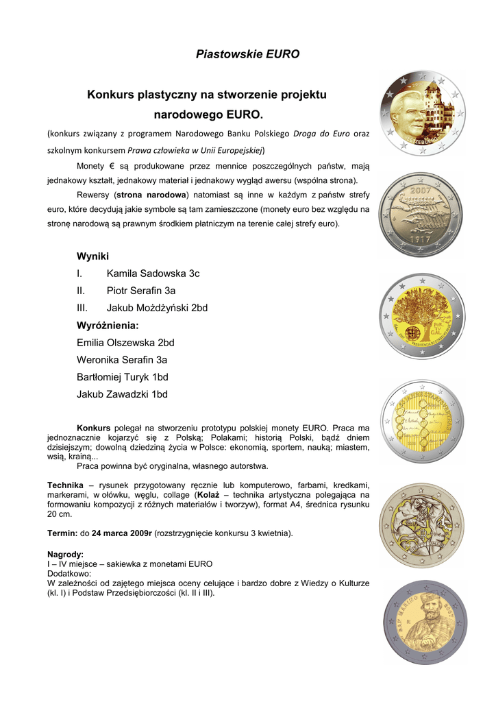 Piastowskie EURO Konkurs plastyczny na stworzenie projektu narodowego EURO. (konkurs związany z programem Narodowego Banku Polskiego Droga do Euro oraz szkolnym konkursem Prawa człowieka w Unii Europejskiej) Monety € są produkowane przez mennice poszczególnych państw, mają jednakowy kształt, jednakowy materiał i jednakowy wygląd awersu (wspólna strona). Rewersy (strona narodowa) natomiast są inne w każdym z państw strefy euro, które decydują jakie symbole są tam zamieszczone (monety euro bez względu na stronę narodową są prawnym środkiem płatniczym na terenie całej strefy euro). Wyniki I. Kamila Sadowska 3c II. Piotr Serafin 3a III. Jakub Możdżyński 2bd Wyróżnienia: Emilia Olszewska 2bd Weronika Serafin 3a Bartłomiej Turyk 1bd Jakub Zawadzki 1bd Konkurs polegał na stworzeniu prototypu polskiej monety EURO. Praca ma jednoznacznie kojarzyć się z Polską; Polakami; historią Polski, bądź dniem dzisiejszym; dowolną dziedziną życia w Polsce: ekonomią, sportem, nauką; miastem, wsią, krainą... Praca powinna być oryginalna, własnego autorstwa. Technika – rysunek przygotowany ręcznie lub komputerowo, farbami, kredkami, markerami, w ołówku, węglu, collage (Kolaż – technika artystyczna polegająca na formowaniu kompozycji z różnych materiałów i tworzyw), format A4, średnica rysunku 20 cm. Termin: do 24 marca 2009r (rozstrzygnięcie konkursu 3 kwietnia). Nagrody: I – IV miejsce – sakiewka z monetami EURO Dodatkowo: W zależności od zajętego miejsca oceny celujące i bardzo dobre z Wiedzy o Kulturze (kl. I) i Podstaw Przedsiębiorczości (kl. II i III).