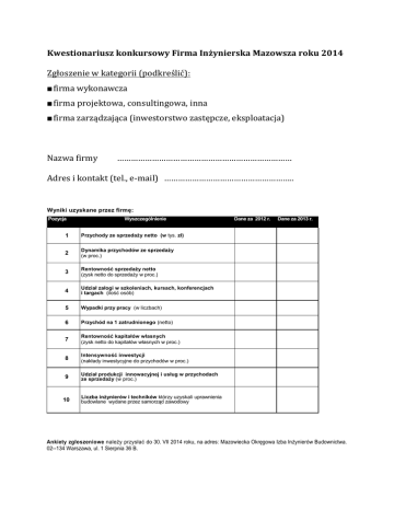 Kwestionariusz konkursowy Firma Inżynierska Mazowsza roku 2014
