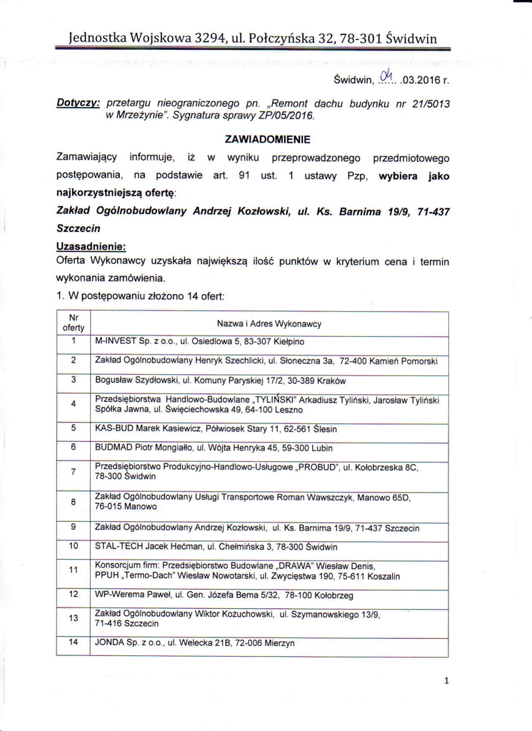 postgpowania,na podstawie art. 91 ust. 1 ustawy Pzp, wybiera jako