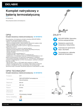 Komplet natryskowy z baterią termostatyczną Nr H9739HYG Dwuuchwytowa bateria termostatyczna OPIS ZALETY Komplet natryskowy z baterią termostatyczną - Nr H9739HYG Dwuuchwytowy, termostatyczny komplet natryskowy SECURITHERM z urządzeniem samoopróżniającym zawiera: • Baterię z antyosadową głowicą termostatyczną: - Ochrona antyoparzeniowa: natychmiastowe zatrzymanie wypływu wody ciepłej w przypadku braku wody zimnej (i na odwrót). - Regulacja temperatury od 25°C do 40°C. Ogranicznik temperatury zablokowany na 38°C. - Głowica ceramiczna ¼ obrotu do regulacji wypływu. - Możliwość przeprowadzenia w łatwy sposób dezynfekcji termicznej. - Wypływ ograniczony do 8 l/min przy 3 barach. - Pokrętła CLASSIC. - Przyłącze do węża natryskowego Z½". - Zintegrowane filtry i zawory zwrotne w przyłączach Z¾". - Dostarczana z 2 mimośrodami ściennymi STOP/OPRÓŻNIANIE Z½" Z¾" idealnie przystosowanymi do ograniczeń występujących w szpitalach. • Chromowaną słuchawkę natryskową Ø119, 1-strumieniową, antyosadową z uchwytem antypoślizgowym (nr 815) i chromowanym, ruchomym uchwytem ściennym (nr 845). • Wąż SILVER L.0,85 m z PVC gładki efekt metaliczny (nr 836T3). • Złączkę antystagnacyjną WZ½" do instalacji między dolnym przyłączem armatury, a przyłączem do węża natryskowego, do automatycznego opróżnienia węża i słuchawki natryskowej (ogranicza rozwój bakterii) (nr 880). SECURITHERM: Optymalna ochrona antyoprzeniowa Nastawiony ogranicznik temperatury maksymalnej Automatyczne opróżnienie węża i słuchawki Termostatyczna: całkowita stabilność temperatury OPIS TECHNICZNY Komplet natryskowy z baterią termostatyczną - Nr H9739HYG Przyłącze Z½² Technologia SECURITHERM Termostatyczna dwuuchwytowa Głębokość 86 mm Długość 281 mm Wypływ 8 l/min Ogranicznik temperatury 38°C Wykończenie Chromowany mosiądz Normy i Certyfikaty Gwarancja © DELABIE http://www.delabie.pl