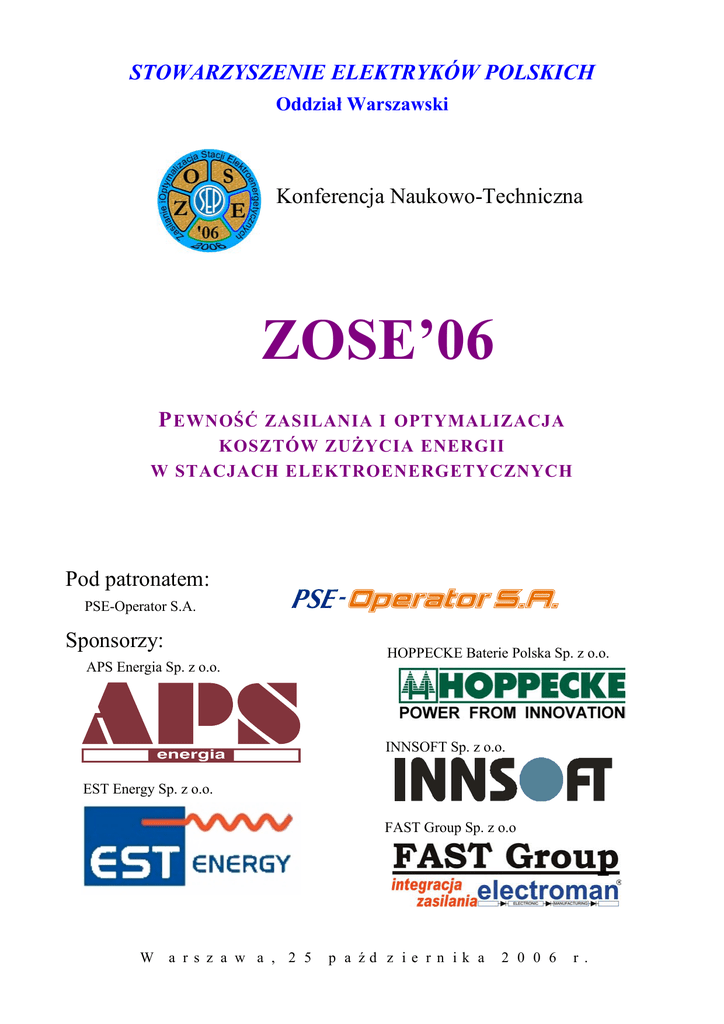 STOWARZYSZENIE ELEKTRYKÓW POLSKICH Oddział Warszawski Konferencja Naukowo-Techniczna ZOSE’06 P EWNOŚĆ ZASILANIA I OPTYMALIZACJA KOSZTÓW ZUŻYCIA ENERGII W STACJACH ELEKTROENERGETYCZNYCH Pod patronatem: PSE-Operator S.A. Sponsorzy: APS Energia Sp. z o.o. HOPPECKE Baterie Polska Sp. z o.o. INNSOFT Sp. z o.o. EST Energy Sp. z o.o. FAST Group Sp. z o.o W a r s z a w a , 2 5 p a źd z ie r n ik a 2 0 0 6 r . ZOSE’06 Komitet Organizacyjny Henryk Gładyś - Przewodniczący Zdzisław Gręda Janusz Hańce Konrad Krupa Mirosława Kujszczyk-Bożentowicz Tadeusz Karwat Andrzej Marusak Jan Syta Spis treści Urządzenia zasilania gwarantowanego Piotr Biczel Racjonalne użytkowanie energii na ogrzewanie, wentylację i klimatyzację budynków w stacjach energoelektrycznych Włodzimierz Rabiega Wymagania oświetleniowe w obiektach elektroenergetycznych na podstawie norm i zaleceń Zbigniew Turlej Optymalne sterowanie chłodzeniem transformatorów systemowych Marceli Kaźmierski, Ivo Pinkiewicz Henryk Gładyś Optymalizacja pracy instalacji sprężonego powietrza (ISP) w stacjach elektroenergetycznych Antoni Hyrczak Audyty energetyczne stacji elektroenergetycznych Henryk Gładyś Pozyskiwanie danych pomiarowych ze stacji elektroenergetycznych jako podstawa optymalizacji kosztów zużycia energii Stanisław Niwiński, Wojciech Ostrowski